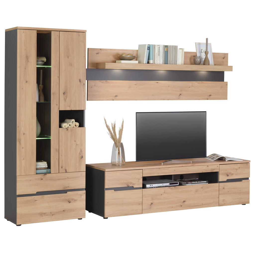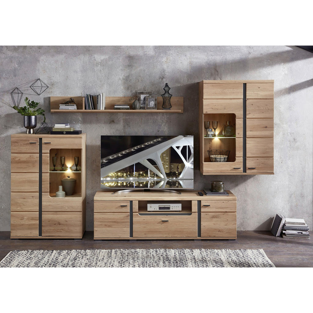 »Naravna« znamka Linea Natura vas bo očarala s kakovostnimi in domačimi zamislimi iz masivnega ali delno masivnega lesa, ki imajo vse prednosti tega materiala – od pozitivnega učinka na klimatske pogoje v prostoru do antistatičnega učinka, zaradi katerega se na pohištvu ne nabira prah. Dnevni regal Linea Natura se s toplino naravnih materialov čudovito poda v vsak dom. Kombinacija pravega jesena in kakovostne iverne plošče v naravnih barvah ustvarja prijeten ambient, ki v prostor vnese občutek topline in elegance. Površina s krtačeno strukturo in dekorativno folijo poudarja naravno lepoto lesa ter zagotavlja dolgotrajno obstojnost. Impresivne dimenzije nudijo obilico prostora za shranjevanje in razstavljanje dekorativnih predmetov. Komplet vključuje TV-element, visečo vitrino, komodo in polico, kar omogoča celovito rešitev za organizacijo dnevnega prostora. S premišljeno zasnovo ponuja dovolj prostora za multimedijske naprave, dekoracijo in