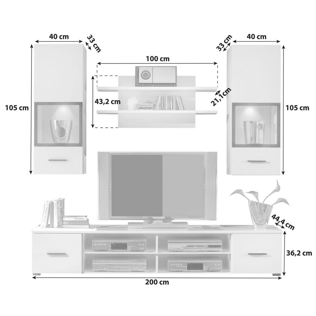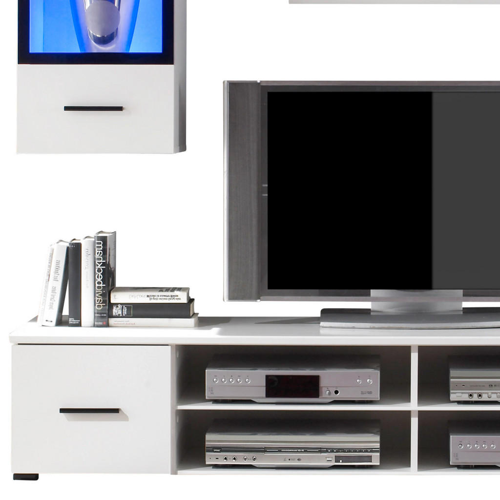 Dnevni regal blagovne znamke Boxxx ponuja preprost in sodoben videz v beli barvi, ki bo osvežil vašo dnevno sobo. Ta komplet vsebuje več funkcionalnih elementov, ki bodo izboljšali organizacijo in videz vašega prostora. Vključuje TV omarico, dve viseči omarici in dve stenski polici. TV omarica meri približno 200 x 36,2 x 44,4 cm, kar nudi odlično platformo za vaš televizor. Štirje odprti predali omogočajo shranjevanje sprejemnikov in DVD-predvajalnikov, medtem ko se knjige in DVD-ji lahko skrijejo v dveh predalih z vrati, kar ohranja urejen videz TV omare. Črni ročaji dodajo eleganten pridih. Nad TV omarico so nameščene stenske police s širino približno 100 cm, globino približno 21,1 cm in višino približno 43,2 cm, kar je idealno za razstavo dekorativnih elementov ali namestitev zvočnega sistema. Dve viseči omarici z vgrajeno modro LED osvetlitvijo prinašata dodatno eleganco in omogočata izpostavljanje kozarcev ali drugih zbirateljskih predmetov. Ta dnevni regal združuje estetiko in funkcionalnost na prefinjen način.