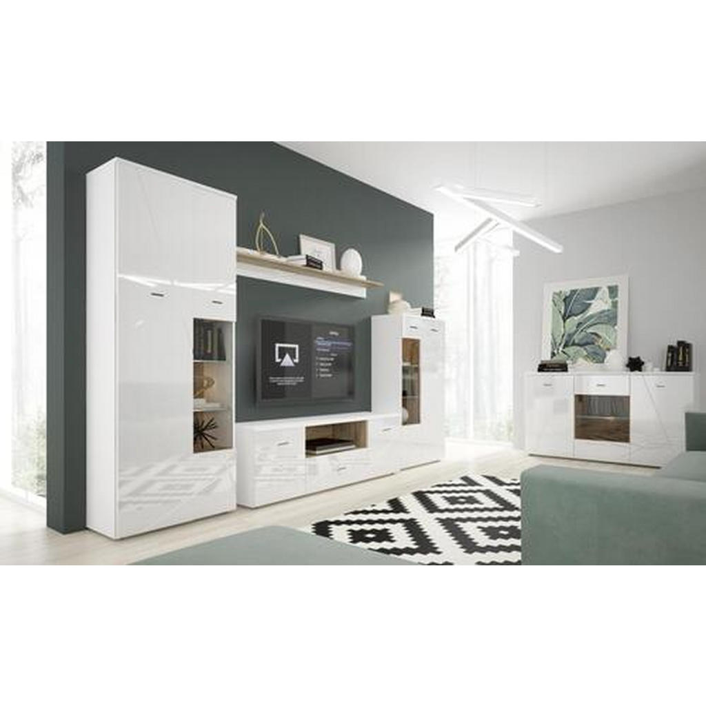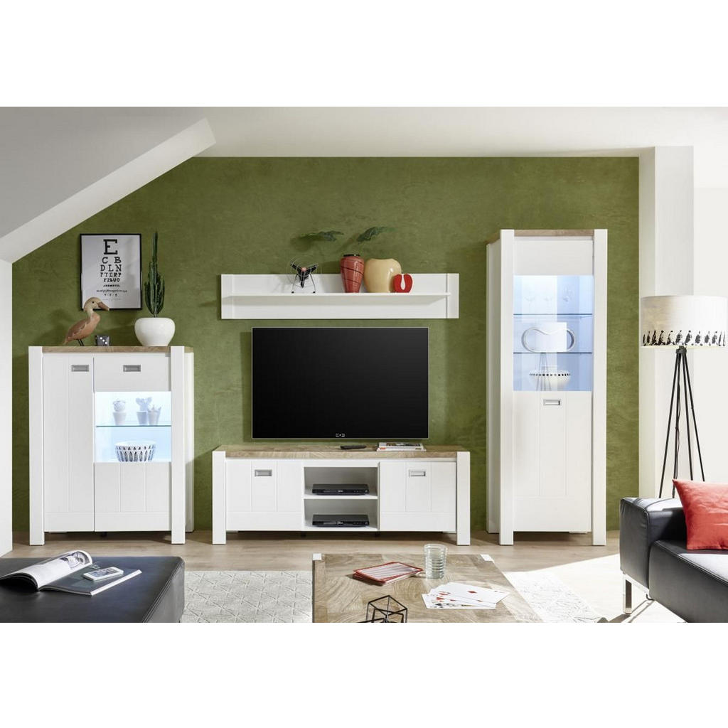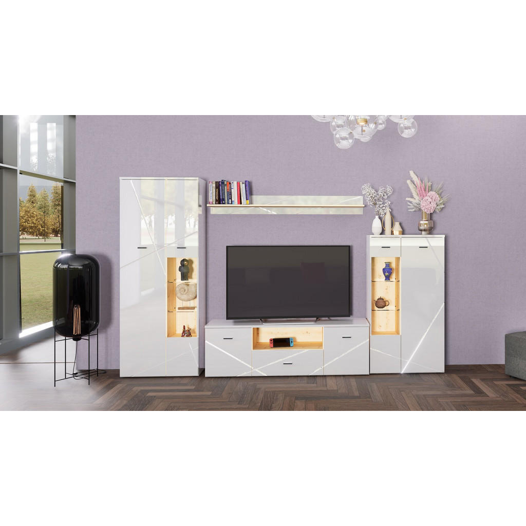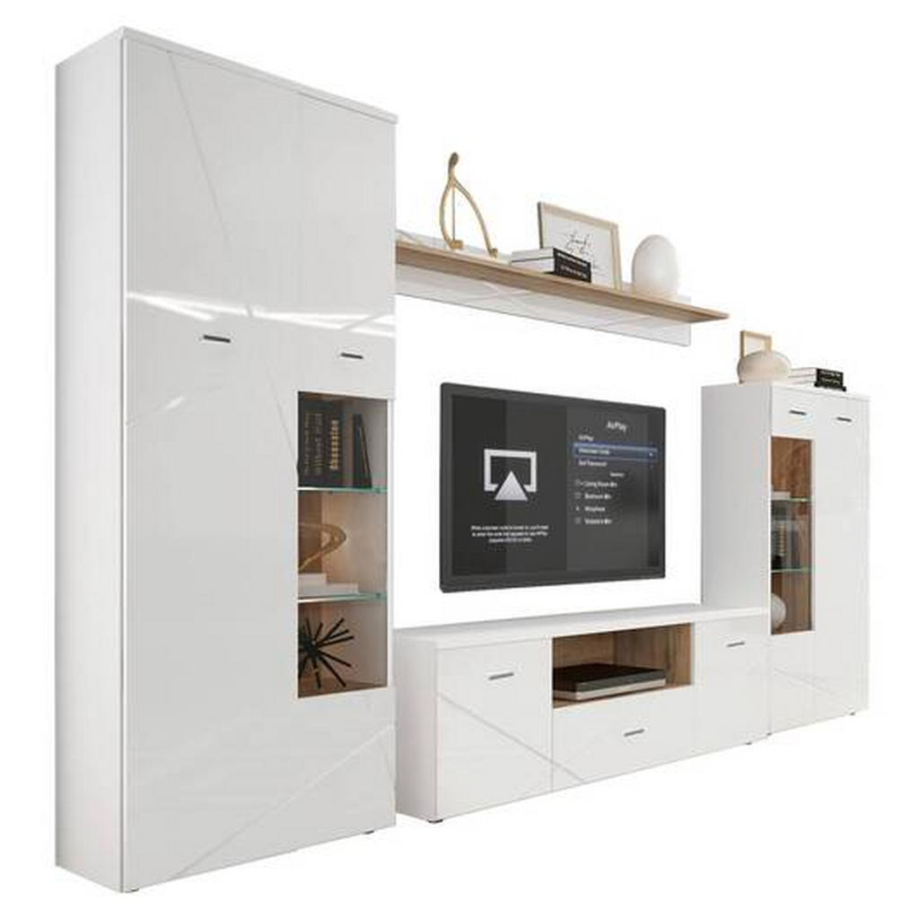 Ste se kdaj vprašali, kaj ustvari pravo toplino in domačnost v dnevni sobi? Je to elegantna komoda, ki skrbi za urejenost? Morda stilska vitrina, v kateri ponosno razstavite svoje najljubše dekoracije? Ali pa skrbno usklajena kombinacija pohištva, barv in materialov? Dnevna soba je srce doma – prostor sprostitve, druženja in nepozabnih trenutkov. Zato naj bo zasnovana tako, da pooseblja praktičnost, udobje in vizualno dovršenost. S premišljeno izbiro pohištva lahko ustvarite prijetno vzdušje, ki odseva vaš osebni slog in v katerem se boste vedno dobro počutili. Dnevni regal Hom’in – popolna kombinacija elegance in stila! 4-delni set Hom’in je sestavljen iz TV-elementa, prostorne omare, vitrine in stenske police. Brezčasna kombinacija bele barve in čudovite imitacije hrasta lepo popestri osrčje vsake dnevne sobe. Klasična zasnova ne zagotavlja le estetskega dopolnila vašemu prostoru, temveč tudi pametno organizacijo shranjevalnega prostora. Izdelan je iz kakovostnih in trpežnih materialov, ki zagotavljajo dolgo življenjsko dobo in odpornost na vsakodnevno uporabo. Površina je enostavna za čiščenje, kar omogoča brezskrbno