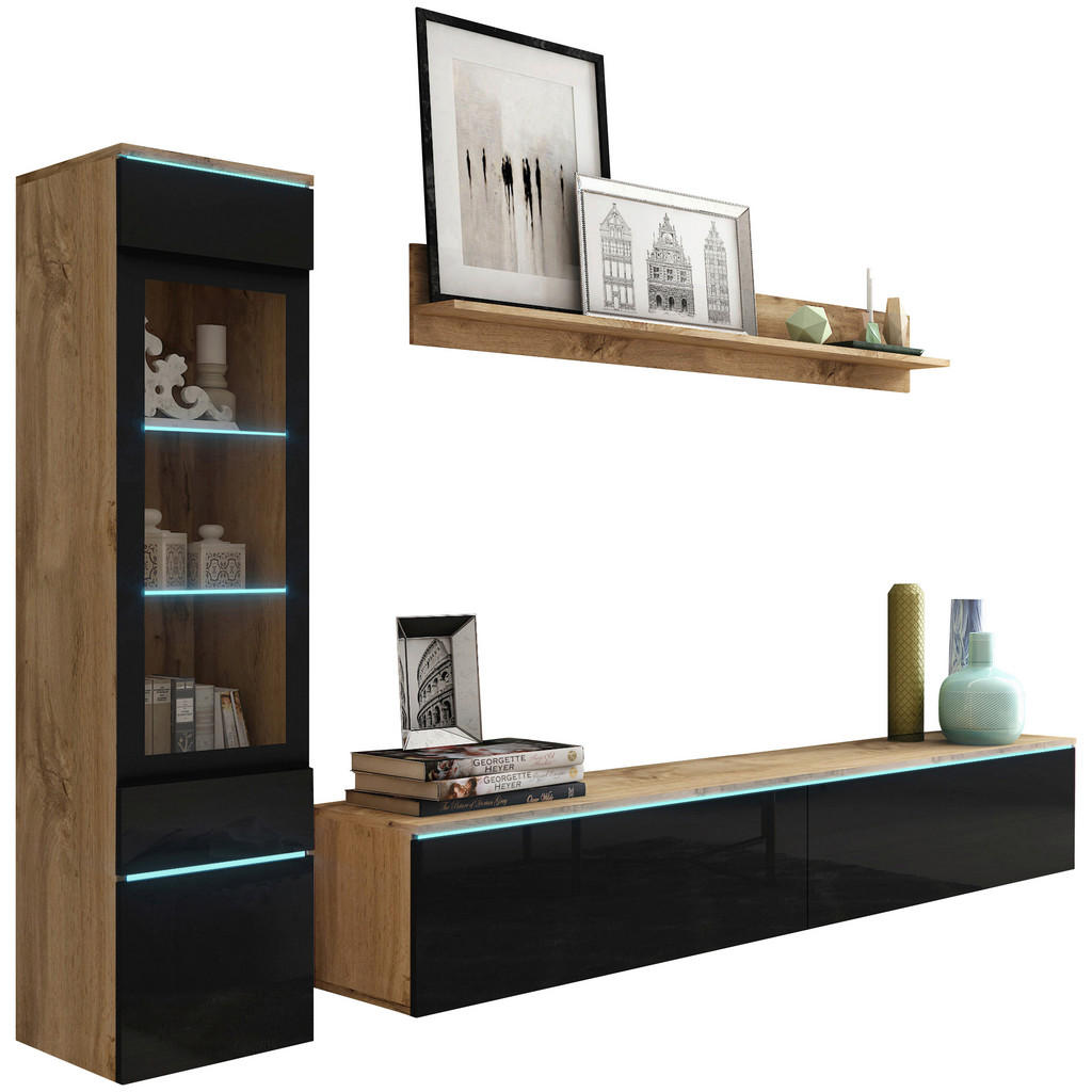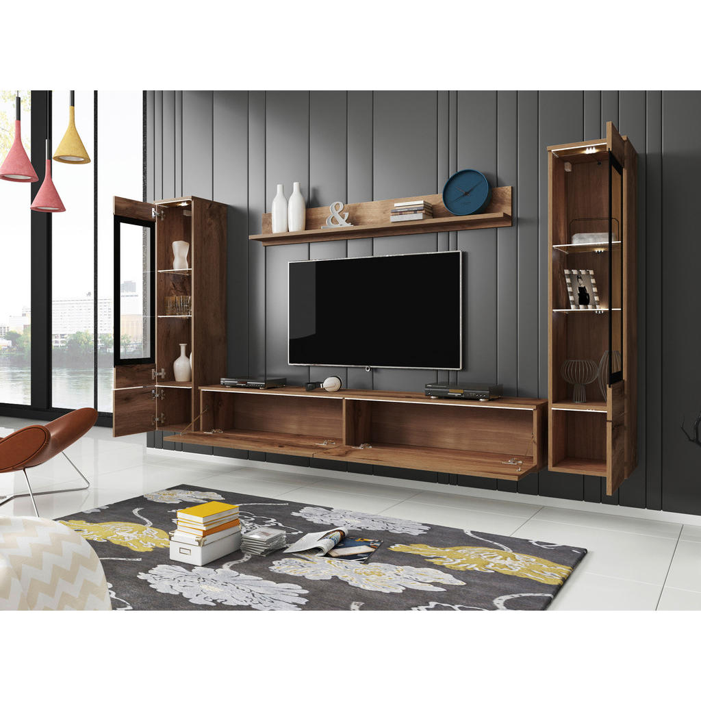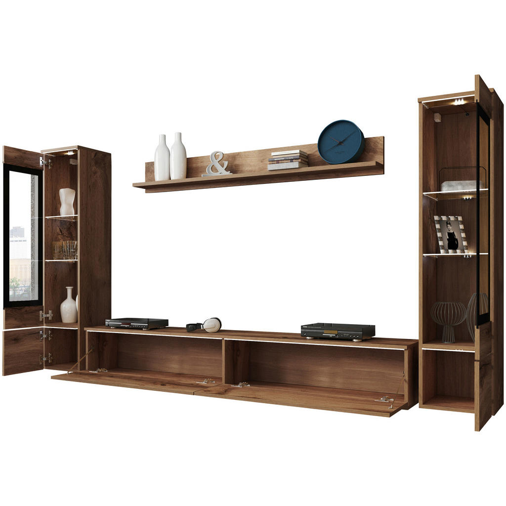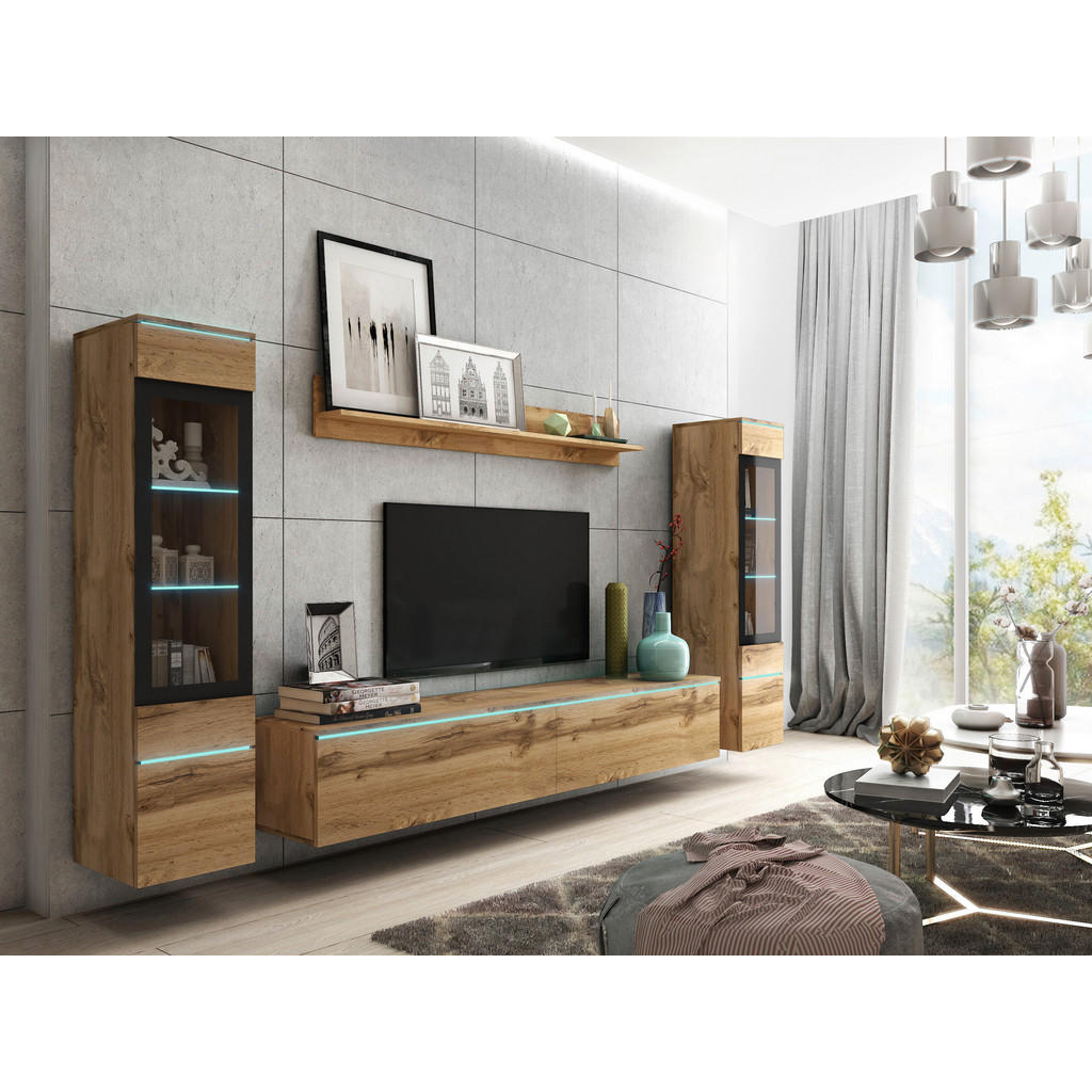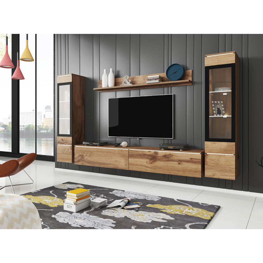 Ste se kdaj vprašali, kaj ustvari pravo toplino in domačnost v dnevni sobi? Je to elegantna komoda, ki skrbi za urejenost? Morda stilska vitrina, v kateri ponosno razstavite svoje najljubše dekoracije? Ali pa skrbno usklajena kombinacija pohištva, barv in materialov? Dnevni regal P & B v barvi hrasta wotan združuje klasičen in moderen videz, ki bo popestril osrčje vaše dnevne sobe. Zasnovan je tako, da ne nudi le estetskega dopolnila vašemu prostoru, ampak tudi pametno organizacijo shranjevanja, kar omogoča optimalno izrabo prostora. Set vsebuje TV element, 2 vitrini in stensko polico. TV element dimenzij 180/30/33 cm zagotavlja prostoren prostor za vašo televizijo, medtem ko 2 vitrini ponujata idealno rešitev za shranjevanje ali razstavljanje dekorativnih predmetov. Stenska polica z dolžino 138,5 cm omogoča, da izkoristite prostor tudi za knjige, okrasne predmete ali rastline. Izdelan je iz kakovostnih in trpežnih materialov, ki zagotavljajo dolgo življenjsko dobo in odpornost na vsakodnevno uporabo. Površina je en