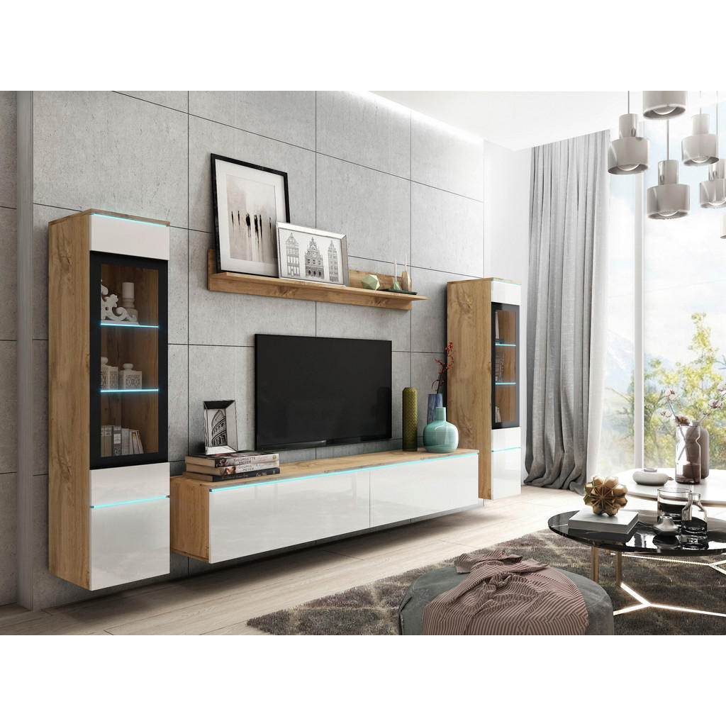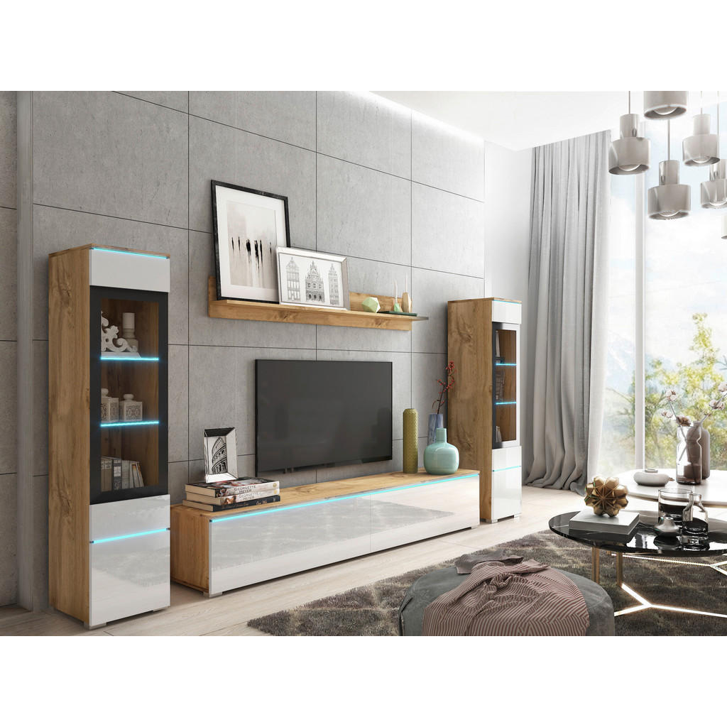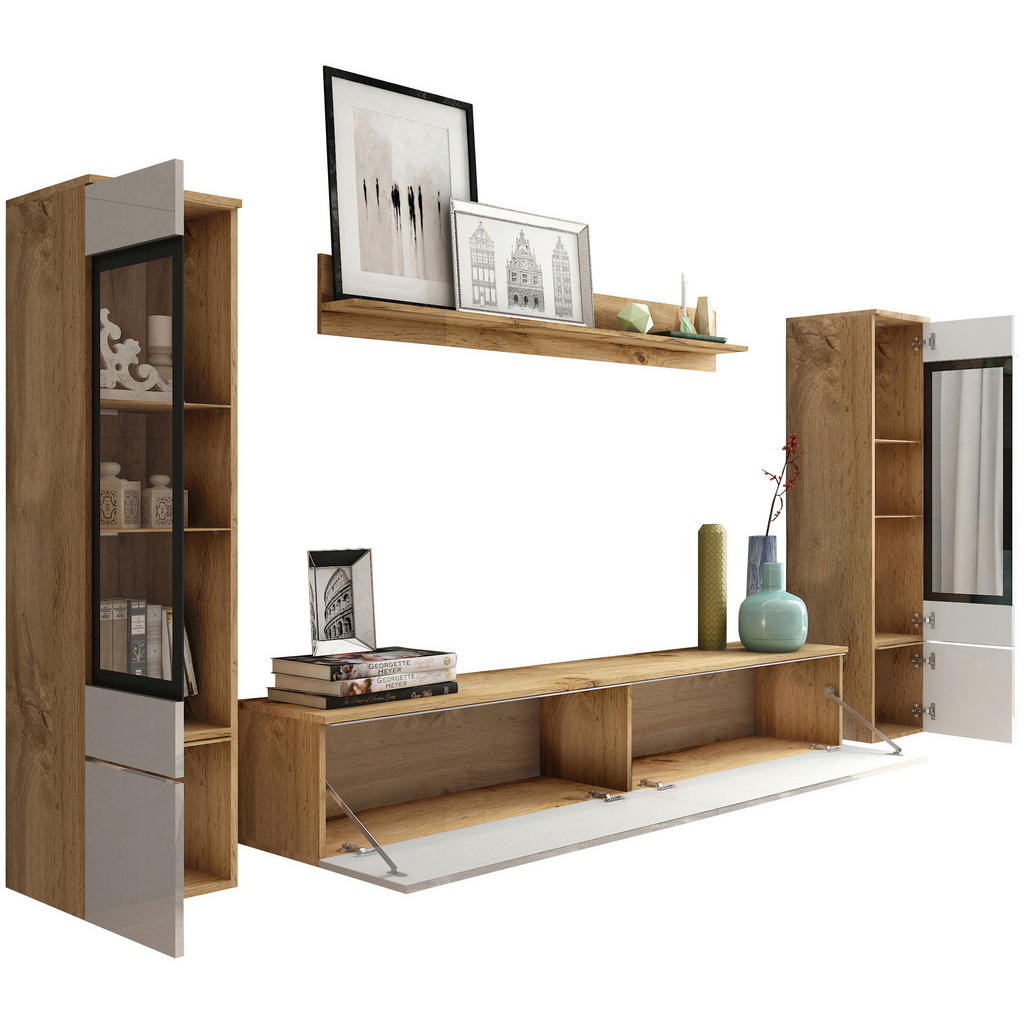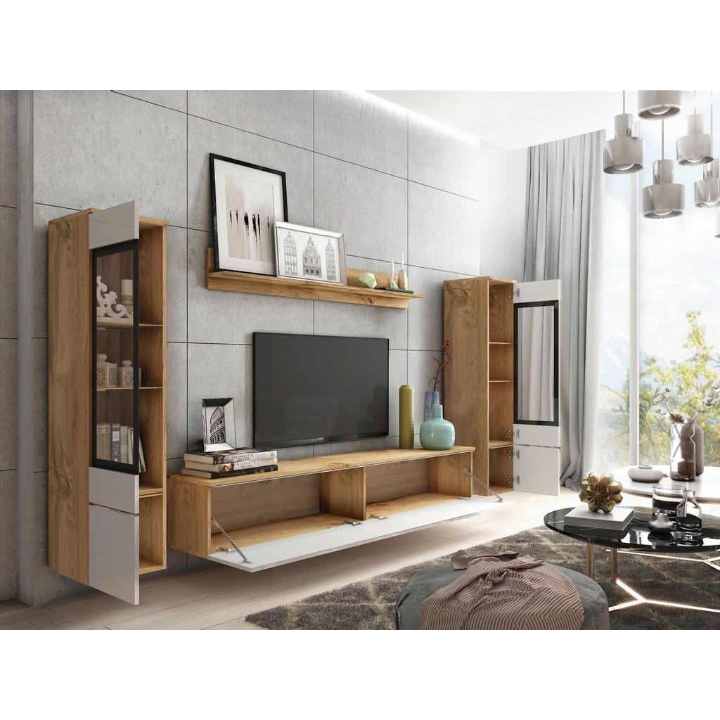 Blagovna znamka P & B nudi širok spekter pohištva za tako rekoč vse notranje prostore (dnevne sobe, spalnice, kuhinje, jedilnice, kopalnice, predsobe itd.). Njihovi izdelki se ponašajo s funkcionalnostjo, estetsko dovršenostjo in raznolikostjo: ker so velikokrat na voljo v različnih barvnih kombinacijah in slogih, bodo zagotovo zadostili potrebam kupcev, tudi tistih najzahtevnejših. Trpežen, funkcionalen dnevnosobni komplet iz kvalitetne imitacije lesa, umetne mase ter kaljenega nezlomljivega stekla je sestavljen iz TV-elementa, stenske police in dveh vitrin. Nudi torej obilnico prostora za shranjevanje najrazličnejših potrebščin ter ima potencial, da postane središče vaše dnevne sobe, k čemur občutno pripomore priložena sijalka. Vtis dopolni dejstvo, da je izdelek na voljo v različnih barvah: gotovo boste našli tisto, ki ustreza vašemu slogu. Ključne prednosti: Viseča zasnova dodatno poudari estetsko dovršenost izdelka, olajša čiščenje tal ter prihrani prostor. Enostavna montaža, ki ne zahteva posebnih spretnosti. Nastavljive police omogočajo fleksibilno in individualizirano organizacijo prostora. Lastnosti: Dimenzije: Širina 240 cm, višina 130 cm, globina 33 cm Barva: Hrast wotan, bela (visoki sijaj), siva Debelina: