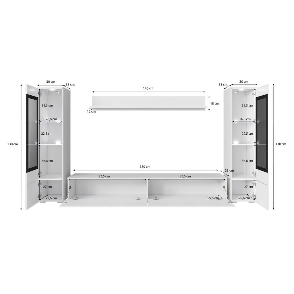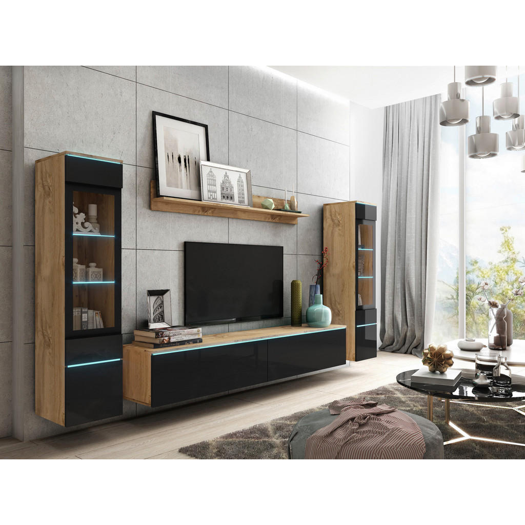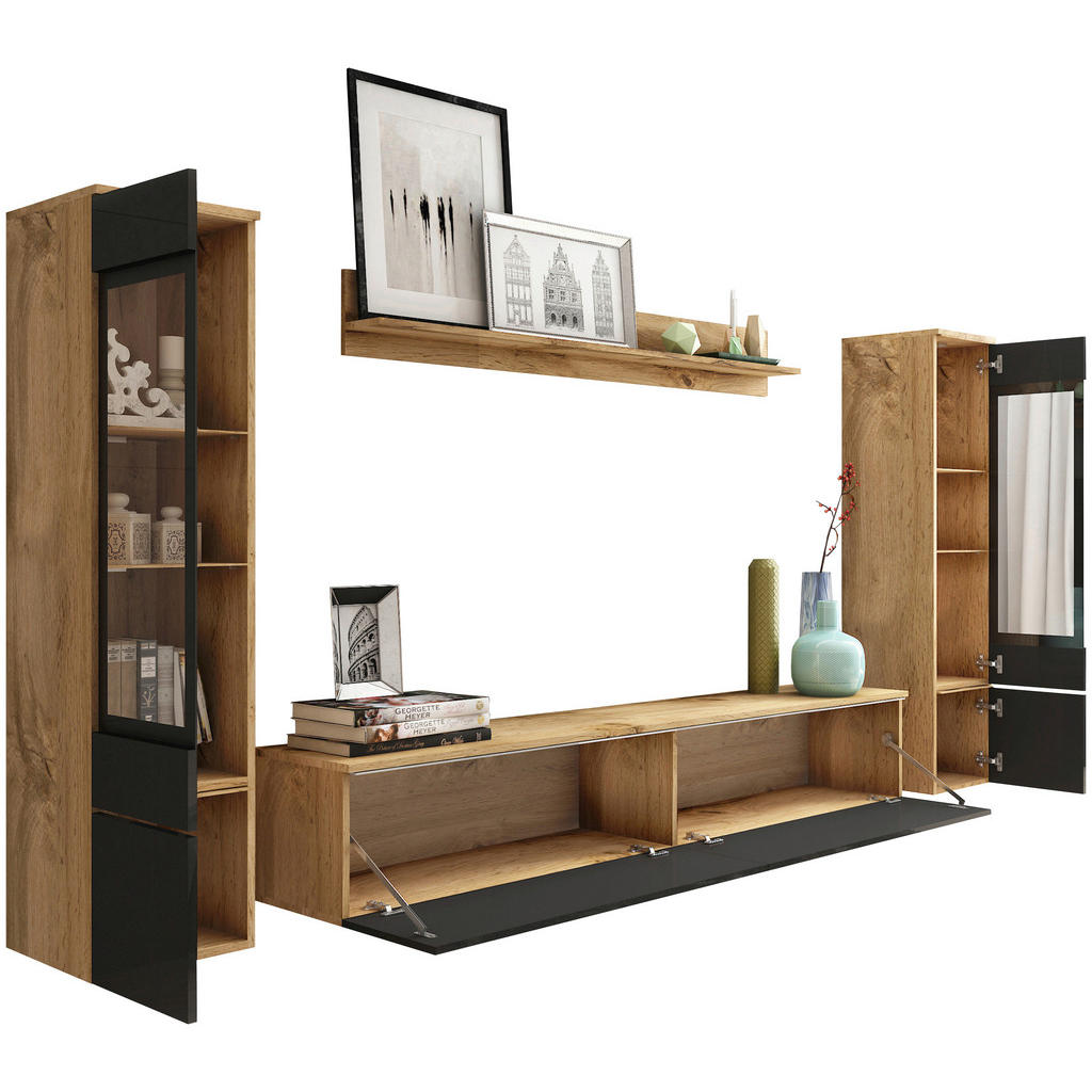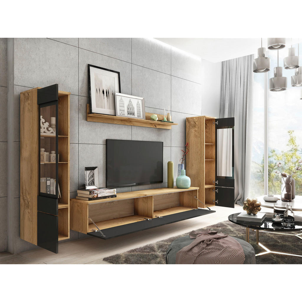 Blagovnaznamka P & B nudi širok spekter pohištva za tako rekočvse notranje prostore (dnevne sobe, spalnice, kuhinje, jedilnice,kopalnice, predsobe itd.). Njihovi izdelki se ponašajo sfunkcionalnostjo, estetsko dovršenostjo in raznolikostjo: ker sovelikokrat na voljo v različnih barvnih kombinacijah in slogih, bodozagotovo zadostili potrebam kupcev, tudi tistih najzahtevnejših. Trpežen, funkcionalen dnevnosobni komplet iz Kvalitetne imitacije lesa, umetne mase ter kaljenega nezlomljivega stekla je sestavljen iz TV-elementa, stenske police in dveh vitrin. Nudi torej obilnico prostora za shranjevanje najrazličnejših potrebščin ter ima potencial, da postane središče vaše dnevne sobe, k čemur občutno pripomore priložena sijalka. Vtis dopolni dejstvo, da je izdelek na voljo v različnih barvah: gotovo boste našli tisto, ki ustreza vašemu slogu. Ključne prednosti: Viseča zasnova dodatno poudari estetsko dovršenost izdelka, olajša čiščenje tal ter prihrani prostor. Enostavna montaža, ki ne zahteva posebnih spretnosti. Nastavljive police omogočajo fleksibilno in individualizirano organizacijo prostora. Lastnosti: Dimenzije: Širina 240 cm, višina 130 cm, globina 33 cm Barva: Hrast wotan, črna (visoki sijaj), siva Debelina: Pribl. 15 mm Materiali: Imitacija lesa (iverna plošča), nezdrobljivo kaljeno steklo, umetna masa Površina: Prevlečeno z melaninsko smolo, proz