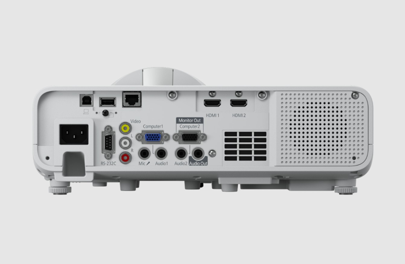 – Priključki: USB 2.0, USB 2.0 vrste B (samo za servisiranje), RS-232C, Ethernet (1000 Base-T/ 100-Base TX/ 10-Base-T), brezžično LAN IEEE 802.11a/b/g/n/ac (Wi-Fi 5), Wi-Fi Direct, VGA (2x), HDMI (2x), Miracast, izklop vtiča, priključitev vtiča (2x), vhod za mikrofon