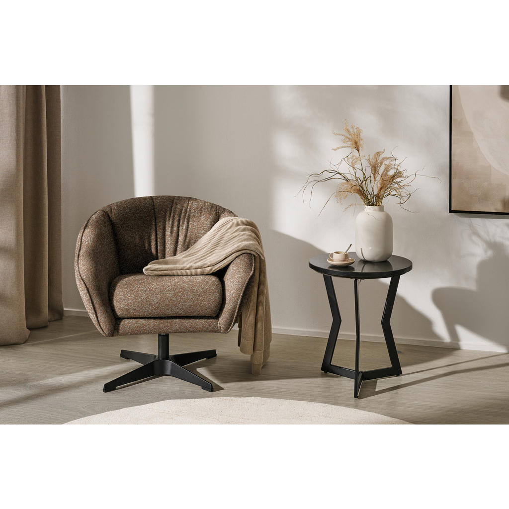Durch diesen STYLIFE Sessel in Rotbraun machen Sie das Wohnzimmer zum einladenden Relaxraum. Das Wichtigste im Überblick: B x H x T: ca. 80 x 78 x 80 cm Sitzfläche: ca. 48 x 54 cm (B x T), Sitzhöhe: ca. 48 cm maximale Belastbarkeit: ca. 100 kg Fußhöhe: ca. 26 cm Armlehnen: ca. 13 x 52/72 cm (B x H) Spürbare Qualitäten Aus Synthetikfaser (ca. 100 % Polyester) gefertigt ist der Bezug widerstandsfähig und die Bouclé-Oberfläche fühlt sich gewollt unregelmäßig an. Zudem zählen eine nur geringe Pillingbildung sowie eine gute Lichtechtheit zu den Vorzügen des Materials. Der echt bezogene Rücken gestattet das mittige Positionieren der Sitzgelegenheit im Raum. Eine bequeme Schaumstoff-Polsterung unterstützt den Körper und führt Komfort herbei. Dieses Design kann sich sehen lassen Ein Blickfang in verschiedenen Einrichtungsstilen ist das gedeckte Kolorit in Rotbraun. Das Drehkreuz aus Metall in Schwarz ermöglicht Bewegungsfreiheit und komplettiert adäquat das Design. Im Lieferumfang enthalten: Drehfunktion echt bezogener Rücken Verwöhnen Sie sich selbst mit diesem rotbraunen Sessel mit Bouclé-Bezug! Informationen zu separat bestellbarem Equipment oder weiteren verfügbaren Varianten finden Sie in den Produktdetails unter ‘Produktvorteile/Besonderheiten’. Gerne können Sie sich diesbezüglich auch über das Kontaktformular direkt an uns wenden.