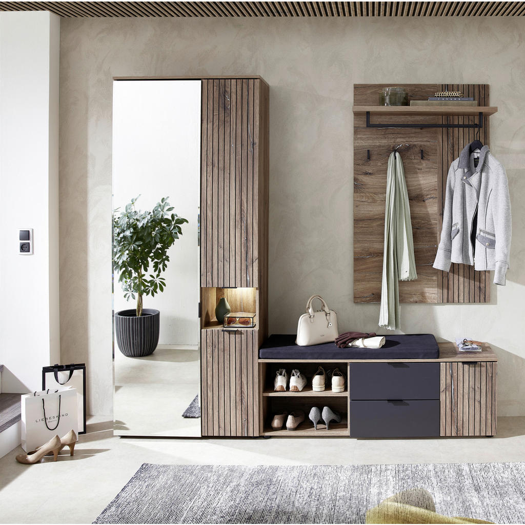 Garderobna omara blagovne znamke MID.YOU združuje funkcionalnost s trendovskim dizajnom. Kombinacija bele barve in barve hrasta ustvarja moderen videz, ki se lepo vključuje v različne dekorativne sloge. Posebnost te omare je njen del v barvi hrasta, ki je oblikovan s sodobnimi vertikalnimi lamelami, ki ustvarjajo eleganten vzorec. Na sredini tega dela je tudi kvadratek, ki je osvetljen s sodobno LED osvetlitvijo, kar dodaja omari še večji šarm. Omara zagotavlja veliko notranjega prostora za shranjevanje oblačil, obutve in drugih predmetov. V notranjosti so police in obešalnik za urejeno shranjevanje. Ta garderobna omara je odlična izbira za tiste, ki iščejo funkcionalno in privlačno pohištvo za svojo predsobo. Dimenzija: 82x204x38 cm