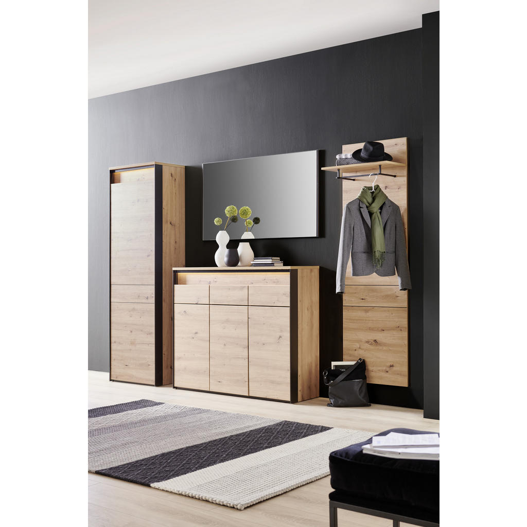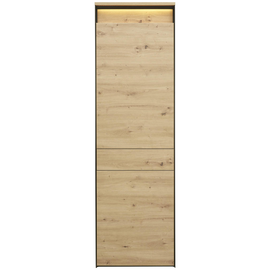 Tudipredsoba je zelo pomemben prostor vašega stanovanja, zato naj bostilsko in dovršeno urejena. Predsoba je prvi prostor v katerega stopijotudi gostje – ustvarijo si prvi vtis o nas, o našem okusu, stilu inurejenosti. Izberite kakovostno pohištvo, dodatke in dekoracijo, ki bodoizdelani v vašem najljubšem dizajnu. Če želite vašo predsobo opremiti s posebnim pohištvenim kosom, bo prostorna garderobna omara znamke Voleo,popolna izbira! Vnjej boste lahko shranili oblačila in dodatke, ki bodo od sedaj naprej vedno urejeni in organizirani. Omara se bo s svojo dovršeno oblikovanostjo čudovito podala v vsako predsobo. Vstavki v črni barvi s kombinacijo barve Artisan hrasta, dodajo občutek domačnosti.Omara je izkakovostnih materialov. LED osvetlitev bo ustvarila prijetno vzdušje! Najlepše se bo ujela s preostalim pohištvom iz enake kolekcije. Ustvarite sanjsko predsobo! Dimenzija: 60x200x38 cm