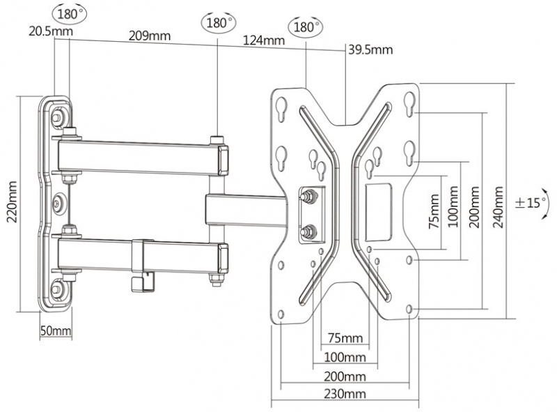 Zasnova držala je preizkušena za TVje do 42 “diagonale in teže do 30 kg.Tehnične lastnosti: – za diagonalo od 24˝ (62cm) do 43” (109cm)