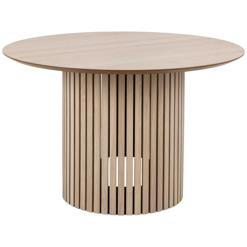 Iščete dizajnersko jedilno mizo, ki bo v vaš prostor vnesla toplino lesa, brezčasno eleganco in pridih nordijskega minimalizma? Jedilna miza je prava izbira za vse, ki prisegajo na kakovost, estetiko in funkcionalnost. Njena okrogla oblika s premerom 120 cm omogoča prijetno interakcijo in povezovanje med osebami za mizo, zato je idealna za družinska kosila ali sproščene večerje s prijatelji. Izdelana je iz kakovostnega furnirja pravega hrastovega lesa, obdelanega z belim oljem, ki poudarja naravno strukturo lesa in obenem ščiti površino. Osrednji poudarek mize je njeno edinstveno stebričasto podnožje z lamelno fronto, ki združuje trdnost in vrhunski dizajn. Kombinacija naravne elegance in sodobne izvedbe omogoča, da se miza odlično poda tako v klasično kot tudi moderno opremljene jedilnice. Montaža je enostavna, vzdrževanje pa preprosto – suho brisanje zadošča, da ostane miza dolgo kot nova. Ključne prednosti: Elegantna okrogla oblika (Ø120 cm) za prijetno druženje in pogovore brez ovir. Furnir iz pravega hrastovega lesa, obdelan z belim oljem – naraven videz in zaščita v enem.