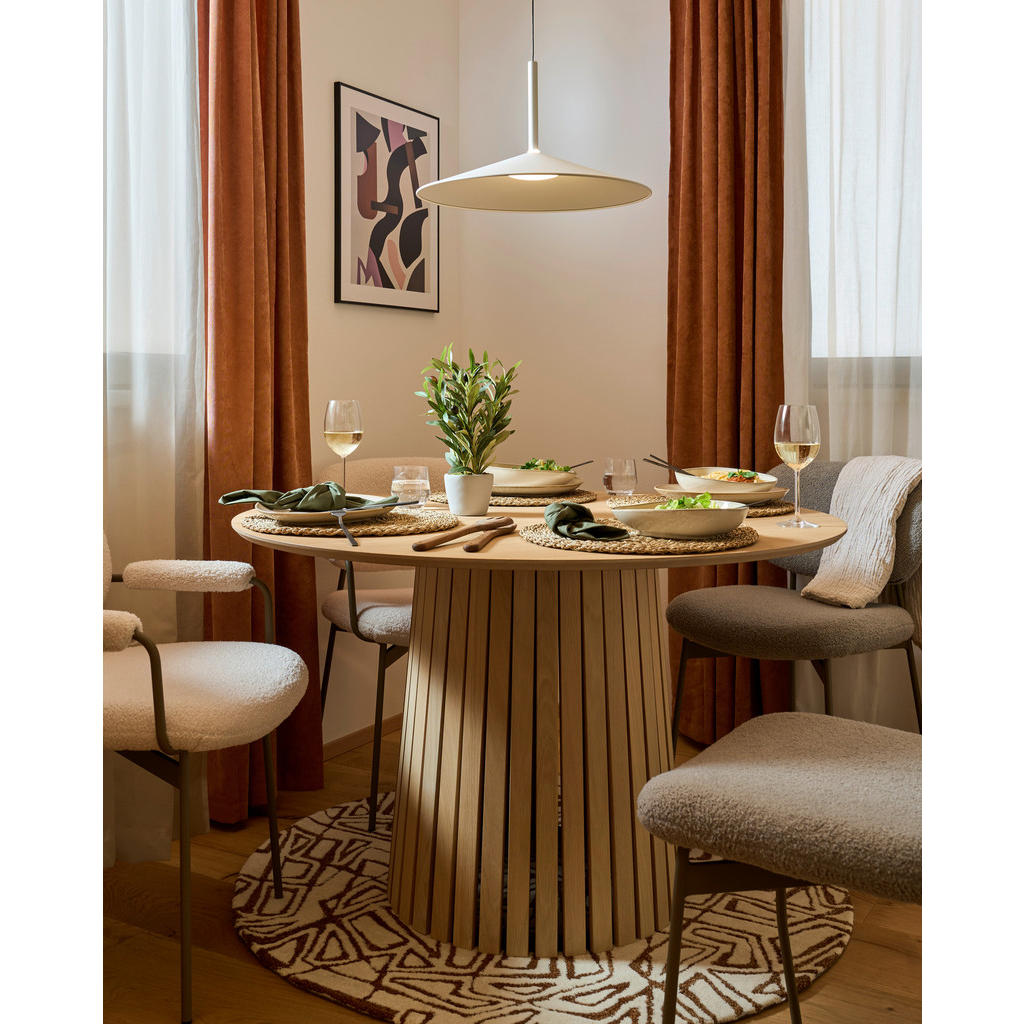 Jedilna miza je popolna izbira za vse, ki cenite prefinjenost in naravno lepoto lesa v sodobnem dizajnu. Izdelana iz kakovostnega furniranega hrasta, ki je pigmentiran in ročno oljen, ta miza prinaša v vaš dom občutek topline in svežine. Njena elegantna okrogla oblika premera 120 cm vabi k druženju in pristnim trenutkom ob obroku, medtem ko minimalistična stebričasta noga dodaja moderen in čist videz. Miza je praktična in hkrati estetsko dovršena, primerna za različne prostore in stile pohištva. Zaradi svoje trdne in stabilne konstrukcije omogoča obremenitev do 100 kg, zato je zanesljiva za vsakodnevno uporabo. Enostavna montaža in možnost izbire različnih velikosti ter vrst lesa omogočata prilagoditev vašim željam in potrebam. Ključne prednosti: Naravni materiali: furnirani hrast z ročno pigmentiranim oljenjem za trajno lepoto in zaščito Elegantna okrogla oblika: premer 120 cm omogoča prijetno druženje za do 4 osebe Stabilna zasnova: ena osrednja okrogla noga, ki zagotavlja dovolj prostora za noge in stabilnost