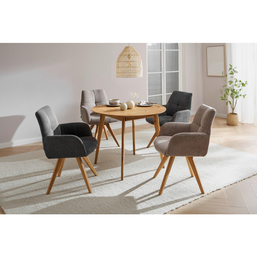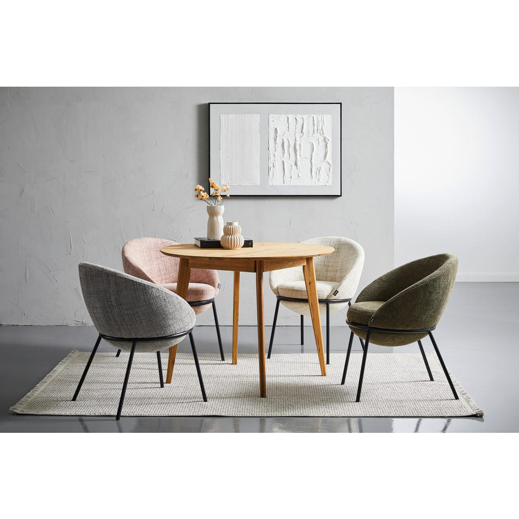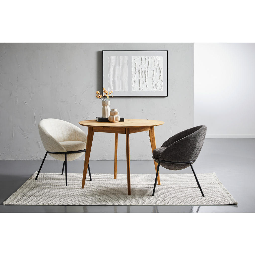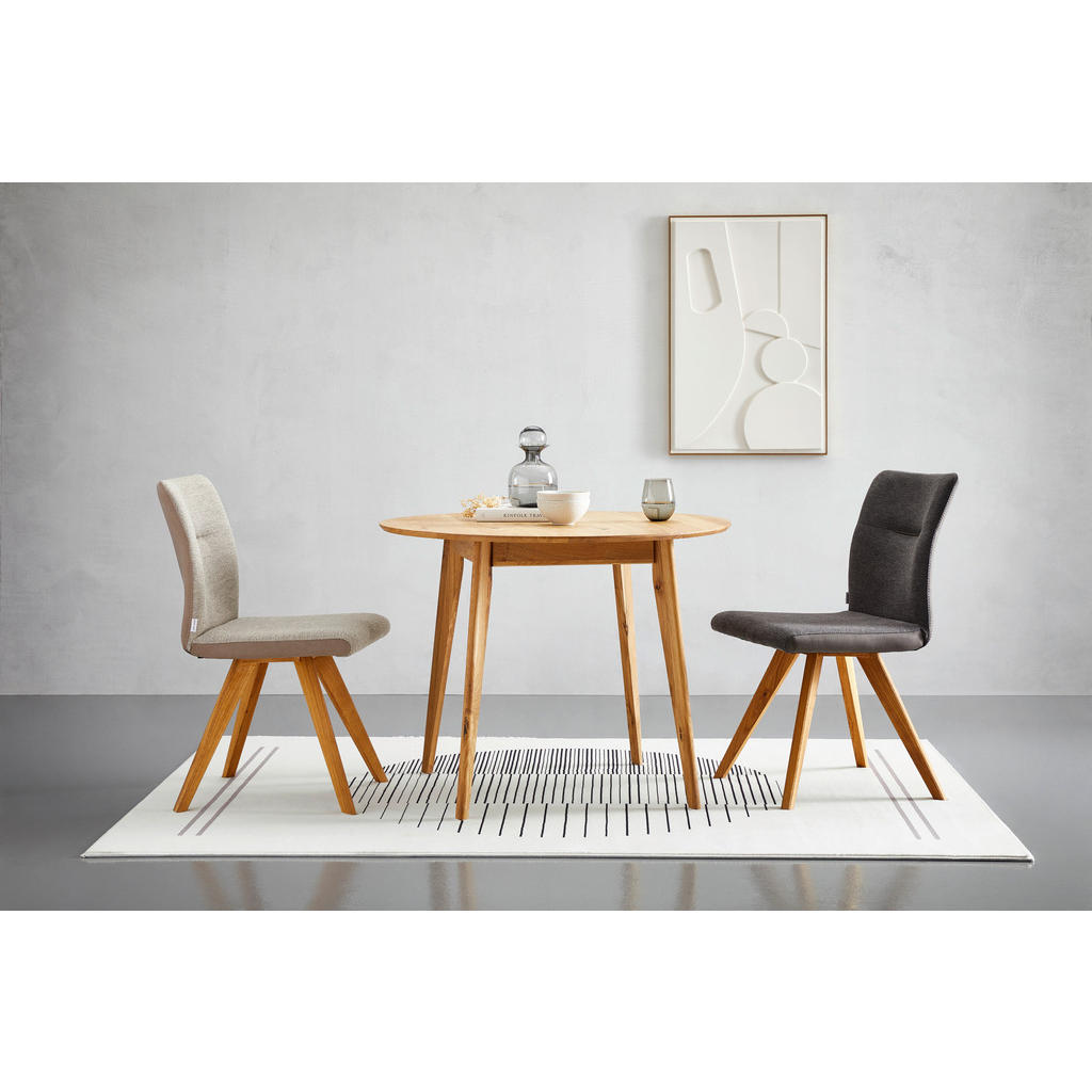 Če si želite naraven, brezčasen kos pohištva, ki prinaša toplino in značaj v vaš dom, potem je jedilna miza popolna izbira. Izdelana je iz masivnega divjega hrasta, znanega po svoji robustnosti in izraziti teksturi, kar pomeni, da bo vsak kos edinstven. Njena oljena površina poudari naravno lepoto lesa in ga hkrati ščiti pred vsakodnevnimi obremenitvami. Miza s premerom 100 cm je idealna za manjše jedilnice, kuhinje ali jedilne kote, kjer želite ohraniti zračen in svetel prostor. Z zaobljeno obliko ustvarja občutek enakopravnosti in povezanosti med vsemi, ki sedijo okoli nje. Elegantne, stožčaste noge iz enakega lesa prispevajo k stabilnosti in hkrati dajo mizi pridih skandinavskega minimalizma. Ključne prednosti: Masiven divji hrast – visoka kakovost, dolga življenjska doba. Naravno oljen zaključek – ohranja otipljiv občutek pravega lesa in zagotavlja zaščito. Kompaktna, okrogla oblika s premerom 100 cm – idealna za manjše prostore.