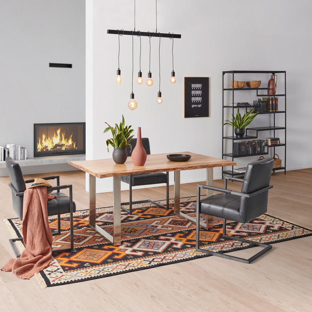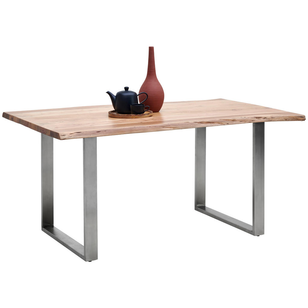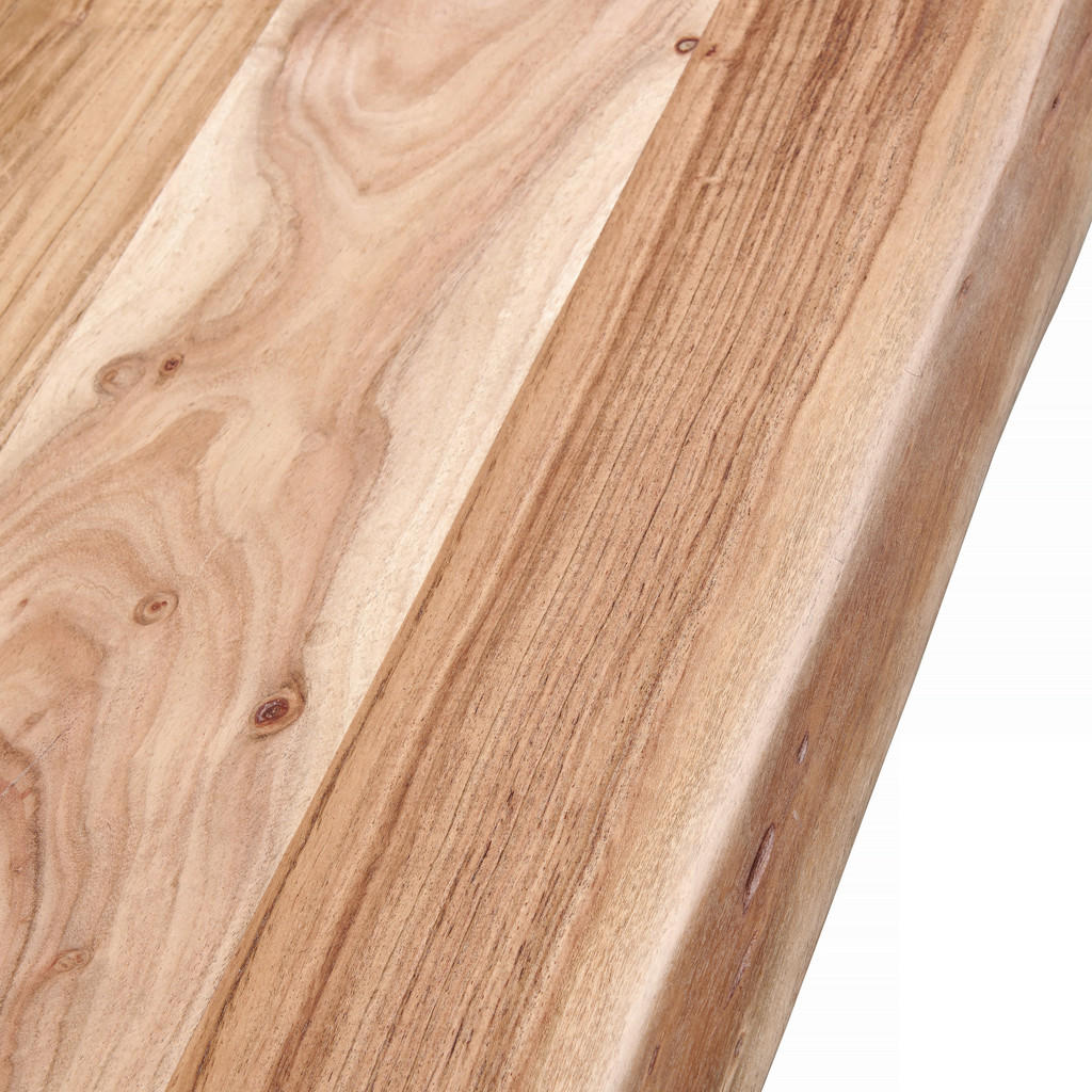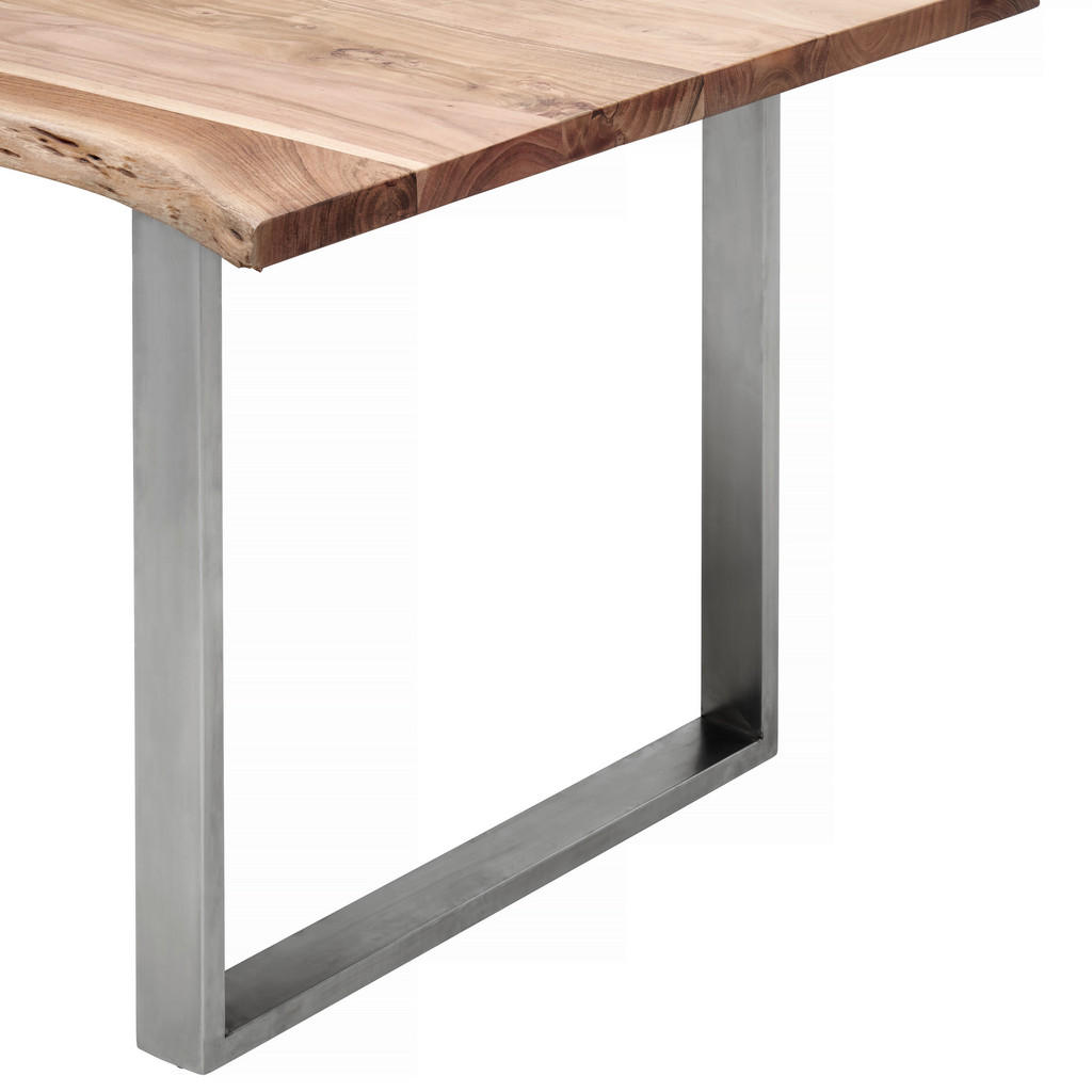Jedilna miza MID.YOU – brezčasen naravni videz z močnim karakterjem. Ta izjemna miza navdušuje z masivno ploščo iz pristnega akacijevega lesa, ki s svojo naravno strukturo in unikatno drevesno obrobo (t. i. “live edge”) v vsak prostor vnese toplino in pristnost. Površina je lakirana in dodatno obdelana, da ohrani avtentičen videz lesa, obenem pa jo ščiti pred obrabo. Masiven les iz Indije je znan po trpežnosti in značilnem vzorcu, zato je vsaka miza unikat. Kovinska U-oblika nog iz krtačenega nerjavečega jekla doda moderen, industrijski pridih in zagotavlja stabilnost. Miza je primerna za 6 oseb in predstavlja popolno ravnovesje med naravnim slogom in sodobnim dizajnom. Zaradi čvrste konstrukcije in robu debeline kar 35 mm je idealna izbira za vse, ki cenijo kakovost in estetiko. Ključne prednosti: Masivna plošča iz akacijevega lesa z unikatno naravno drevesno obrobo Kovinske noge v U-oblikovanju iz krtačenega nerjavečega jekla za moderen videz