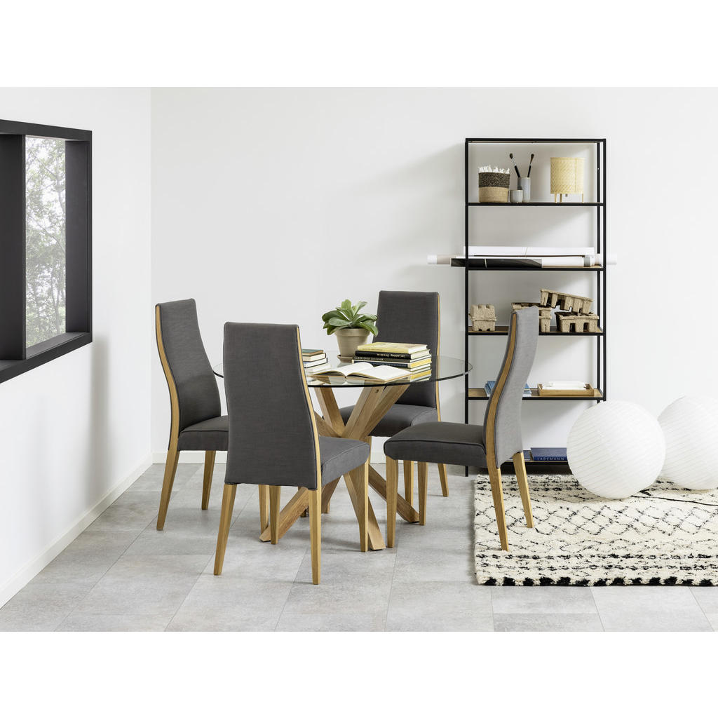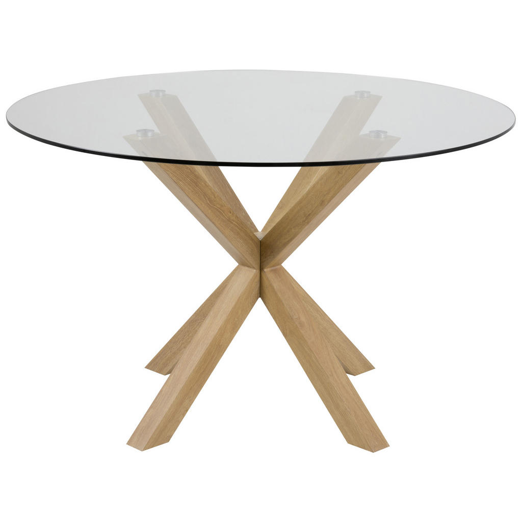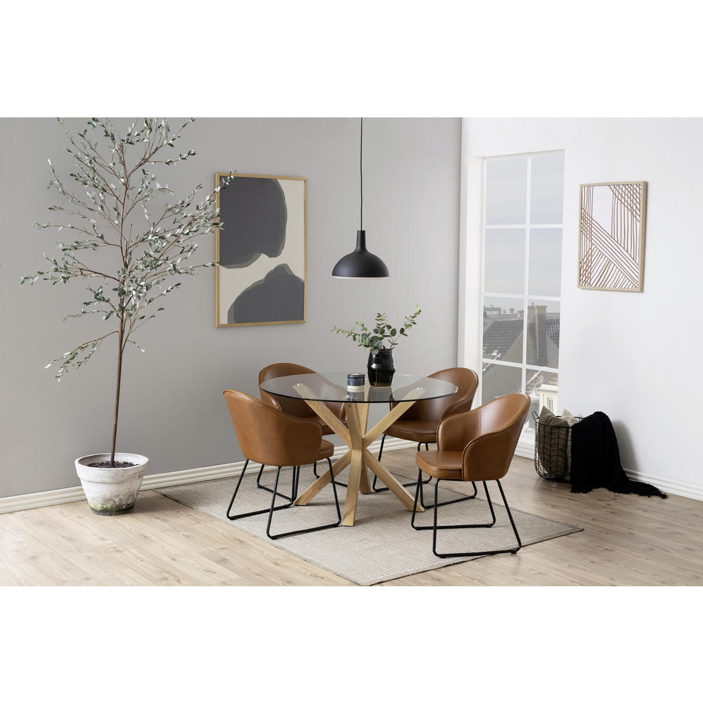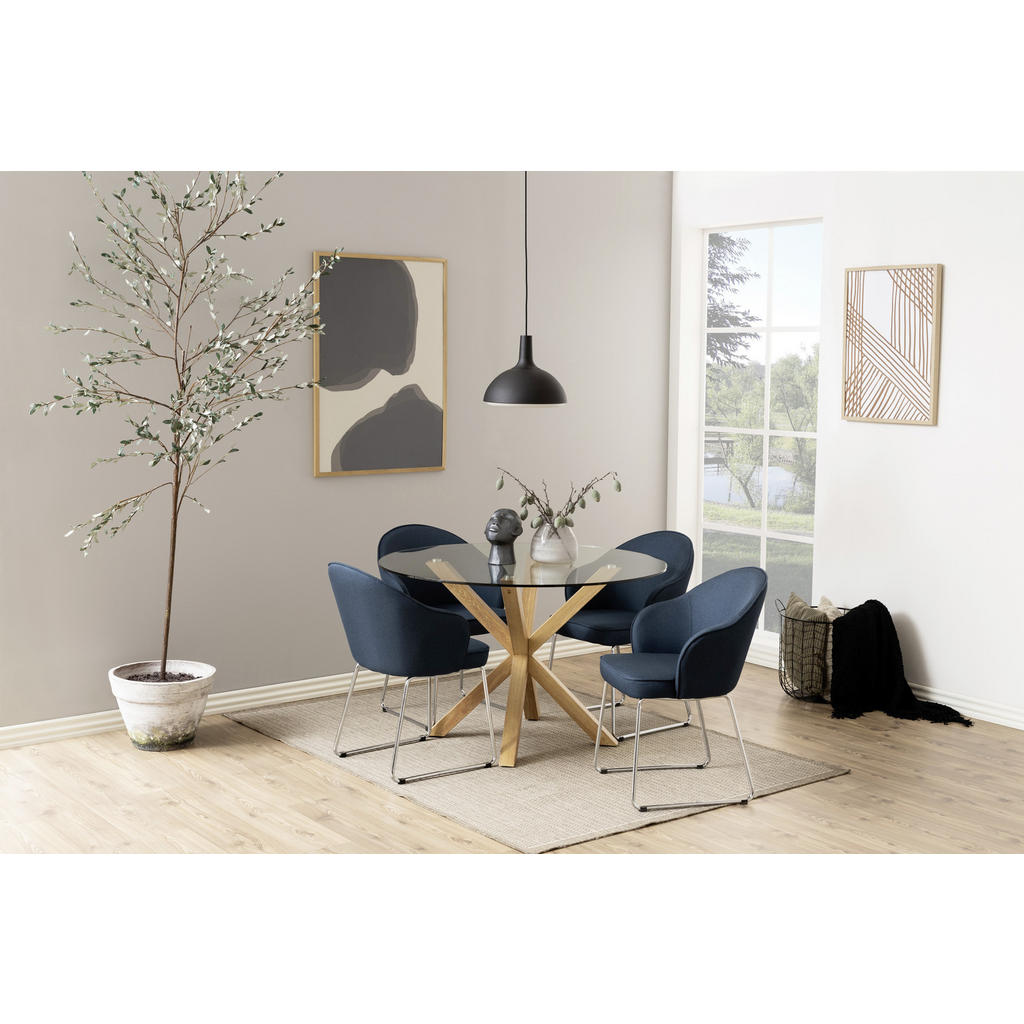 Blagovna znamka Mid.You obsega širok spekter pohištva, dodatkov za pohištvo in tekstila. Naj gre za dnevno sobo, otroško sobo, spalnico ali jedilnico, prav gotovo boste našli izdelke, ki so zelo estetsko dovršeni, a zato nič manj funkcionalni. Slogan “Sredi vašega doma.” se zaradi raznolike in kvalitetne ponudbe znamki resnično poda. Jedilna miza premera 119 cm se ponaša z eleganco, trpežnostjo in kompaktnostjo. Nudi vse, kar bi si lahko želel par, ki sestavlja jedilnico in obstaja velika verjetnost, da zaradi uglajene zmesi kaljenega stekla in kovinskih nog v barvi hrasta postane središče tega prostora. Ključne prednosti: Kvalitetni materiali: Kombinacija kaljenega prozornega stekla ter kovinskega podnožja v barvi hrasta poskrbi, da bo izdelek dolgo videti kot nov. Certifikat REACH priča o okolju prijaznih materialih. Stabilnost, ki jo zagotavlja kovinsko podnožje s 4 nogami. Lastnosti: Dimenzije: Premer 119 cm, višina 75.5 cm Barva: Prozorno, barve hrasta Materiali: Prašno lakirano jeklo, kaljeno prozorno steklo