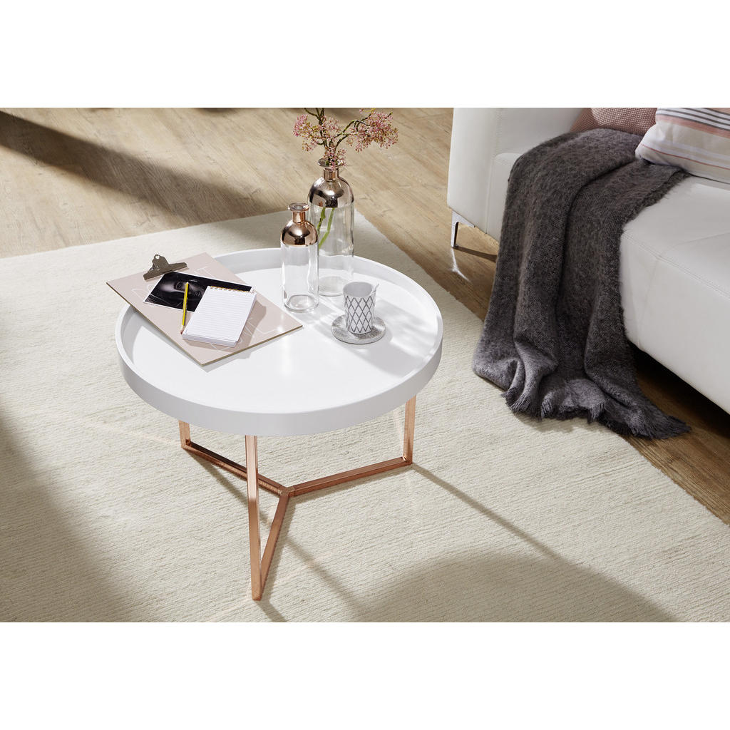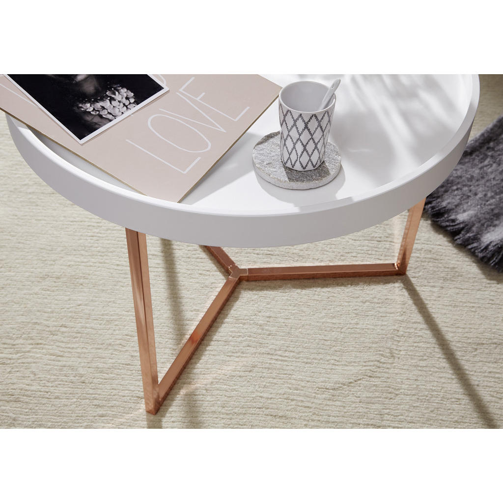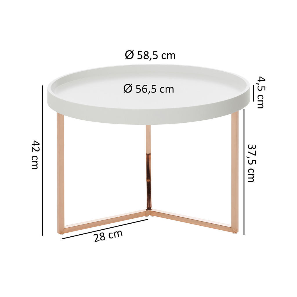 MID.YOU klubska miza v beli barvi v kombinaciji barve bakra je eleganten kos pohištva, ki prinaša industrijski slog z luksuznim pridihom. Odlično prilega različnim prostorom, še posebej dnevnim sobam, kjer lahko služi kot osrednji kos za serviranje kave ali čaja, postavitev knjig, dekoracij ali čudovite lončnice. Uporabite pa jo lahko tudi kot nočno omarico v svoji spalnici. Praktičen snemljiv pladenj na vrhu pa omogoča enostavno postrežbo, ki doda mizici dodatno funkcionalno vrednost. Ključne prednosti: Večnamenska uporaba – odlična kot klubska miza ali elegantna nočna omarica. Snemljiv pladenj – omogoča enostavno postrežbo hrane in pijače. Elegantna kombinacija bele in bakrene barve – dodaja prostorom pridih glamurja in sodobne prefinjenosti. Stabilna kovinska konstrukcija – za dolgotrajno uporabo brez kompromisov pri stilu. Odlična za manjše prostore – funkcionalna rešitev tam, kjer šteje vsak centimeter. Lastnosti: Dolžina/širina/višina: 58,5/58,5/42 cm Barva: bela, barve bakra Material: les, leseni material Površina: mat, lakirano Noge: jeklo, mat, lakirano, barve
