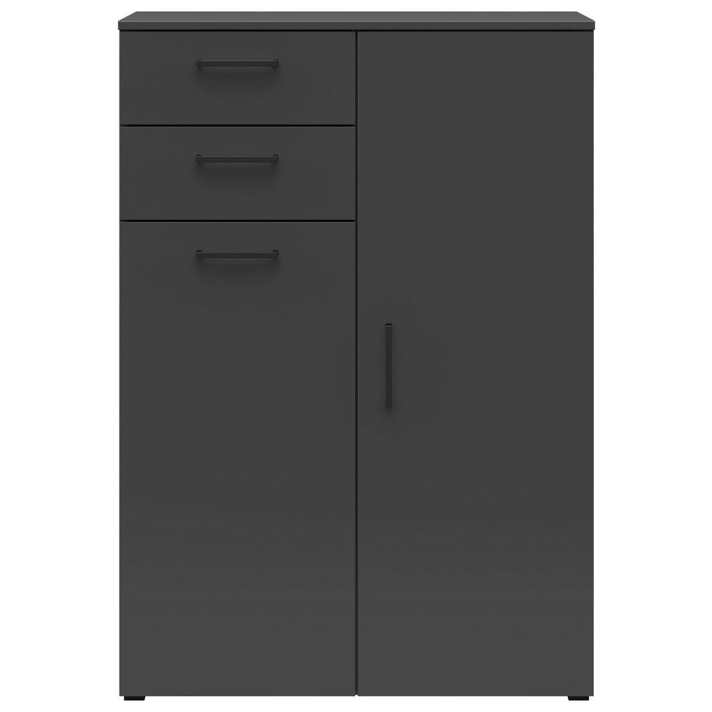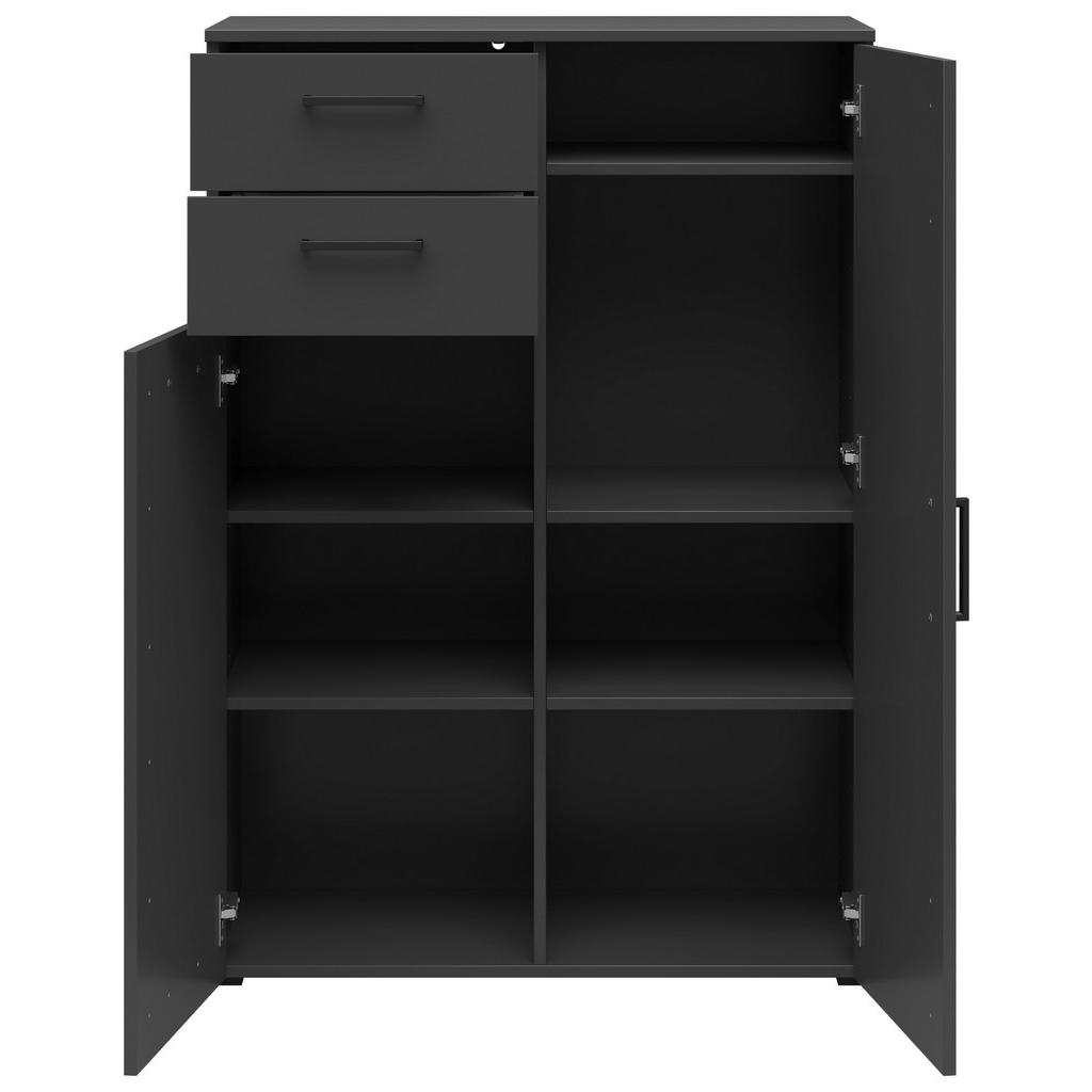 Blagovna znamka Carryhome nudi pohištvo za vse vrste prostorov, med drugim za dnevne sobe, jedilnice, spalnice, pisarne in predsobe. Znana je po simplističnih, a slogovno dovršenih dizajnih, pestrem izboru ter odličnem razmerju med kakovostjo in ceno. Elegantna, funkcionalna, prostorna komoda se ponaša s 5 nastavljivimi policami, 2 predaloma ter klasičnimi vrati na tečajih, ki omogočajo odpiranje iz leve in desne strani. Nudi precej prostora za shranjevanje najrazličnejših potrebščin ter vam bo gotovo olajšala urejanje dnevnih sob, jedilnic ali spalnic. Kvalitetna imitacija lesa komodi zagotavlja dolgo življenjsko dobo, nevtralna barva grafita pa se brezhibno vključi v večino sodobnih interierjev. Povrhu je izdelek na voljo v različnih barvah. Ključne prednosti: Enostavno vzdrževanje: Za čistočo zadošča občasno brisanje s suho in vlažno krpo. Certifikat FSC MIX priča o tem, da materiali prihajajo iz odgovorno upravljanih gozdov. Nastavljive police omogočajo fleksibilno in individualizirano organizacijo prostora. Lastnosti: Dimenzije: Širina 80 cm, višina 115 cm, globina 40 cm Barva: Barve grafita Teža: Pribl. 42 kg Debelina: Pribl. 15 mm Maks. obremenitev na polico: Pribl. 4 kg Materiali: Imitacija lesa (iverna plošča, folija z dekorjem), umetna masa