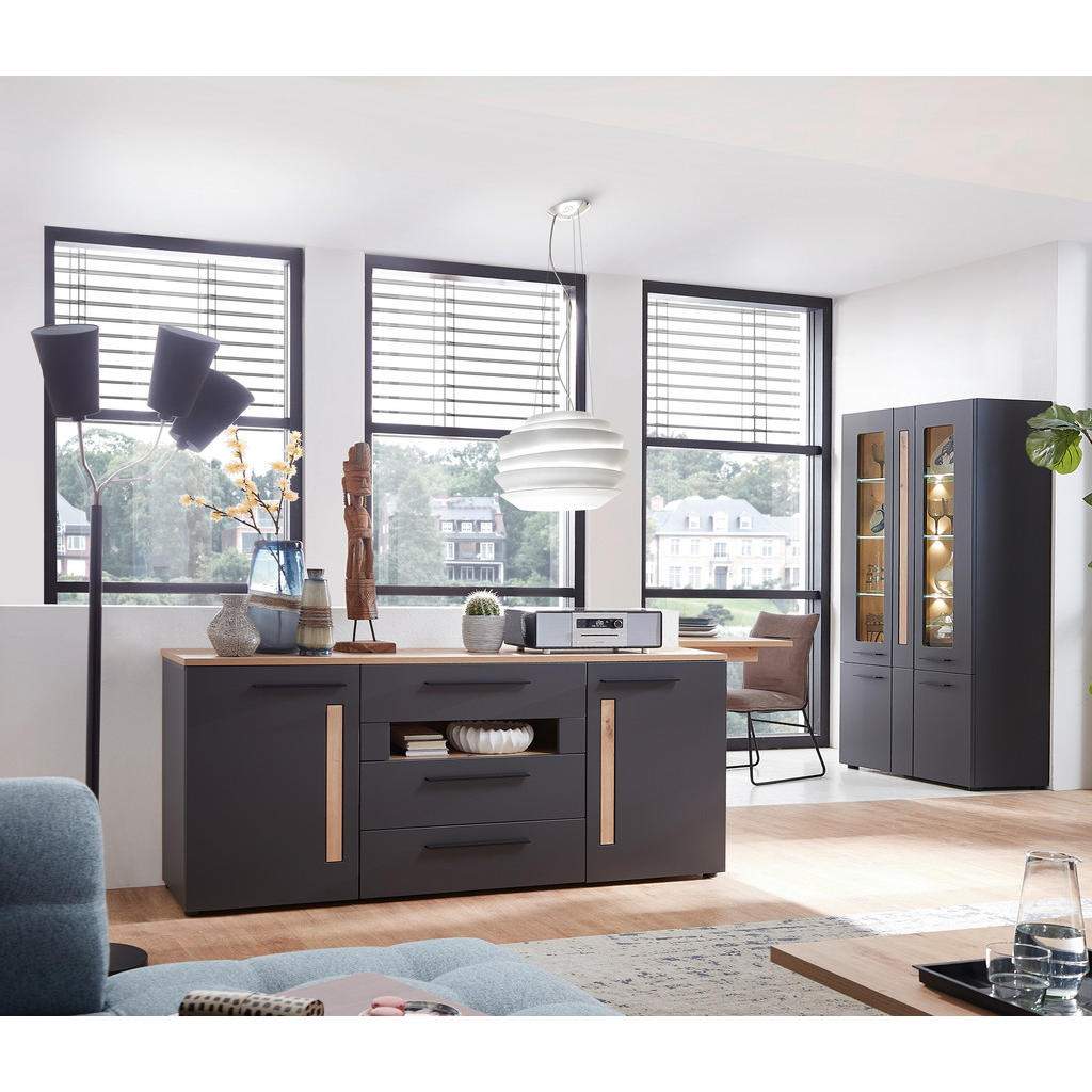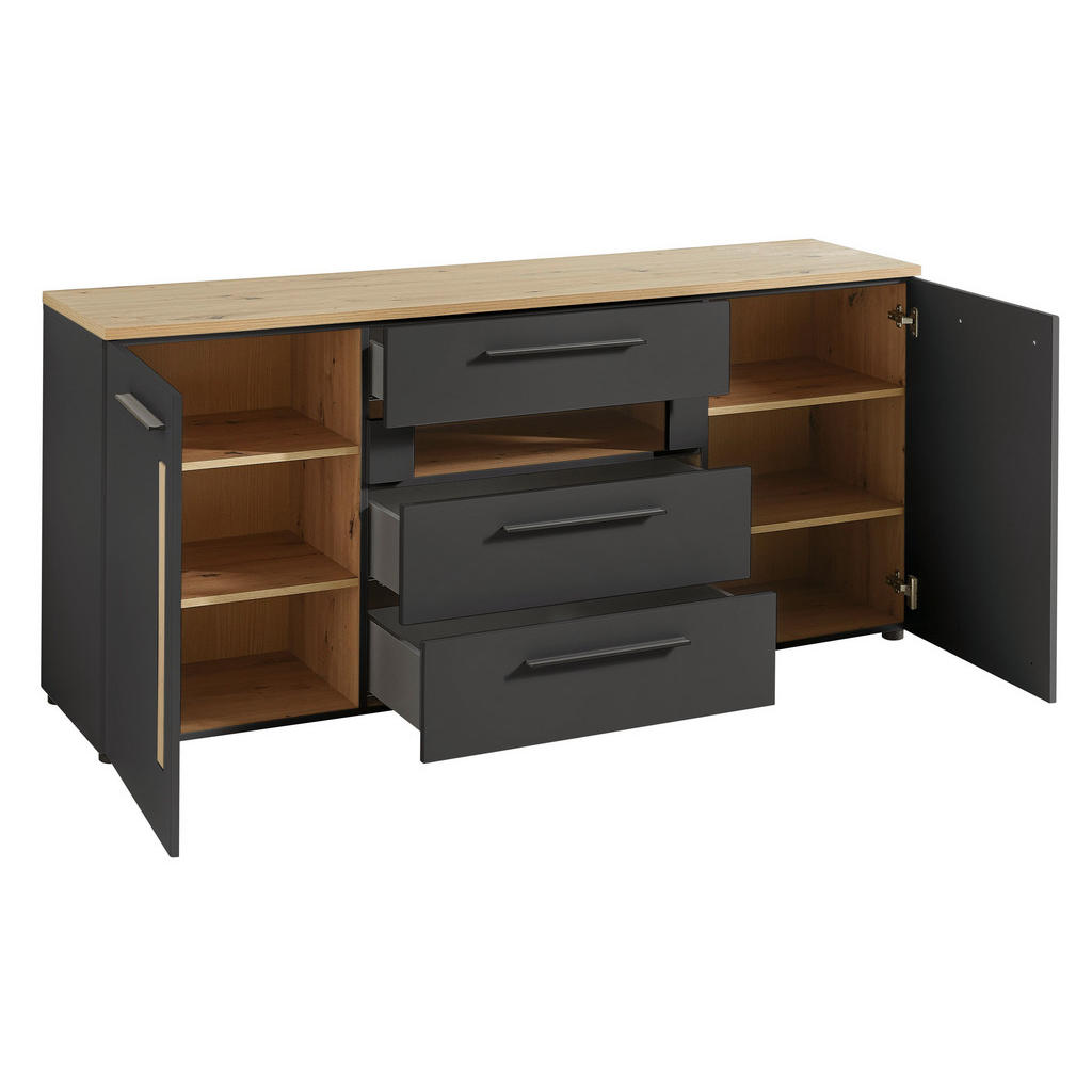 Zablagovno znamko Hom`inje značilen minimalističen dizajn s svetlimi, prijaznimi barvami.Namenjena je predvsem mladim in nudi ogromno odličnih izdelkov zaopremljanje prvega ali študentskega stanovanja. Pohištvo jefleksibilno in ga je mogoče medsebojno kombinirati, zajema pa širokspekter prostorov, med drugim dnevne sobe, jedilnice, pisarne terspalnice. Ta prostorna in elegantna komoda v barvah grafita in hrasta se ponaša s 3 predali in 4 nastavljivimi policami. Občutno vam bo olajšala shranjevanje in organizacijo predmetov ter vam obenem služila kot okrasni predmet. Kvalitetni materiali zagotavljajo, da bo zdržala dolga leta in bo dolgo videti kot nova. Ključne prednosti: Enostavno vzdrževanje: Za čistočo zadošča občasno brisanje s suho krpo. Sistem za mehko in tiho zapiranje hrup ohranja na minimumu. Nastavljive police omogočajo fleksibilno in individualizirano organizacijo prostora. Lastnosti: Dimenzije: Širina 180 cm, višina 81 cm, globina 44 cm Barva: Barve grafita, barve hrasta, črna Teža: Pribl. 75 kg Maks. obremenitev: Pribl. 40 kg Maks. obremenitev na polico: Pribl. 7 kg Debelina materiala: Pribl. 16 mm Material