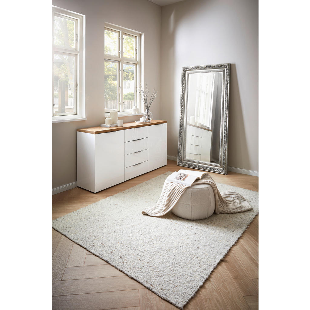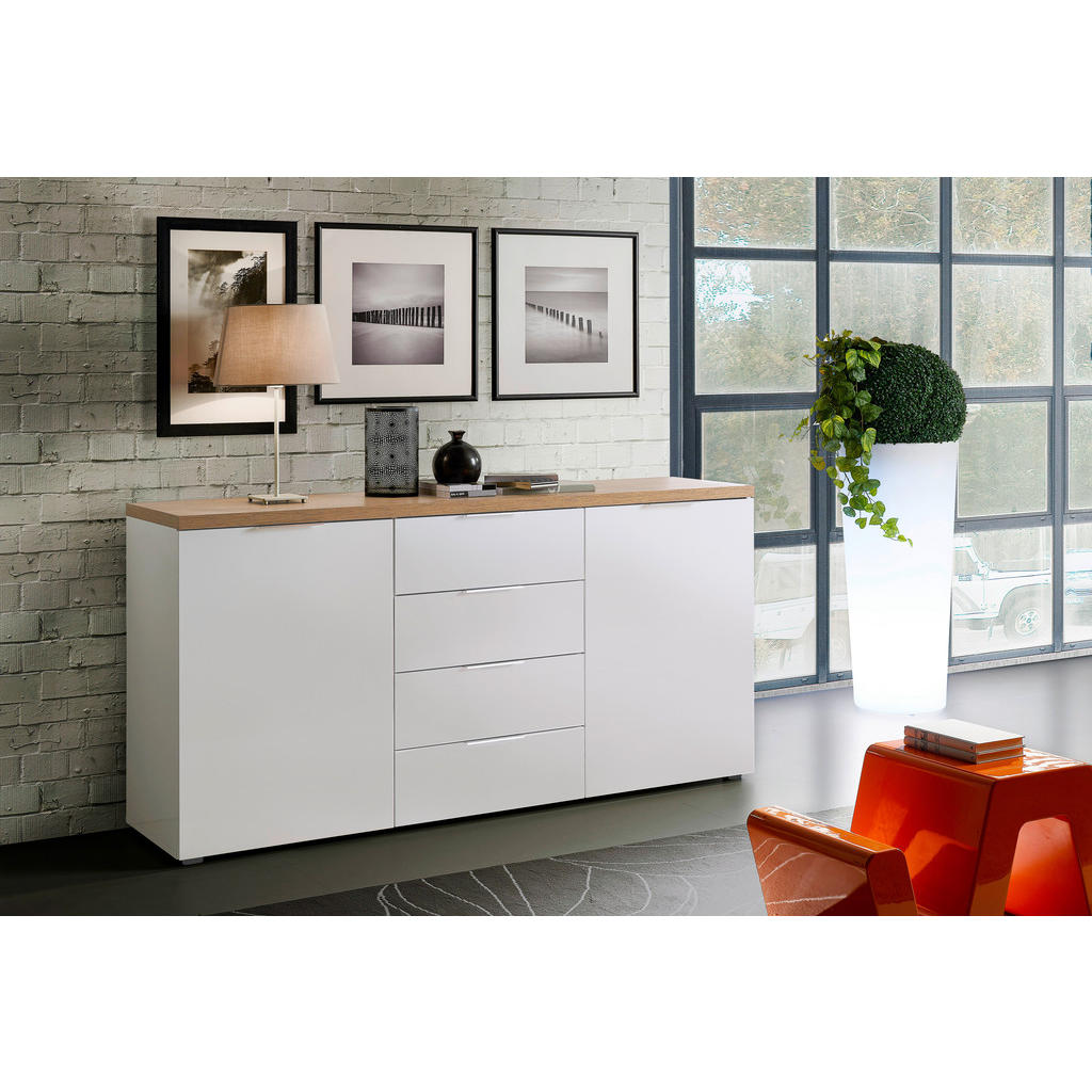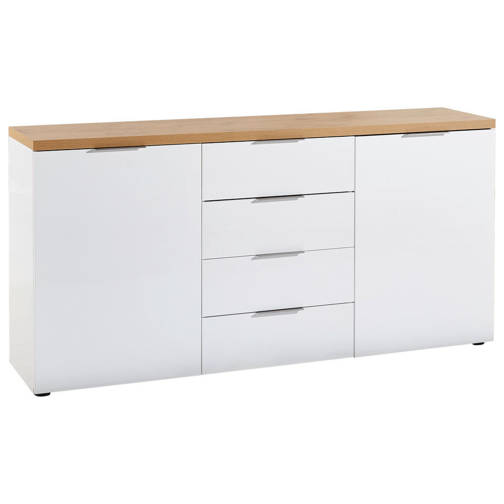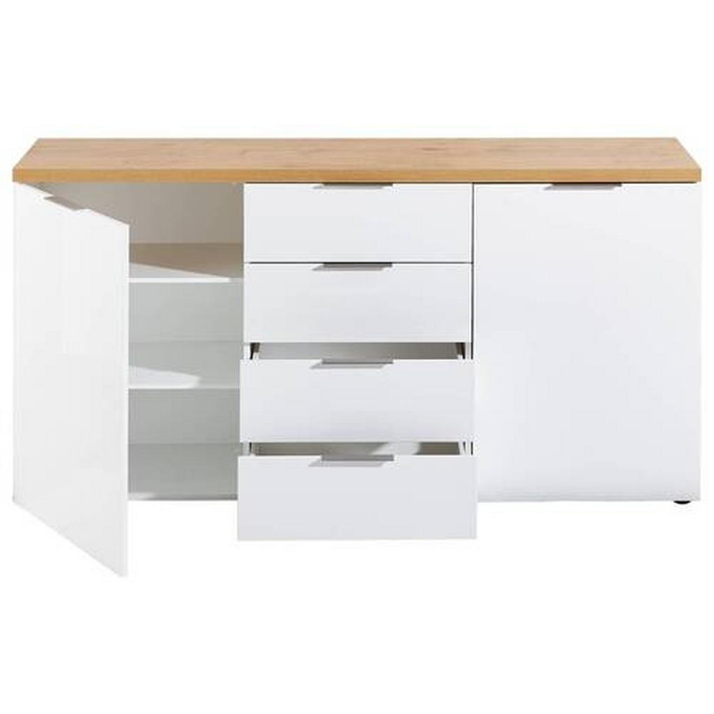 Blagovnaznamka Xoranudistanovanjsko pohištvo: ne jamči samo trenutne, temveč tudidolgoročno kakovost. Njena izredno široka ter fleksibilna ponudbaobsega dnevne sobe, jedilnice, spalnice, predsobe ter kopalnice in bozagotovo zadostila vsakomur, ki sestavlja prvi dom. Elegantna komoda v prijetnem kontrastu med sijočo belo barvo in barvami lesa prepriča z estetsko dovršenostjo, prostornostjo ter trpežnostjo. Zaradi nevtralne zasnove se poda širokemu spektru sodobnih notranjih prostorov: idealna je za spalnice, dnevne sobe in jedilnice. Ključne prednosti: Enostavno vzdrževanje: Za čistočo zadošča občasno brisanje s suho krpo. Sistem za mehko in tiho zapiranje hrup ohranja na minimumu. Visoka kapaciteta: 4 predali in 4 police nudijo veliko prostora za shranjevanje najrazličnejših potrebščin. Lastnosti: Dimenzije: Širina 180 cm, višina 89 cm, globina 43 cm Barva: Bela, barve hrasta, barve aluminija Maks. obremenitev: Pribl. 20 kg Maks. obremenitev na polico: Pribl. 5 kg Debelina materiala: Pribl. 12 mm Teža: Pribl. 84 kg Materiali: Imitacija lesa (iverna plošča), umetna masa, kovina</