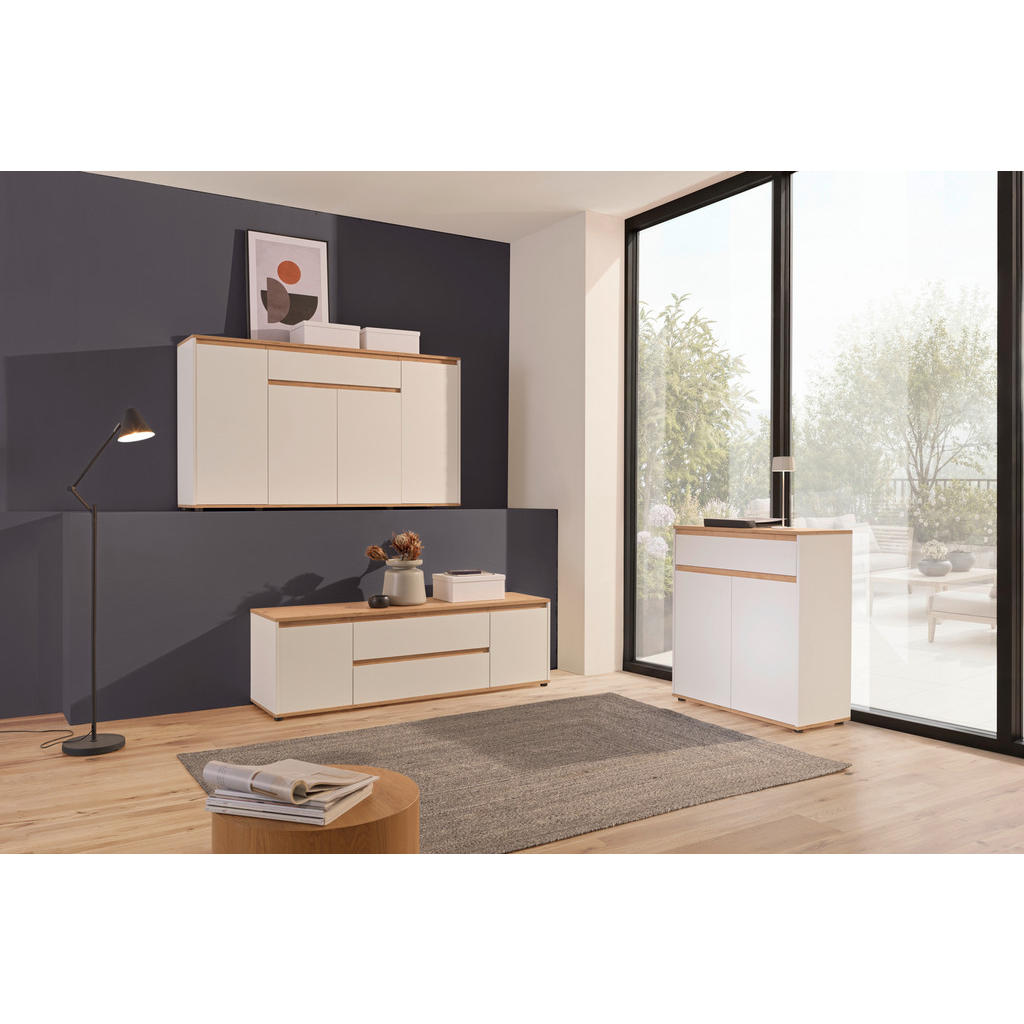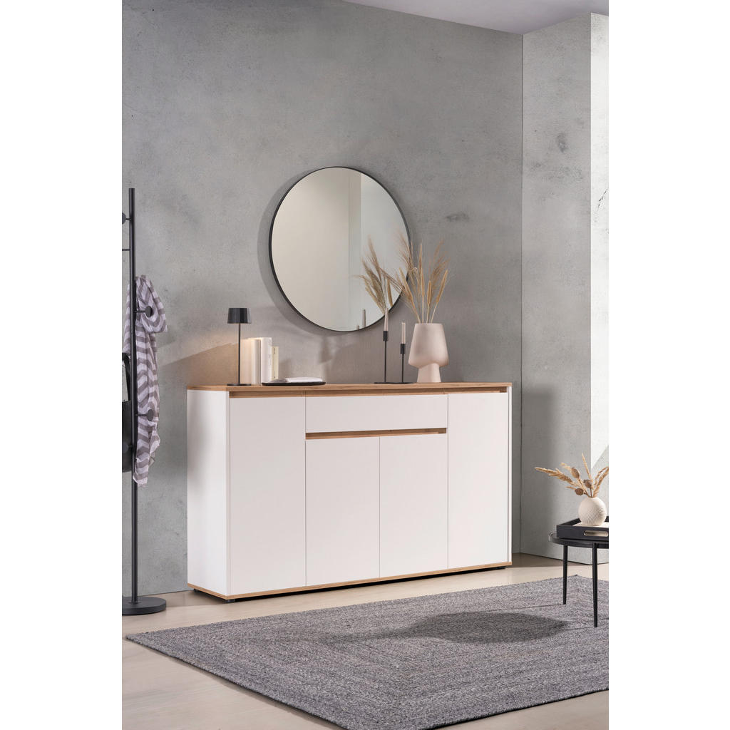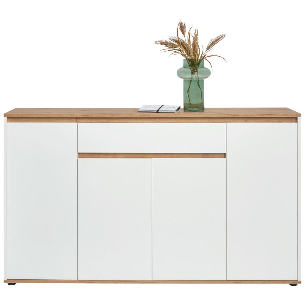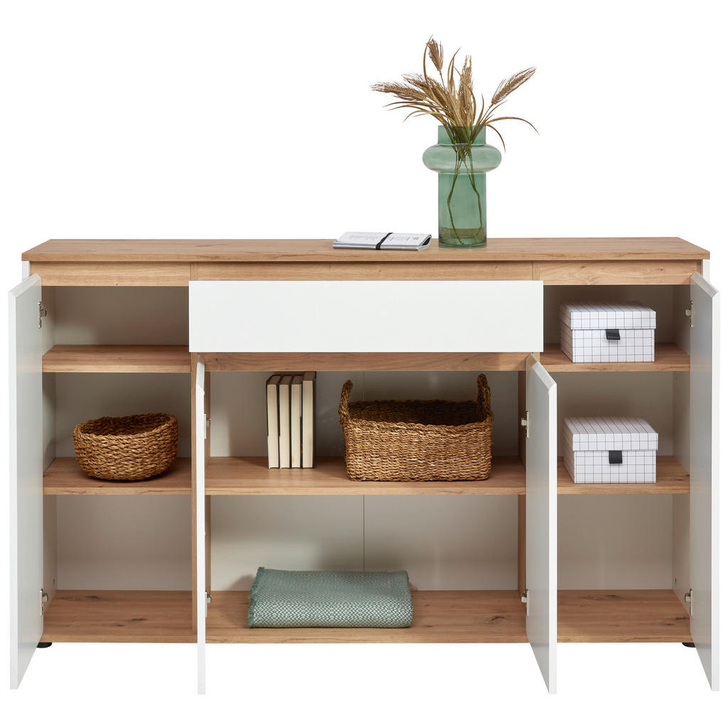 Blagovnaznamka Carryhomenudi pohištvo za vse vrste prostorov, med drugim za dnevne sobe,jedilnice, spalnice, pisarne in predsobe. Znana je po simplističnih,a slogovno dovršenih dizajnih, pestrem izboru ter odličnem razmerjumed kakovostjo in ceno. Trpežna, funkcionalna komoda iz kvalitetne imitacije lesa se ponaša s prostornostjo (5 nastavljivih polic, predal) in eleganco (kontrast med naravnimi barvami lesa ter hladnejšo belo barvo naredi iz izdelka več od zgolj funkcionalnega kosa pohištva). Zaradi nevpadljive zasnove se brezhibno vključi v večino sodobnih interierjev, zlasti pa je primerna za dnevne sobe ter jedilnice. Ključne prednosti: Enostavna montaža, ki ne zahteva posebnih spretnosti. Nastavljive police omogočajo fleksiblno in individualizirano organizacijo prostora. Odpiranje brez ročajev dodatno poudari eleganco izdelka ter obenem prihrani prostor. Lastnosti: Dimenzije: Širina 160 cm, višina 93 cm, globina 38 cm Barva: Bela, hrast artisan Maks. obremenitev: Pribl. 10 kg Maks. obremenitev na polico: Pribl. 5 kg Teža: Pribl. 60 kg Debelina materiala: Pribl. 16 mm Materiali: Imitacija lesa (iverna plošča) Površina: Melamin
