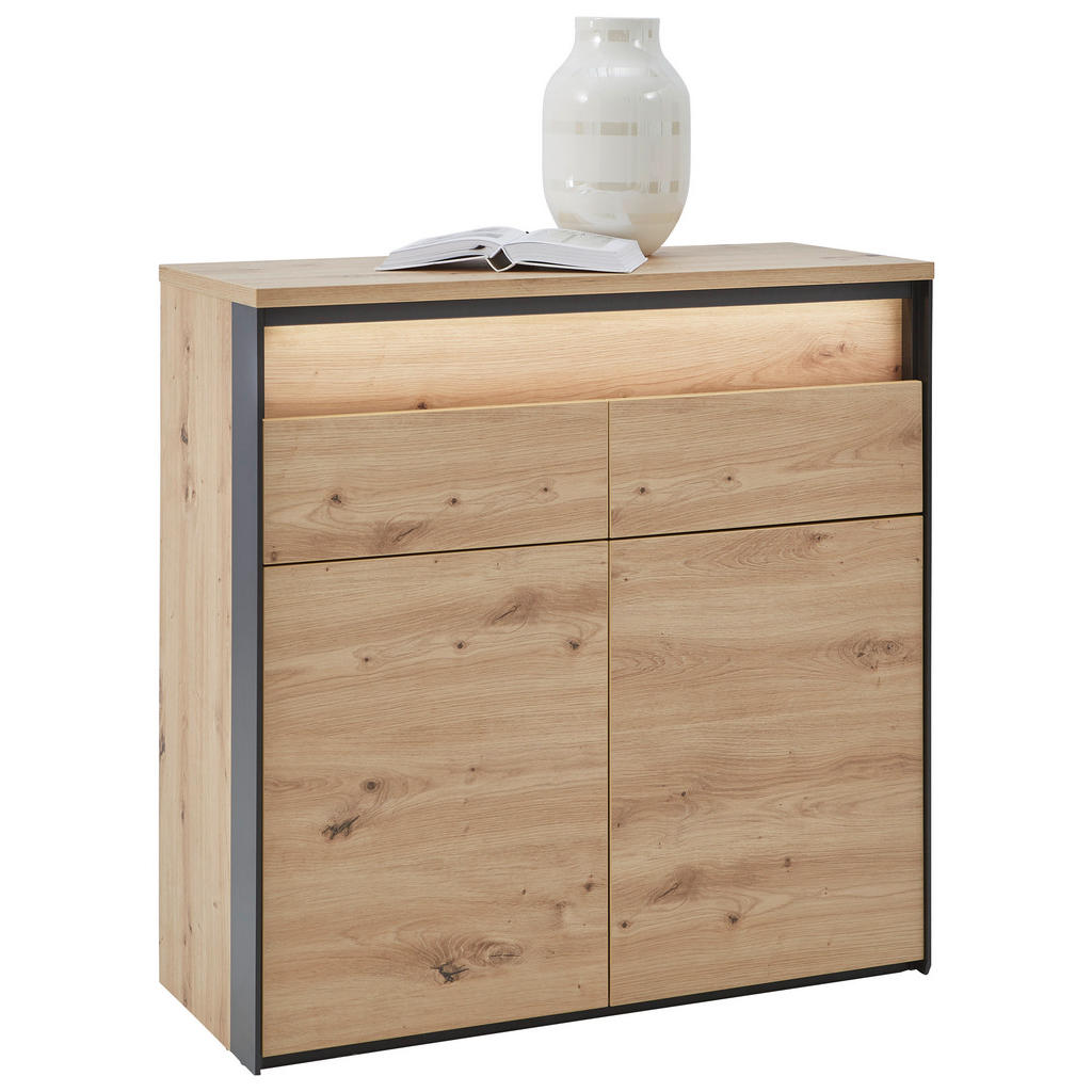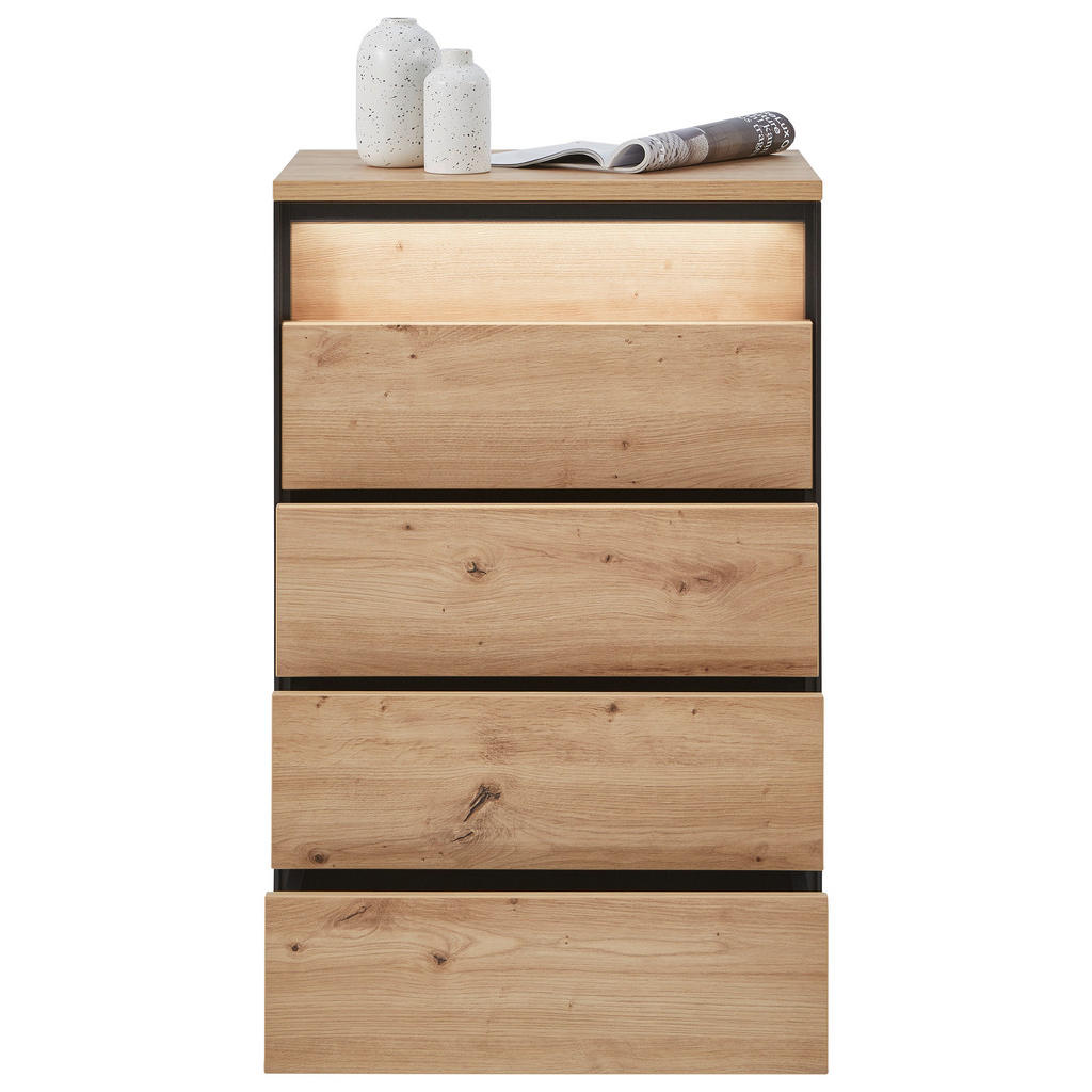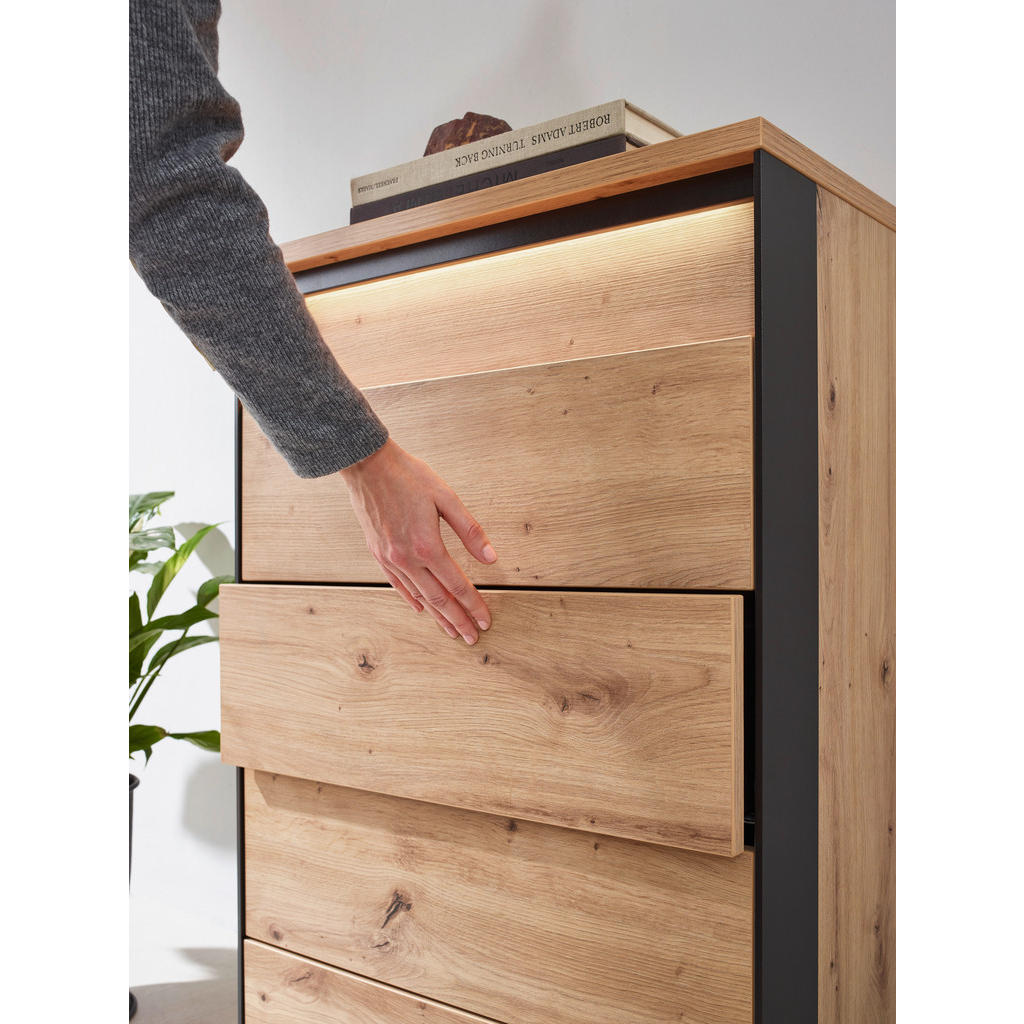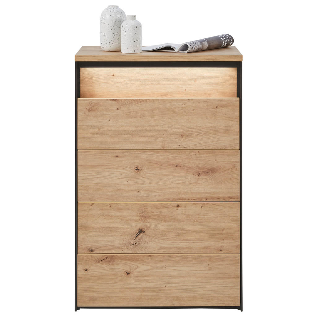 Ponudbablagovne znamke Voleomed drugim obsega pohištvo za jedlinice, predsobe, pisarne in dnevnesobe. Izdelki se ponašajo z modernim a obenem brezčasnim videzom;zanje so pogoste jasne linije, klasičen les ter elegantno steklo.Pohištvo se zlahka prilagodi različnim stilom, kar pomeni, da imapotencial ugajati velikemu številu ljudi. Komoda s 4 predali in LED osvetlitvijo vam bo občutno olajšala shranjevanje in organizacijo predmetov. Zaradi kompaktnih dimenzij je primerna tako za velike kot majhne prostore, kontrast med toplo barvo lesa ter industrijsko barvo antracita pa naredi iz izdelka več od zgolj funkcionalnega kosa pohištva. Ključne prednosti: Vključena LED osvetlitev razširi funkcionalnost izdelka ter dodatno poudari njegovo estetsko dovršenost. Enostavno vzdrževanje: Za čistočo zadošča občasno brisanje s suho krpo. Odpiranje na pritisk ojača eleganco komode ter obenem prihrani prostor. Lastnosti: Dimenzije: Širina 58 cm, višina 88 cm, globina 38 cm Barva: Črna, hrast artisan Maks. obremenitev: Pribl. 20 kg Teža: Pribl. 30 kg Materiali: Imitacija lesa (iverna plošča, melamin)