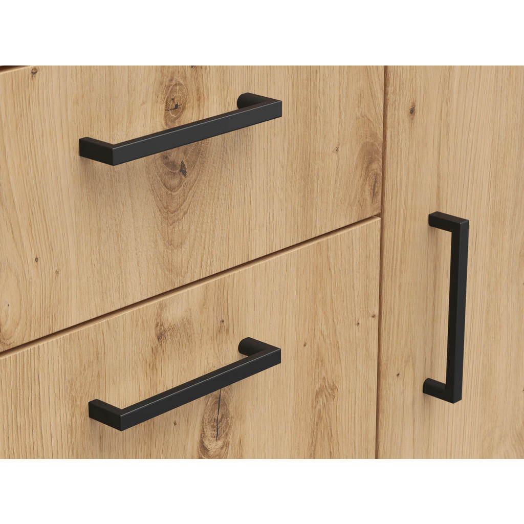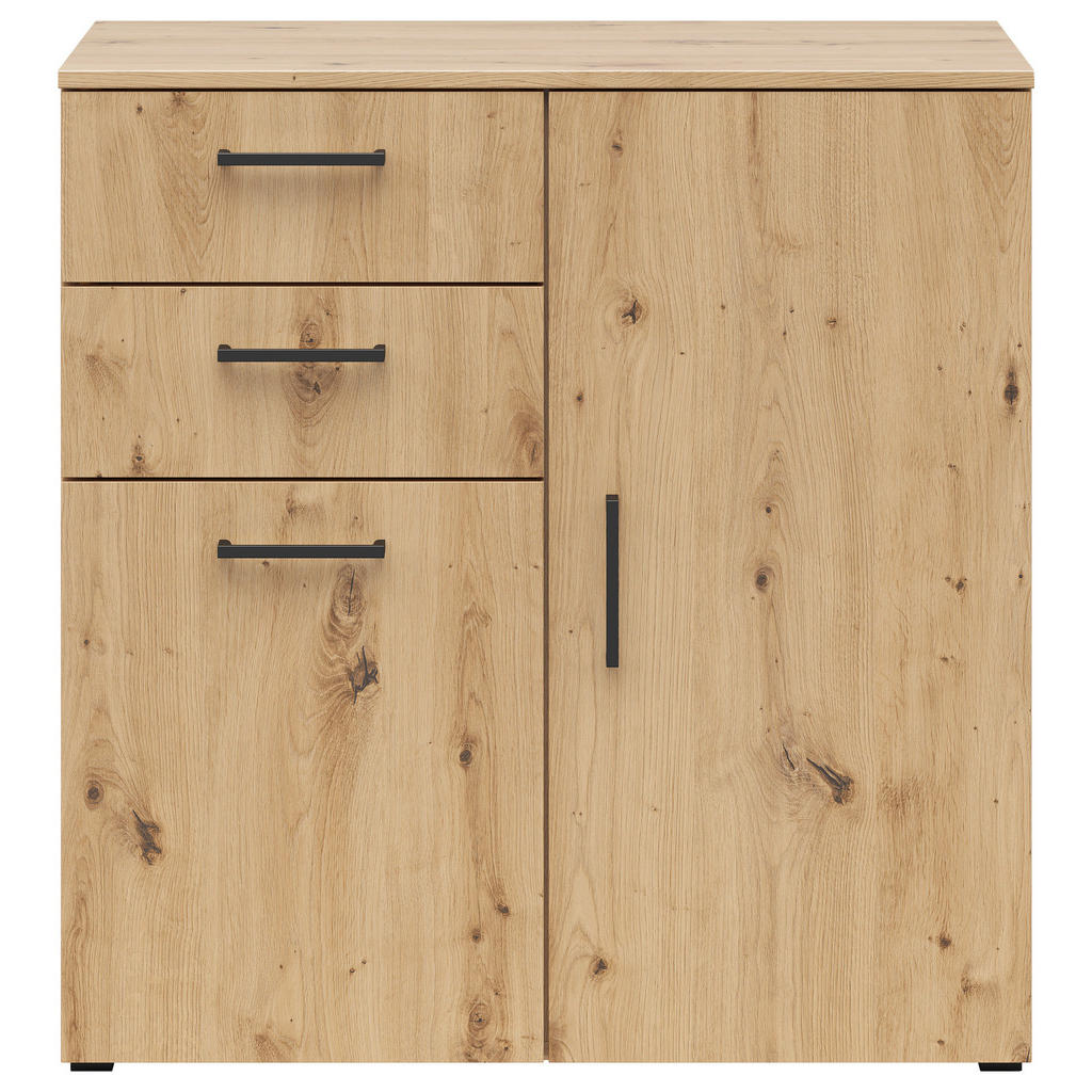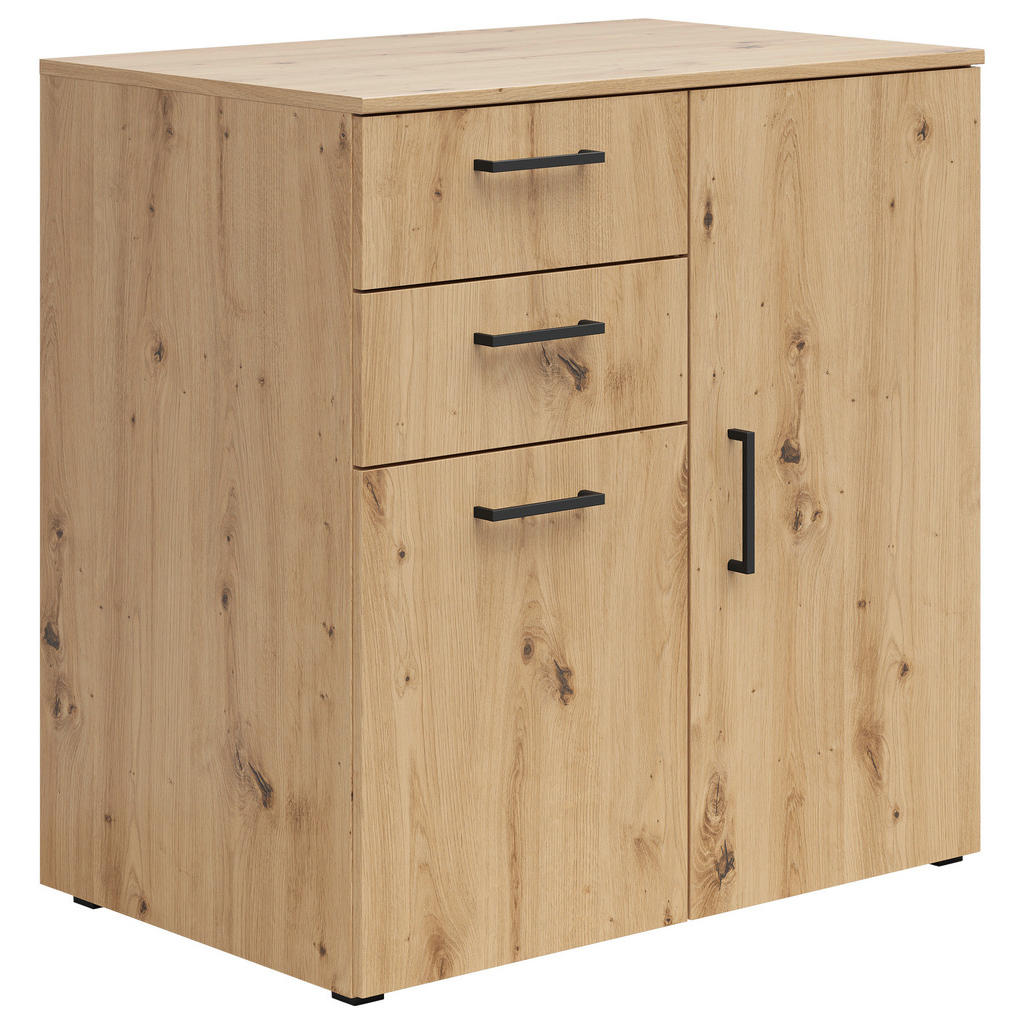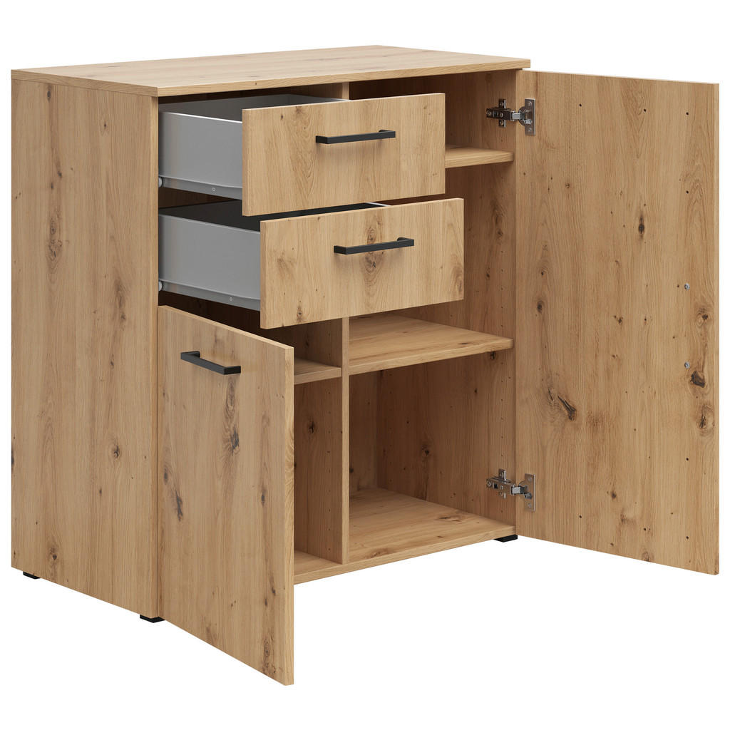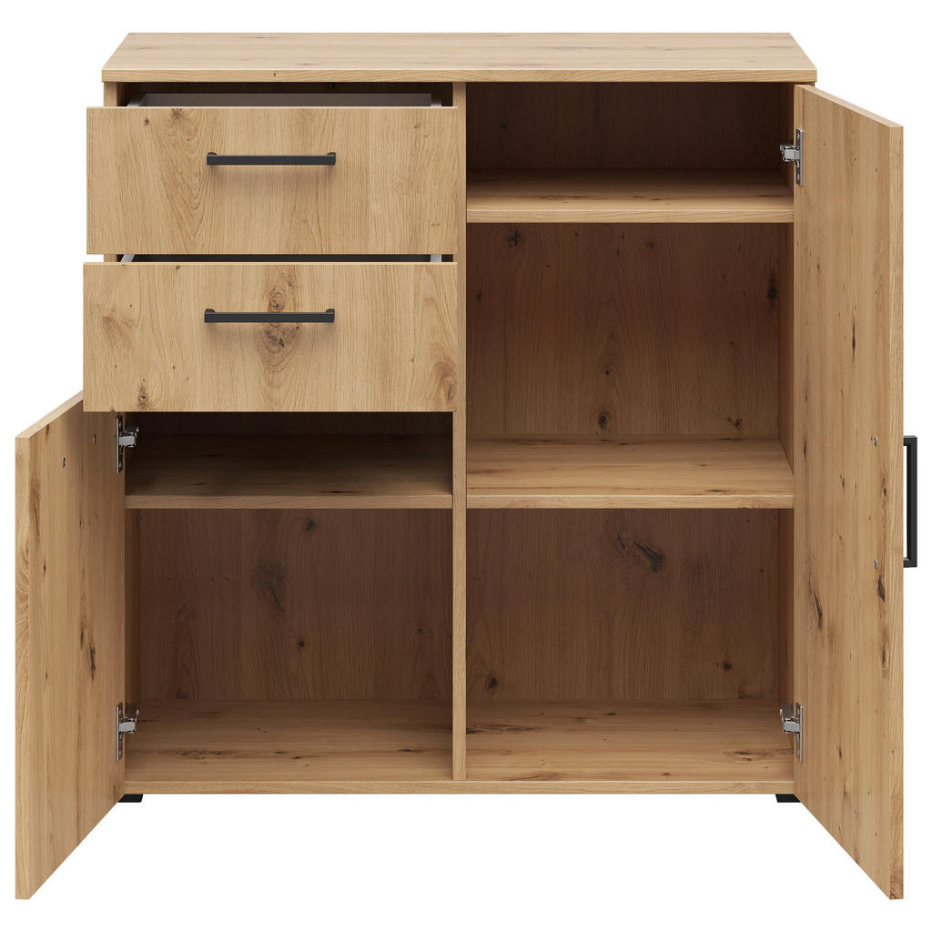 Blagovna znamka Carryhome nudi pohištvo za vse vrste prostorov, med drugim za dnevne sobe, jedilnice, spalnice, pisarne in predsobe. Znana je po simplističnih, a slogovno dovršenih dizajnih, pestrem izboru ter odličnem razmerju med kakovostjo in ceno. Omarica v kvalitetni imitaciji hrasta je primerna predvsem za dnevne sobe, pisarne in hodnike. Ponaša se s 3 nastavljivimi policami ter 2 predaloma, ki omogočajo prilagodljivo shranjevanje najrazličnejših predmetov, vtis pa dopolni eleganten dizajn, ki se bo kot doma počutil v večini interierjev. Ključne prednosti: Enostavno vzdrževanje: Za čistočo zadošča občasno brisanje s suho in vlažno krpo. Funkcionalnost: 3 nastavljive police in 2 predala omogočajo fleksibilno in individualizirano organizacijo prostora ter shranjevanje številnih potrebščin. Estetska dovršenost: Zaradi nevpadljive zasnove se izdelek lahko brezhibno vključi v večino sodobnih notranjih prostorov. Lastnosti: Dimenzije: Širina 80 cm, višina 83 cm, globina 40 cm Barva: Hrast artisan, antracit Teža: Pribl. 27 kg Maks. obremenitev na polico: Pribl. 4 kg Debelina materiala: Pribl. 15 mm Materiali: Imitacija lesa (iverna plošča, folija z dekorjem), umetna masa
