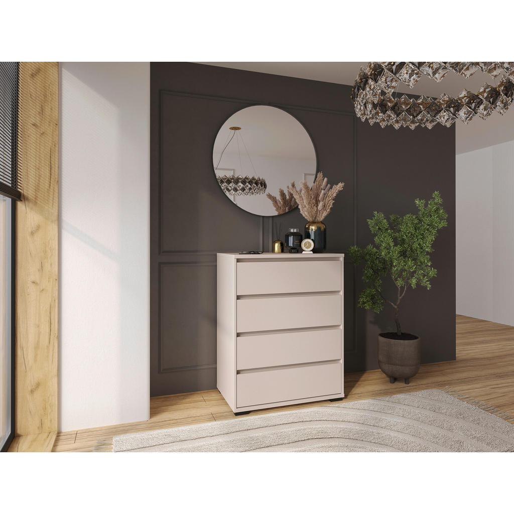 Blagovnaznamka Carryhomenudi pohištvo za vse vrste prostorov, med drugim za dnevne sobe,jedilnice, spalnice, pisarne in predsobe. Znana je po simplističnih,a slogovno dovršenih dizajnih, pestrem izboru ter odličnem razmerjumed kakovostjo in ceno. Trpežna, funkcionalna komoda v vabeči barvi kašmirja se ponaša s četverico predalov: povsod vam bo močno pomagala pri organizaciji prostorov in shranjevanju predmetov, zaradi estetske dovršenosti pa vam bo služila tudi kot okrasni predmet. Vtis dopolni dejstvo, da je izdelek na voljo v različnih barvah: gotovo boste našli tisto, ki ustreza vašemu slogu. Ključne prednosti: Enostavna montaža, ki ne zahteva posebnih spretnosti. Kompaktne dimenzije naredijo izdelek primeren tako za velike kot majhne prostore. Prostornost: Četverica predalov omogoča shranjevanje najrazličnejših potrebščin. Lastnosti: Dimenzije: Širina 80,1 cm, višina 102,8 cm, globina 48 cm Barva: Kašmir, antracit Debelina: Pribl. 16 mm Materiali: Imitacija lesa (iverna plošča), umetna masa