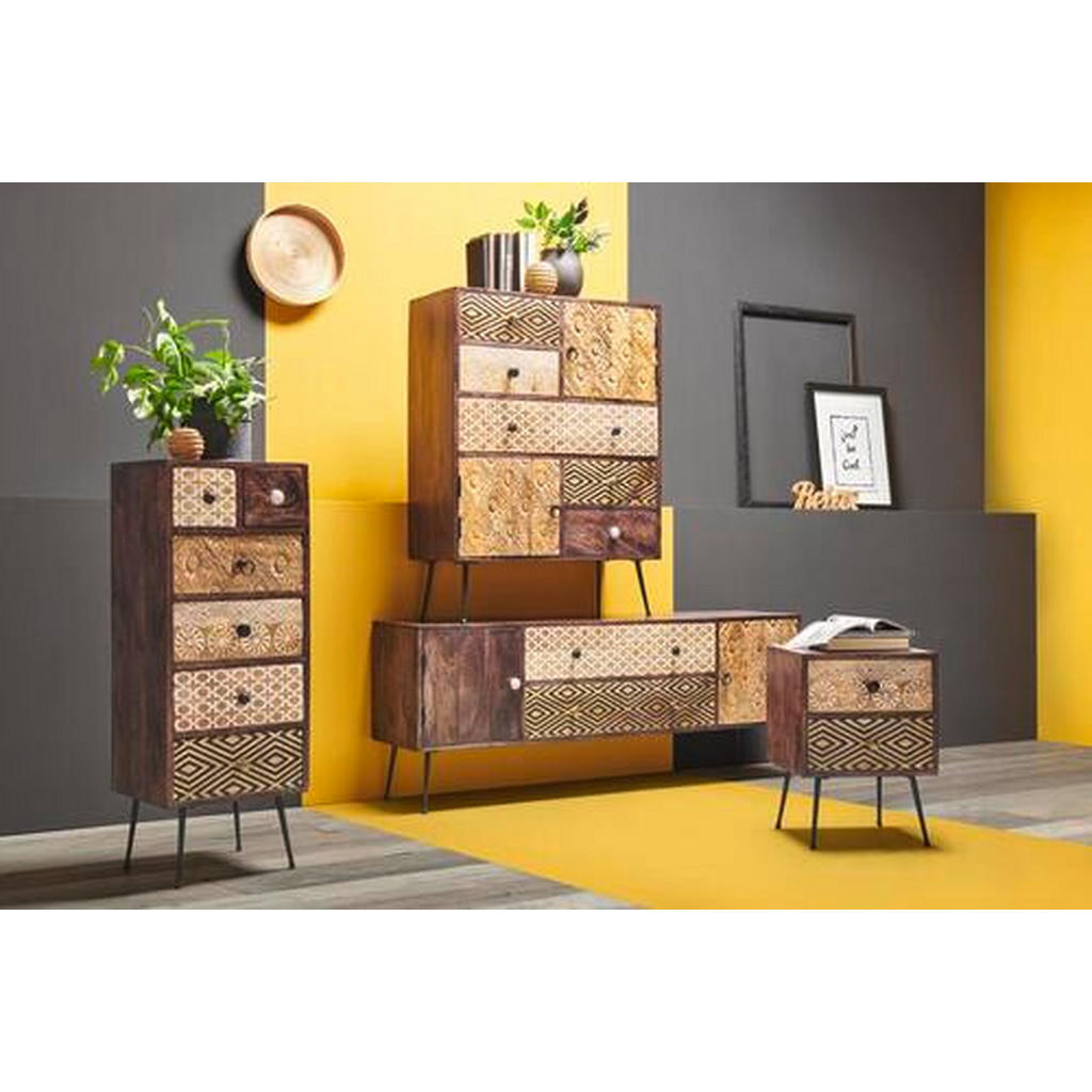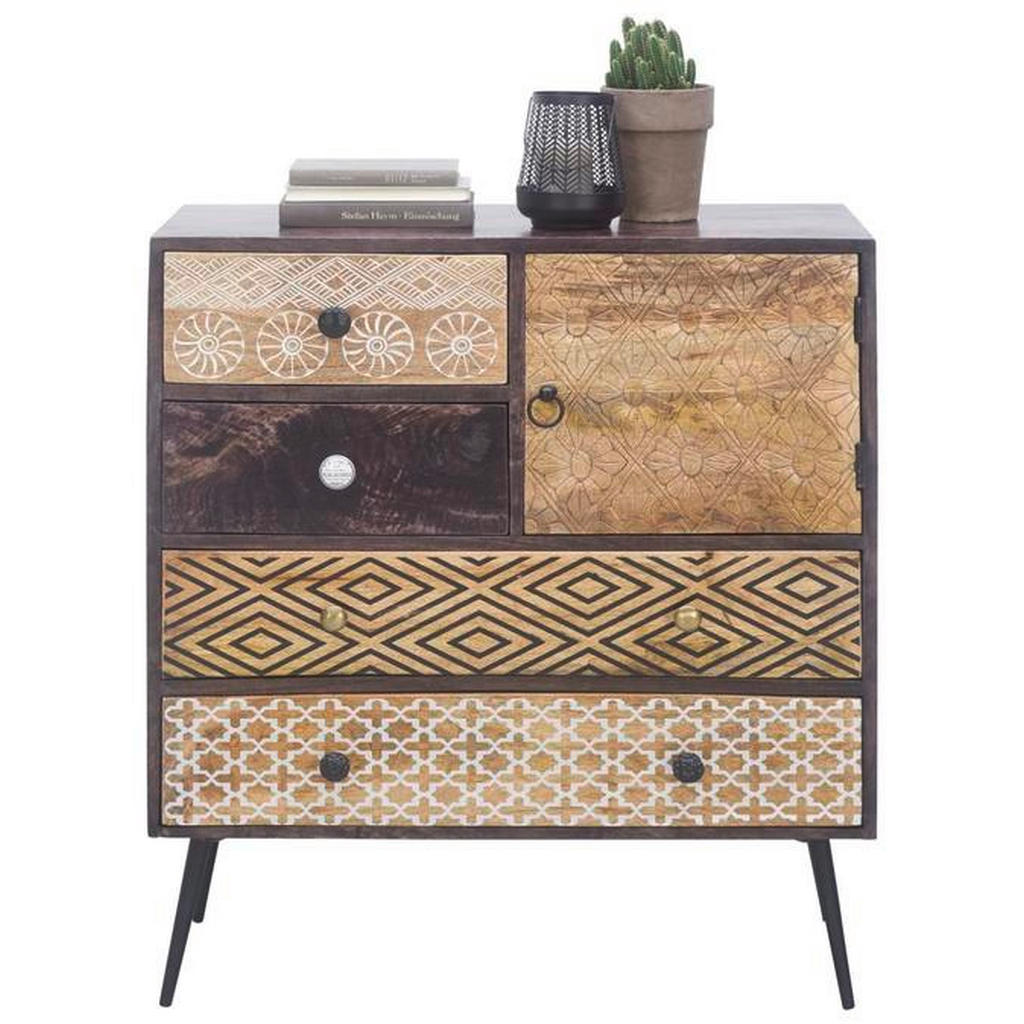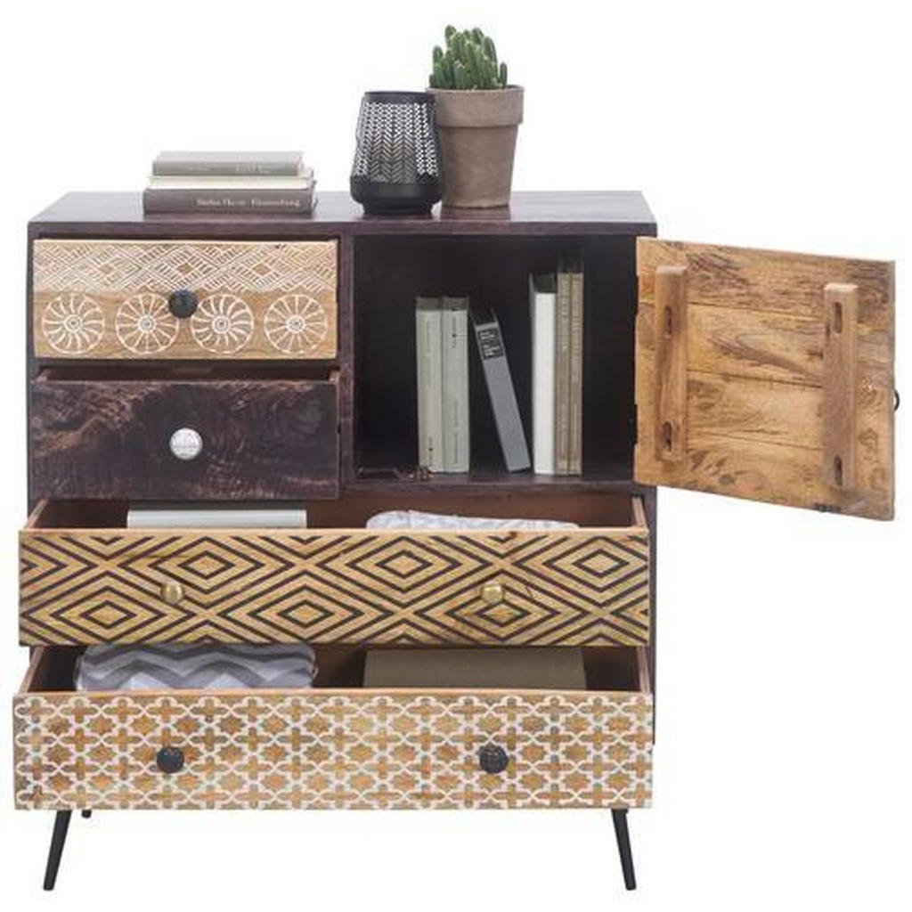Predmeti, razne stvari in pripomočki se pogosto nabirajo v vsakem gospodinjstvu, rešitev za njihovo urejenost pa je izbira prave komode. Komoda namreč omogoča večjo preglednost, s svojo oblikovanostjo pa vdahne prostoru novo vsebino. Komoda je kakovostne znamke Landscape, ki se ponaša z kakovostno izdelanim pohištvom in modernim videzom. Odlikujejo jo različno oblikovani predali in police, ki omogočajo poljubno razporeditev stvari. Komoda je narejena v nevtralni črni barvi in naravni barvi lesa in se zato prilagaja mnogim stilom, poleg svoje prilagodljivosti vsakemu prostoru pa vnaša vanj tudi večjo mero urejenosti. Narejena je iz kakovostnih materialov, masiven les namreč omogoča daljšo življenjsko dobo komode. Dimenzije: 80x90x35 cm