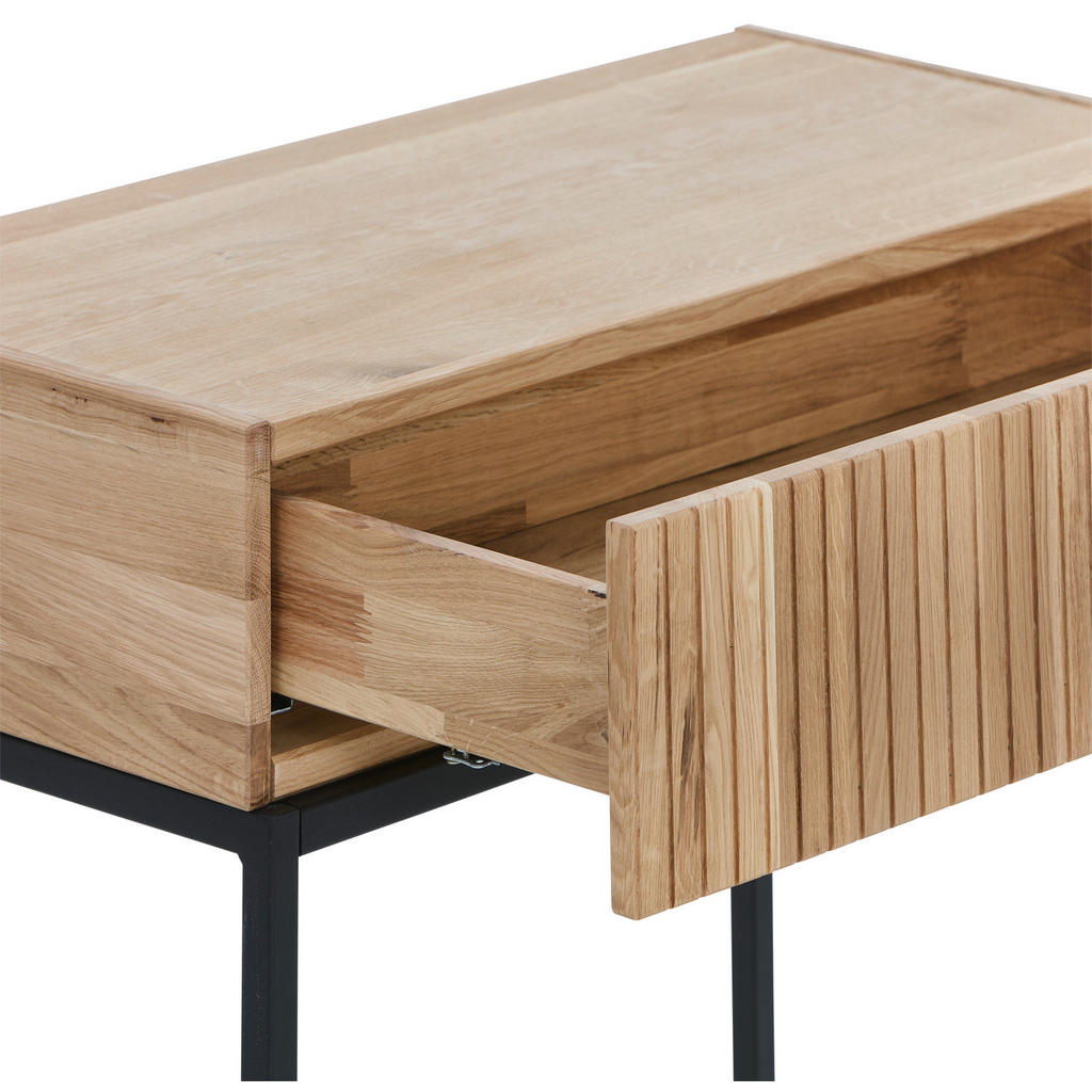 »Naravna« znamka Linea Natura vas bo očarala s kakovostnimi in domačimi zamislimi iz masivnega ali delno masivnega lesa, ki imajo vse prednosti tega materiala – od pozitivnega učinka na klimatske pogoje v prostoru do antistatičnega učinka, zaradi katerega se na pohištvu ne nabira prah. Konzolna mizica blagovne znamke Linea Natura združuje naravne materiale in sodoben dizajn. Izdelana je iz kakovostnega hrastovega lesa, kar zagotavlja trpežnost in dolgo življenjsko dobo. Pohvali se lahko s predalom za mehko in tiho zapiranje. Mizica se bo odlično prilagodila tako klasičnim kot moderno opremljenim stanovanjem. Ključne prednosti: Elegantna oblika: klasičen dizajn, ki se lepo ujema z različnimi stili notranje opreme. Kakovostni materiali: izdelana iz masivnega hrastovega lesa in jeklenega ogrodja, kar zagotavlja stabilnost in dolgo življenjsko dobo. Funkcionalnost: Mizica vključuje predal z mehkim zapiranjem za shranjevanje manjših predmetov. Enostavno vzdrževanje: naoljena površina hrastovega lesa omogoča preprosto čiščenje in ohranjanje naravnega videza lesa. Lastnosti: Dolžina/širina/višina: 80/38/80 cm Material: hrast (naoljeno) Material nog: jeklo (prašno lakirano) Navodila za nego: čiščenje z ustreznim sredstvom za nego Predal: 1 Vrsta ročaja: letvica za odpiranj