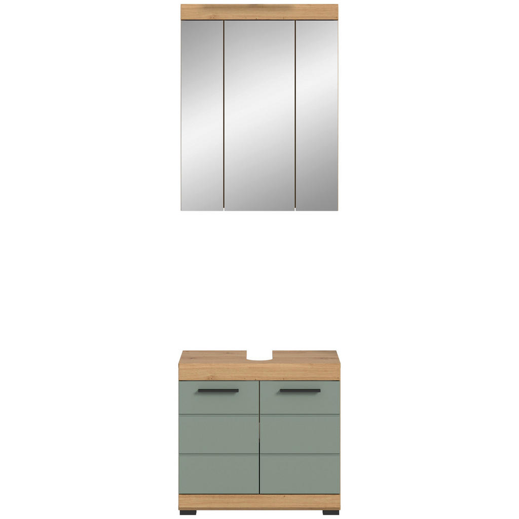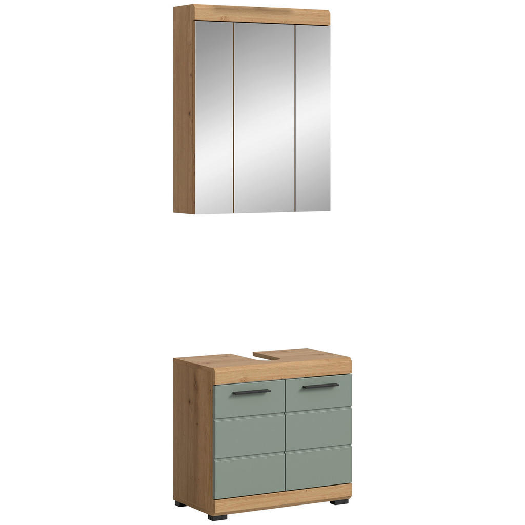 Uredite svojo kopalnico z elegantnim in funkcionalnim 2-delnim kopalniškim setom. Set združuje omarico z ogledalom ter omarico za pod umivalnik v harmoničnih barvah hrast artisan in žajblja. Omarici prinašata naraven in sproščujoč videz v prostor. Kompaktne dimenzije. Omarica z ogledalom (60 x 79 x 18 cm) in omarica za pod umivalnik (60 x 56 x 34 cm) omogočata optimalno postavitev tudi v manjših kopalnicah. Notranjost je skrbno zasnovana s 7 nastavljivimi policami, kar zagotavlja fleksibilno in urejeno shranjevanje vseh kopalniških pripomočkov. Kakovostni lesni materiali z melaminsko prevleko zagotavljajo dolgo življenjsko dobo in preprosto čiščenje. FSC MIX certifikat potrjuje trajnostno in okolju prijazno izdelavo. Eleganten dizajn s črnimi ročaji in črnimi nogami dopolnjuje celoten videz. Ključne prednosti: Kompleten 2-delni set: Omarica z ogledalom (60 x 79 x 18 cm) in omarica za pod umivalnik (60 x 56 x 34 cm) Harmonične barve: artisan hrast, žajbelj</