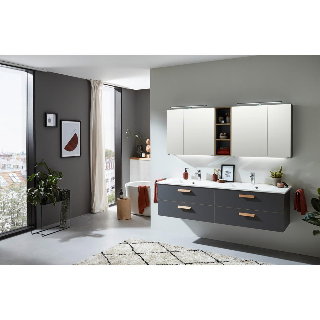 Luksuzna znamka Dieter Knoll nudi kakovostno pohištvo, zlasti notranjo opremo. Njena ponudba obsegajjedilnice, spalnice, kuhinje, kopalnice in predsobe ter ob pohištvu nudi tudi dodatke, denimo svetilke in preproge. Znamko odlikujejo minimalističen dizajn in visokokvalitetni materiali, pa tudi udobje, funkcionalnost in prilagodljivost. Kopalniški set v elegantni kombinaciji barve hrasta, sive in bele je sestavljen iz omarice za pod umivalnik, umivalnika in omare z ogledalom. Je prestižna izbira za vse, ki sestavljajo kakovostno, sodobno kopalnico, ki jim bo služila desetletja. Robustni materiali govorijo sami zase, vtis pa dopolnijo estetska dovršenost ter možnost dokupa dodatkov, denimo držala za brisače in LED osvetlitve umivalnika. Ključne prednosti: Viseča zasnova ne pomeni le olajšanega čiščenja tal, temveč tudi prihranek prostora. Visoka kapaciteta: 4 predali pod umivalnikom ter 8 nastavljivih polic v omarici z ogledalom. Sistem za mehko in tiho zapiranje predalov hrup ohranja na minimumu. Lastnosti: Dimenzije: Omarica za pod umivalnik: Širina pribl. 185 cm, višina pribl. 48,2 cm, globina pribl. 49 cm Omarica z ogledalom: Širina pribl. 185 cm, višina pribl. 70,3 cm, globina pribl. 17,3 cm Umivalnik: Širina pribl. 183 cm, d