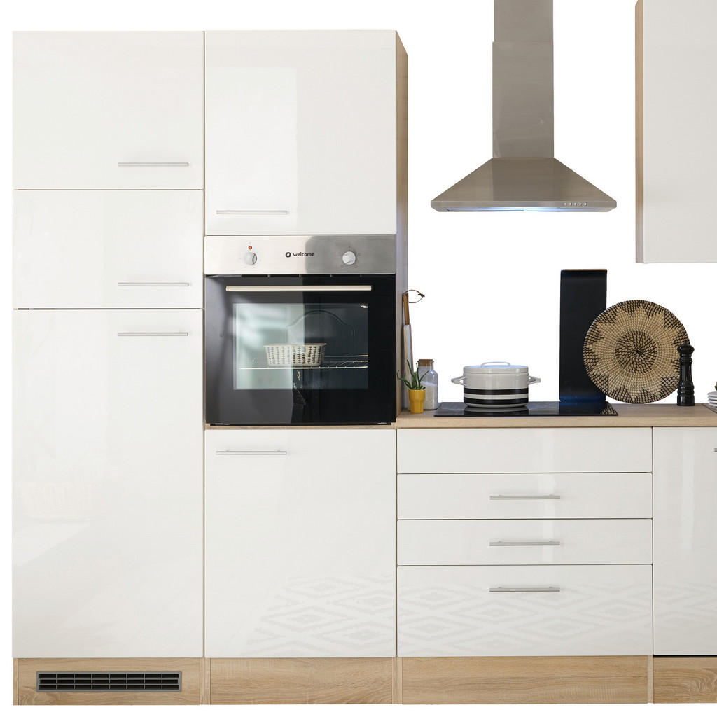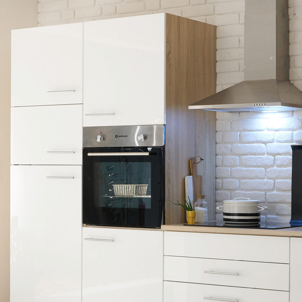 Toplina doma se začne v kuhinji Kuhinja je srce doma – prostor, kjer dan začenjamo s kavo in toplim kruhom, kjer diši po nedeljskem kosilu in kjer se pogovori med pripravo večerje pogosto spremenijo v dragocene spomine. To je prostor, kjer družina pride skupaj, kjer nastajajo recepti in kjer kuhanje postane ustvarjalni obred. V sodobnem domu kuhinja ni več le funkcionalen kotiček – postaja osrednji prostor družabnosti, estetike in udobja. Zakaj izbrati MID.YOU? Kuhinjski blok MID.YOU ponuja brezčasno eleganco in praktičnost v enem. S širino 310 cm nudi dovolj delovne površine in shranjevalnega prostora, kar omogoča enostavno organizacijo in tekoče kuhanje brez nepotrebne gneče v omaricah. Kombinacija barv – čista bela in topel hrast sonoma – ustvarja prijetno ravnovesje med modernim videzom in domačnostjo, ki lepo dopolni čisto vsak slog notranje opreme. Površina z visokim sijajem poskrbi za eleganten lesk, ki hkrati odbija svetlobo in optično poveča prostor. Čeprav električni aparati, pomivalno korito in armatura niso vključeni v dobavo, to omogoča popolno prilagoditev vašim željam in že obstoječim napravam. Ključne prednosti: Sodoben dizajn: kombinacija bele barve in dekorja v hrastu sonoma ustvarja prijeten kontrast med svežino in toplino.