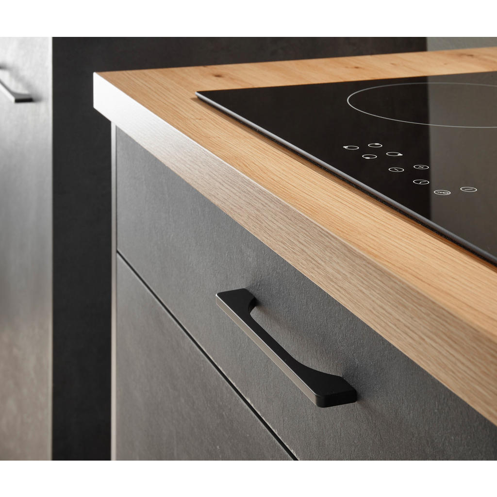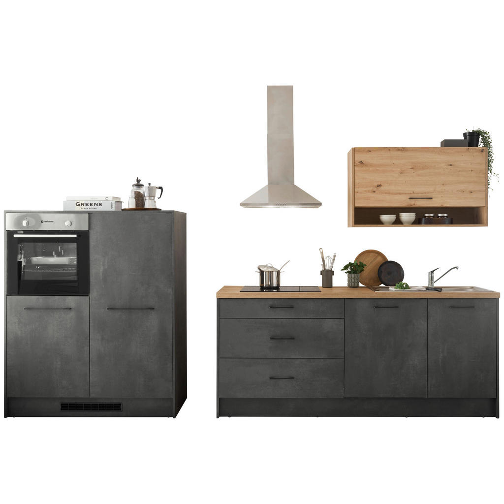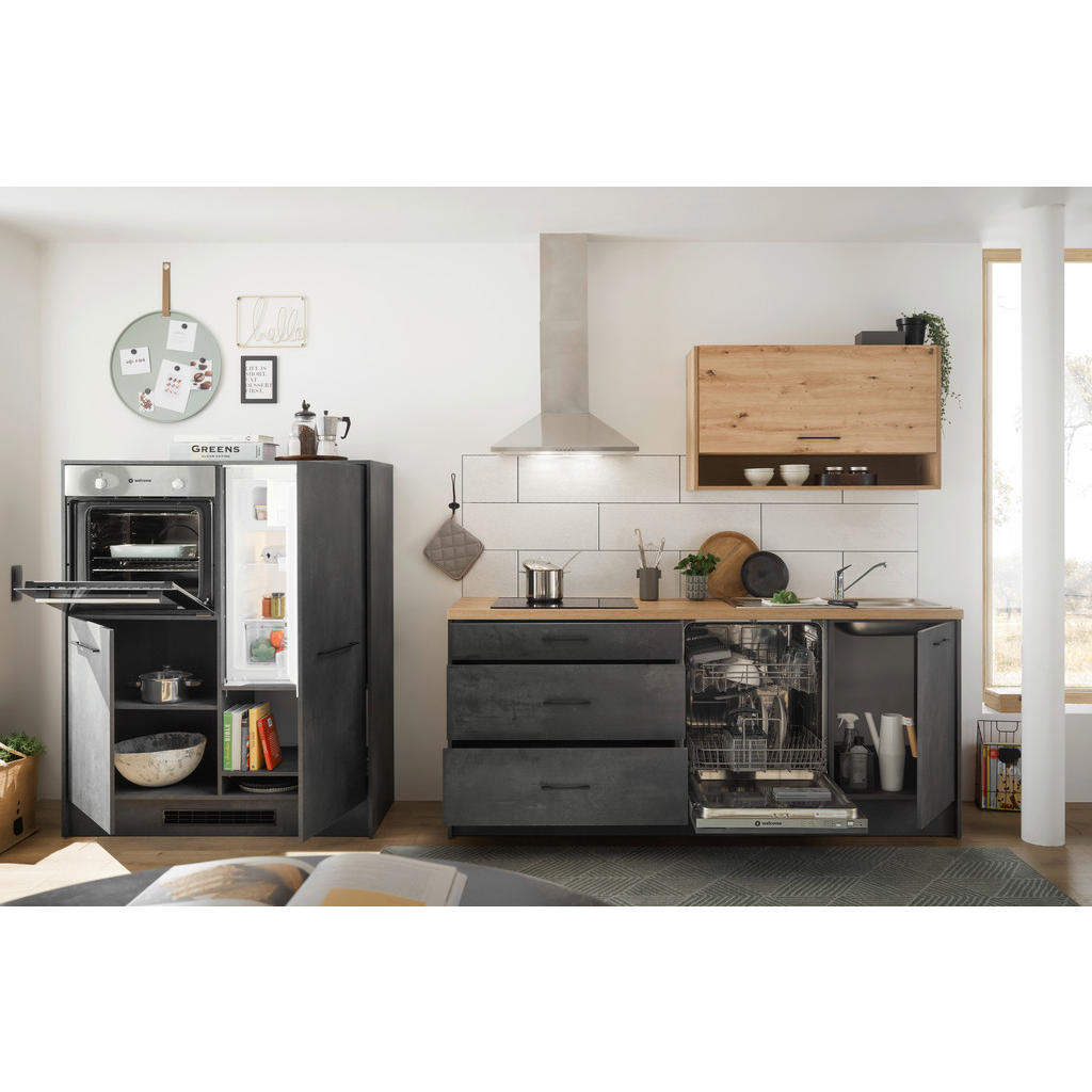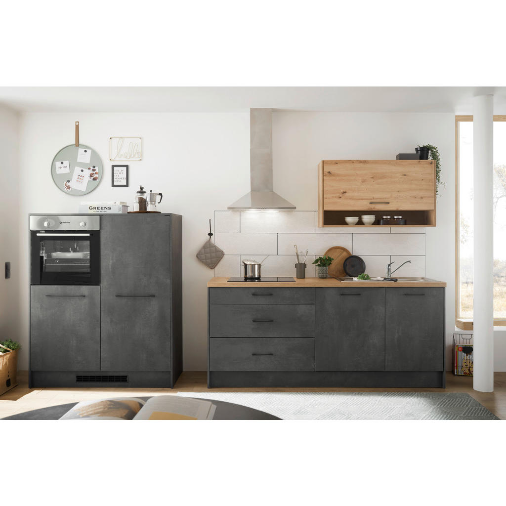 In geschmackvoller Optik begeistert dieser MID.YOU Küchenleerblock in Anthrazit und Eichefarben. Korpus samt Front präsentieren sich in einem stylishen Grau, während der Hängeschrank sowie die Arbeitsplatte in Artisan-Eichefarben für eine natürliche Note sorgen. Schwarze Stangengriffe und Sockelblenden machen den attraktiven Look perfekt. Der kulinarische Bereich bringt außerdem reichlich Stauraum mit: Hinter 3 Drehtüren und in einer Klappe räumen Sie Ihr Geschirr, Töpfe, Pfannen und weiteres Küchenequipment ordentlich ein. 3 Schubladen stehen zudem für Besteck und sonstige Küchenhelfer zur Verfügung. E-Geräte, Spüle, Armatur und abgebildete Dekoration sind nicht im Preis enthalten. Dieser Küchenleerblock in Anthrazit und Eichefarben besitzt geschmackvollen Charme mit zeitgemäßem Touch!