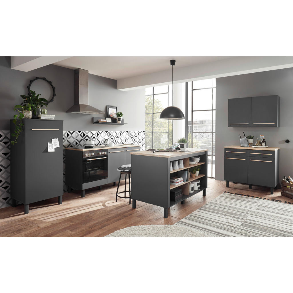 Blagovnaznamka Livetastic,katere ime lahko z nekaj domišljije prevedemo v ‘fantastičnoživljenje,’ to besedno zvezo tudi upraviči. Nudi sodobnopohištvo za širok spekter prostorov (med drugim dnevne sobe,pisarne, spalnice, jedilnice) in potreb. Kuhinja je srce vsakega doma – kraj, kjer ustvarjamo, se družimo in uživamo v okusnih jedeh. Si lahko sploh predstavljate svojo sanjsko kuhinjo brez prostornega, elegantnega in praktičnega otoka? Kuhinjski otok v barvah antracita in hrasta sonoma se zaradi elegantne zasnove poda v večino sodobnih kuhinj in jedilnic. Prostorna in robustna površina omogoča učinkovito pripravo hrane, police pa nudijo prostor za shranjevanje številnih potrebščin. Gre torej za kos pohištva, ki bo izboljšal tako izgled kot funkcionalnost vaše kuhinje. Z dimenzijami 138/90/75 cm vam ponuja obilico prostora za pripravo obrokov, ustvarjanje sladic ali sproščeno druženje ob skodelici kave – vse to na enem mestu! Ključne prednosti: Estetska dovršenost: Kombinacija antracitne barve in odtenkov hrasta se prilega različnim stilom kuhinj. Enostavno vzdrževanje: Za čistočo zadošča občasno brisanje s suho in vlažno krpo. Kompaktne dimenzije naredijo izdelek primeren tako za velike kot majhne kuhinje. Lastnosti: Dimenzije: Širina 138 c