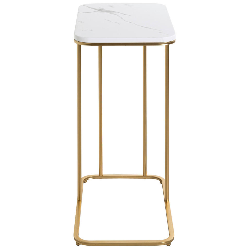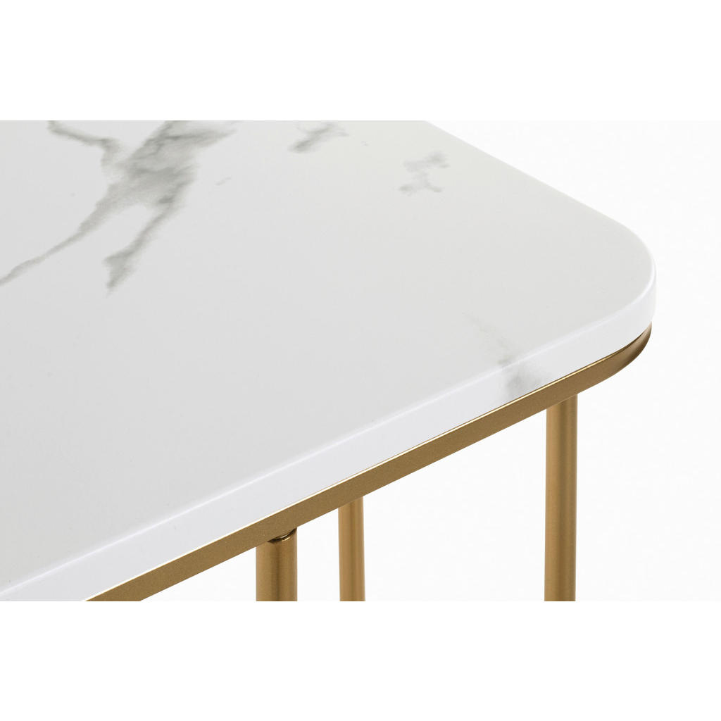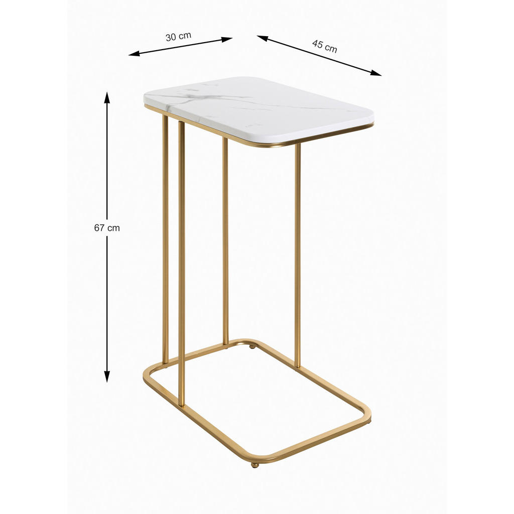 Blagovna znamka Mid.You obsega širok spekter pohištva, dodatkov za pohištvo in tekstila. Naj gre za dnevno sobo, otroško sobo, spalnico ali jedilnico, prav gotovo boste našli izdelke, ki so zelo estetsko dovršeni, a zato nič manj funkcionalni. Slogan “Sredi vašega doma.” se zaradi raznolike in kvalitetne ponudbe znamki resnično poda. Prefinjena mizica pravokotne oblike je odlična dopolnitev sodobnih jedilnic in dnevnih sob, ki si želijo nekaj več estetske dovršenosti. Kompaktna oblika in majhne dimenzije omogočajo enostavno postavitev, robustne kovinske noge pa zagotavljajo stabilnost. Ključne prednosti: Preprosto vzdrževanje: Za čistočo zadošča občasno brisanje s suho krpo. Eleganten videz: Kombinacija belega marmorja in zlatih nog ustvarja vtis prestižnosti. Kompaktnost: Majhne dimenzije naredijo izdelek prenosen in prostorsko ekonomičen. Lastnosti: Dimenzije: Dolžina 45 cm, širina 30 cm, višina 67 cm Barva: Bela, zlate barve Maks. obremenitev: Pribl. 5 kg Oblika nog: Ploska cev Debelina materiala: Pribl. 10 mm Materiali: MDF, jeklo, liti aluminij