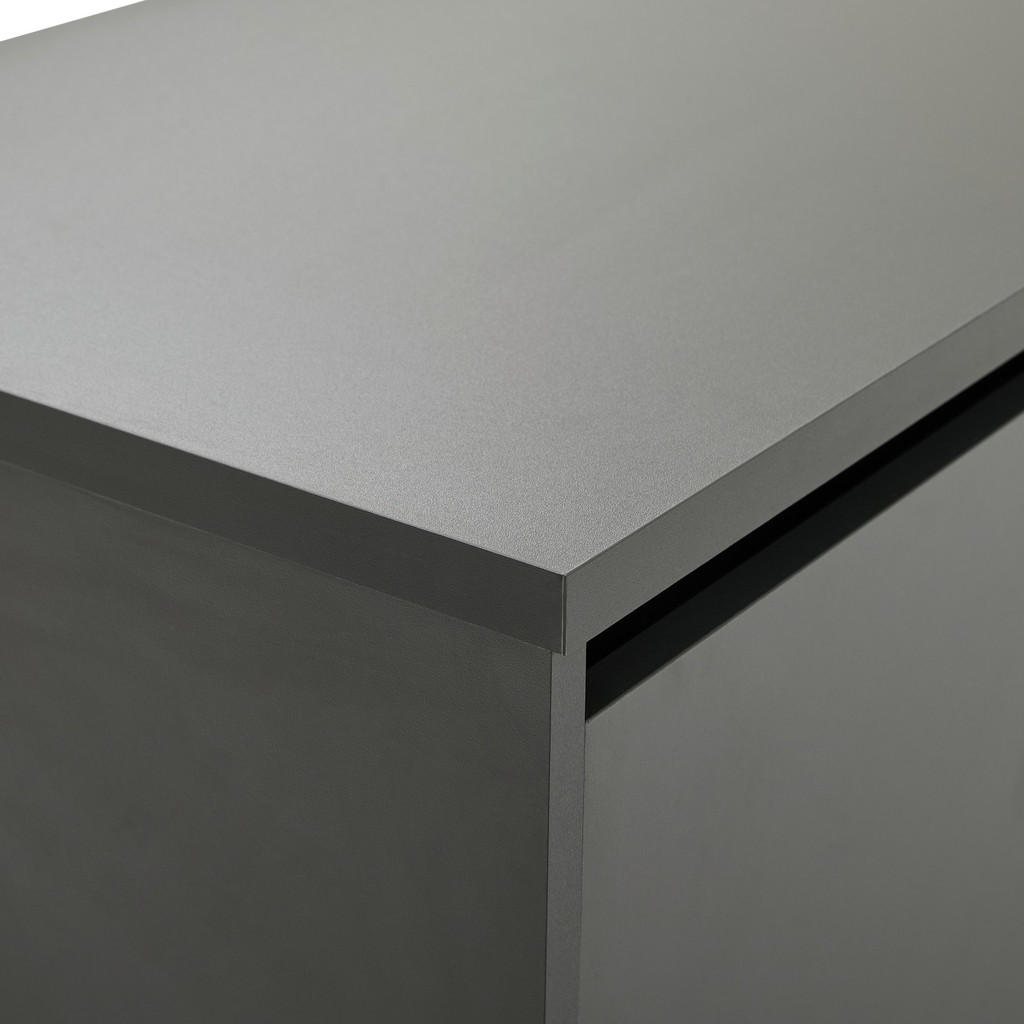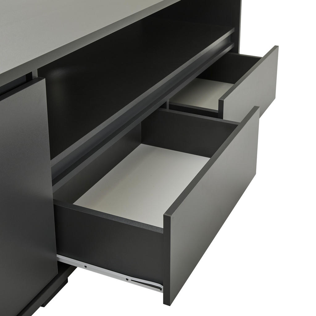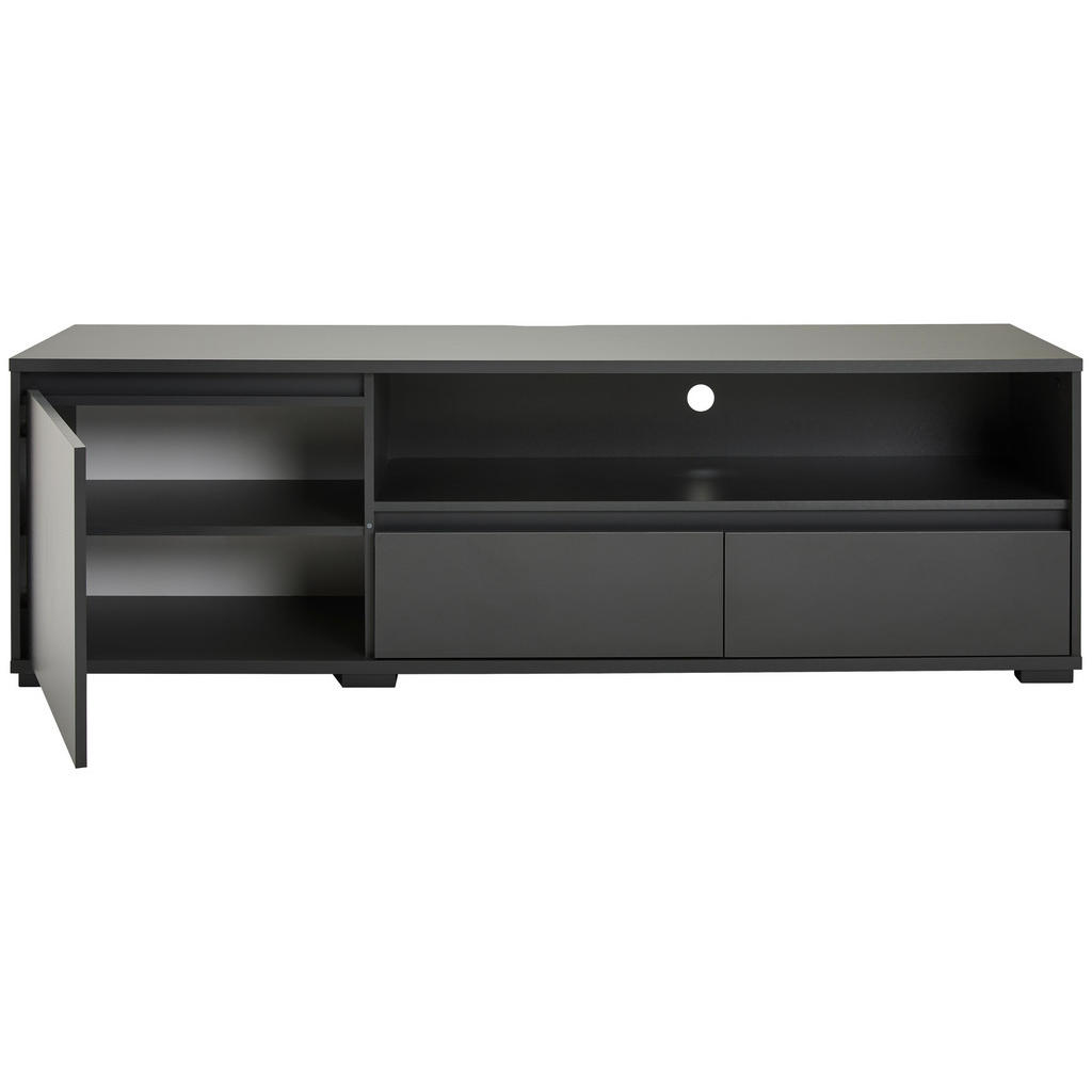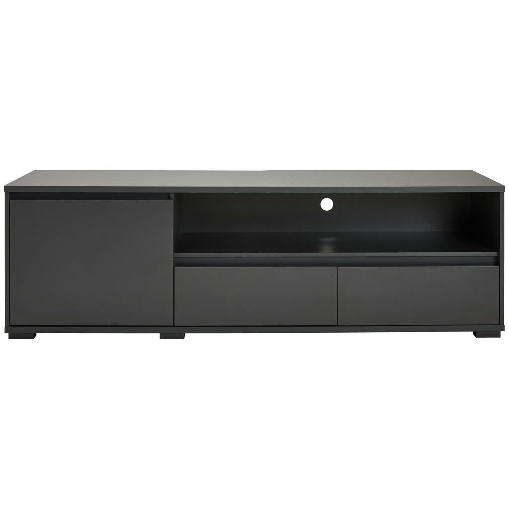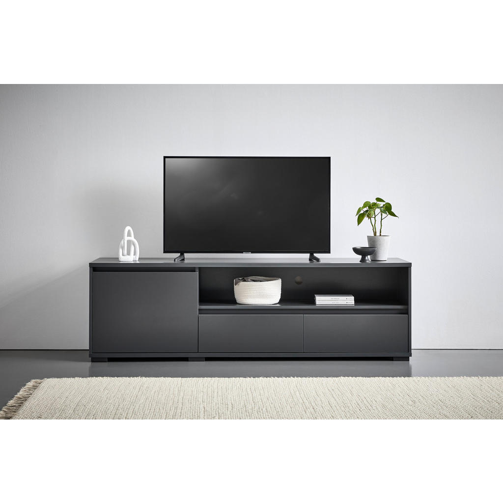 Blagovnaznamka Carryhomenudi pohištvo za vse vrste prostorov, med drugim za dnevne sobe,jedilnice, spalnice, pisarne in predsobe. Znana je po simplističnih,a slogovno dovršenih dizajnih, pestrem izboru ter odličnem razmerjumed kakovostjo in ceno. Nizka omarica z 2 zaprtima in 1 odprtim predalom ter 2 nastavljivima policama se zaradi priročne odprtine za kabel odlično poda sodobnim televizijam. Predali in police nudijo obilico prostora za shranjevanje najrazličnejših multimedijskih potrebščin, vtis pa dopolni minimalistična zasnova, zaradi katere se bo izdelek kot doma počutil v večini modernih dnevnih sob. Ključne prednosti: Nastavljive police omogočajo fleksibilno in individualizirano organizacijo prostora. Enostavna montaža, ki ne zahteva posebnih spretnosti. Kompaktne dimenzije naredijo izdelek primeren tako za večje kot manjše prostore. Lastnosti: Dimenzije: Širina 180 cm, višina 55 cm, globina 48 cm Barva: Antracit, črna Maks. obremenitev na polico: Pribl. 5 kg Debelina materiala: Pribl. 16 mm Materiali: Imitacija lesa (iverna plošča, folija z dekorjem, melamin)