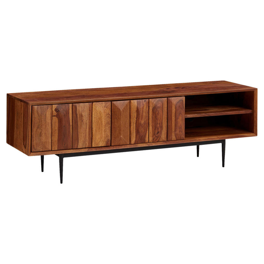 Nizka omarica MID.YOU iz masivnega lesa sheesham je unikatni oblikovalski kos, ki vsak prostor napolni s toplino naravnega lesa in ročno izdelanimi detajli. Zaradi izrazitega črtastega vzorca, naravne barve in kakovostne ročne obdelave je vsak kos edinstven ter ohranja pristno lepoto eksotičnega lesa. Funkcionalnost dopolnjuje sodoben sistem push-to-open, ki omogoča elegantno in tiho odpiranje brez ročajev. Omarica je idealna kot TV-nizka omarica ali stilski shranjevalni element v dnevnem prostoru.Ključne prednosti: Ročna izdelava – vsak kos je unikat Masiven sheesham za dolgo življenjsko dobo in naraven videz Push-to-open sistem brez ročajev Močna konstrukcija z nosilnostjo do 50 kg Elegantno črtasto pročelje za vrhunski estetski vtis Ključne prednosti Lastnosti: Dimenzije (Š/V/G): 123 × 42 × 35 cm Material: masiven sheesham (Indija), lakirana površina Ročno izdelano, vsaka omarica je edinstvena Vrata: levo in desno odpiranje 2 odprta predala: 40 × 10 × 30 cm Sistem odpiranja: push-to-open Teža: cca 24,2 kg Največja nosilnost: cca 50 kg Funkcija: stoječa omarica Ni vključeno: dekoracija Vzdrževanje: suho brisanje, brez agresivnih čistil