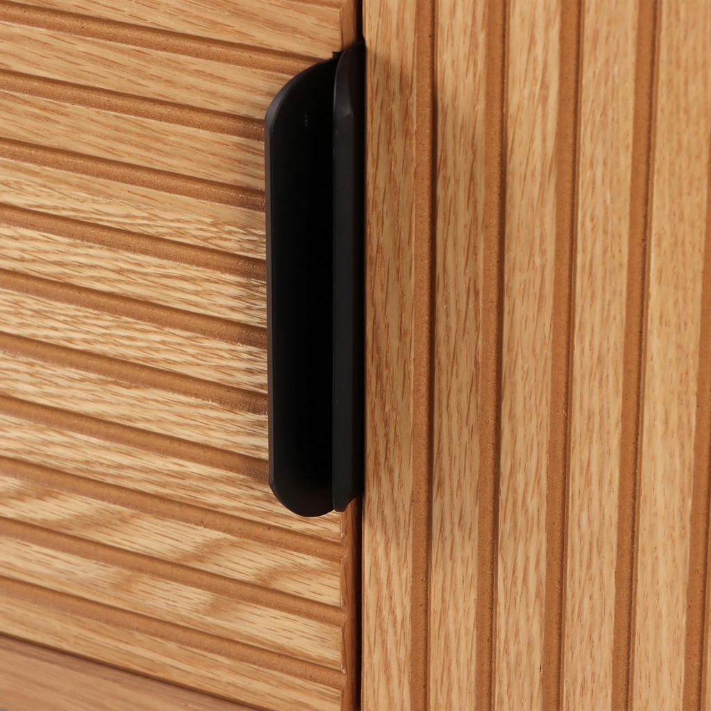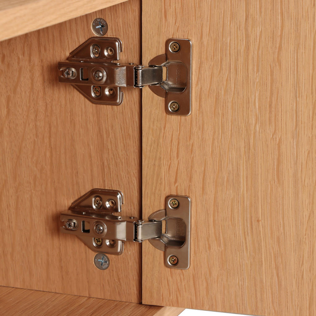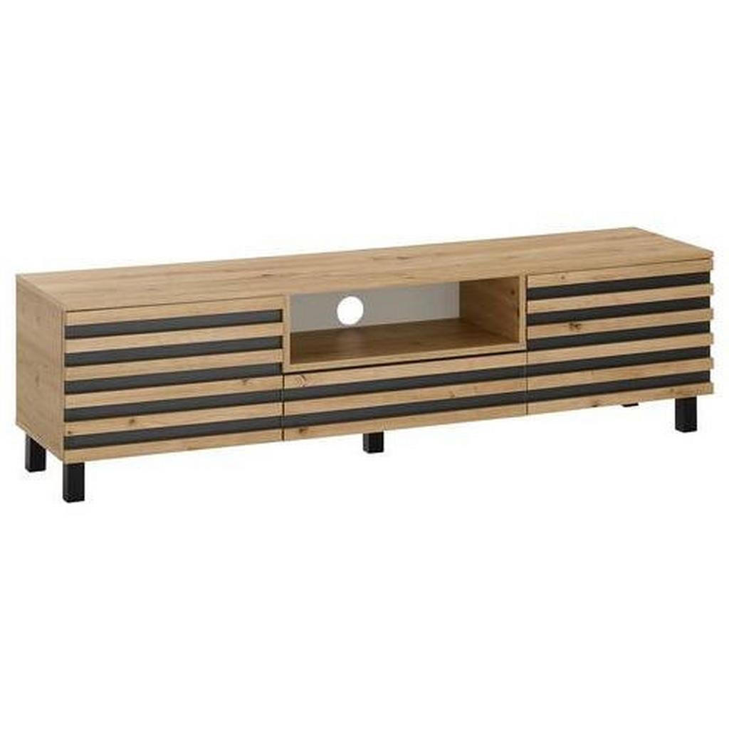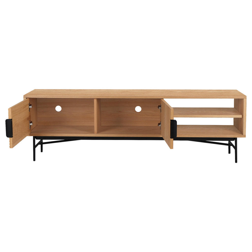 Stilska kombinacija industrijskega videza in naravnega lesa – spoznajte nizko omarico home24. Njena eleganca iz furniranega lesa in črnega kovinskega ogrodja ustvari sodoben, robusten videz, medtem ko odprti in zaprti prostori zagotavljajo praktično shranjevanje za vaš dnevni prostor. Kabelski prehod in Soft-Close predali poskrbijo za udobje in funkcionalnost vsakodnevne uporabe. Ključne prednosti: Industrijski dizajn: kombinacija furniranega lesa in črnega kovinskega ogrodja Praktična organizacija: 2 x vrata, 1 x polica in 2 x odprta predala Soft-Close sistem: tiho zapiranje vrat Robustna konstrukcija: max. obremenitev cca. 40 kg, material: MDF in kovina Fleksibilna uporaba: stoječa omarica z vključeno kabelsko rešitvijo Lastnosti:
