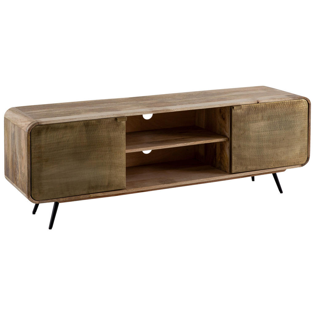 Nizka omarica znamke MID.YOU prinaša edinstveno kombinacijo naravne topline in sodobnega industrijskega značaja. Izdelana je iz masivnega mangovega lesa, ki z izrazito strukturo naredi vsak kos unikaten. Kontrast med toplim rjavim lesom in elegantnimi zlatimi kovinskimi detajli ustvarja prestižen videz, ki izstopa v vsakem prostoru. Ključne prednosti: izdelava iz masivnega mangovega lesa za naraven in avtentičen videz ročno izdelan kos, vsak izdelek je unikaten elegantni zlati kovinski poudarki na vratih in ročajih kombinacija zaprtih in odprtih shranjevalnih prostorov stabilne kovinske noge z večjo talno oddaljenostjo za zračen videz delno montirana dobava za hitro in enostavno sestavljanje Lastnosti izdelka
