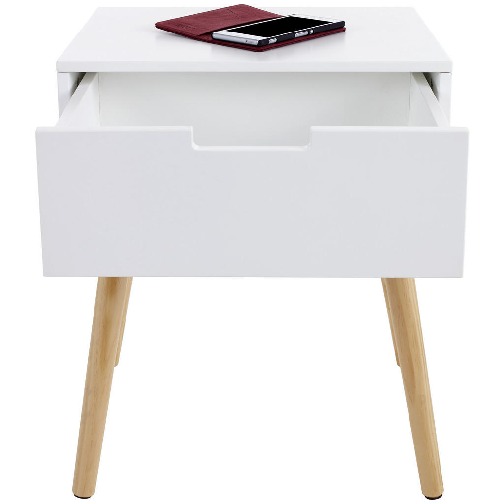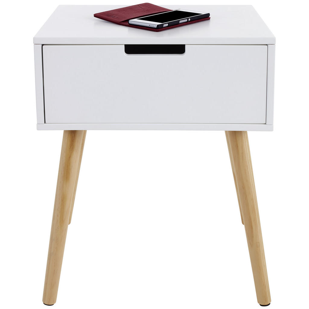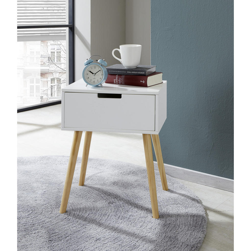 Mit diesem LIVETASTIC Nachttisch mit Schublade im Skandi-Stil holen Sie sich ein entspanntes Flair in Ihr Schlafzimmer. Nordische Gelassenheit wird von der hellen Farbgebung in Kombination mit den Füßen aus massiver Kiefer erzeugt. Im Schubfach mit Komfortauszug bekommen Sie Handcreme, Taschentücher und Co. griffbereit unter, während auf der Ablagefläche des rund 40 x 52 x 30 cm (B x H x T) großen Möbels Wasserflasche oder Wecker ihren Platz finden. So haben Sie mit diesem Nachttisch mit Schublade im Skandi-Stil alles für eine angenehme Nachtruhe in unmittelbarer Nähe!