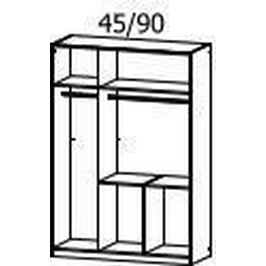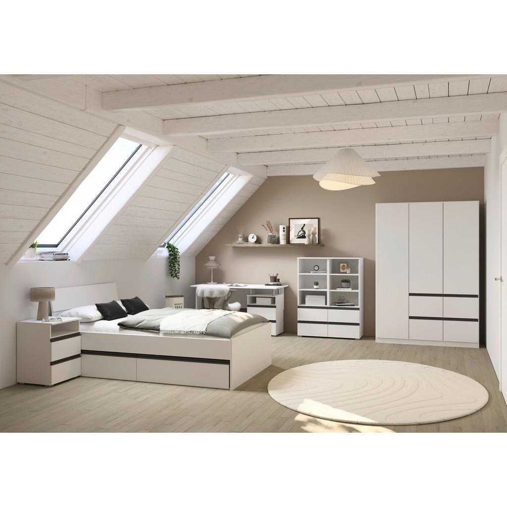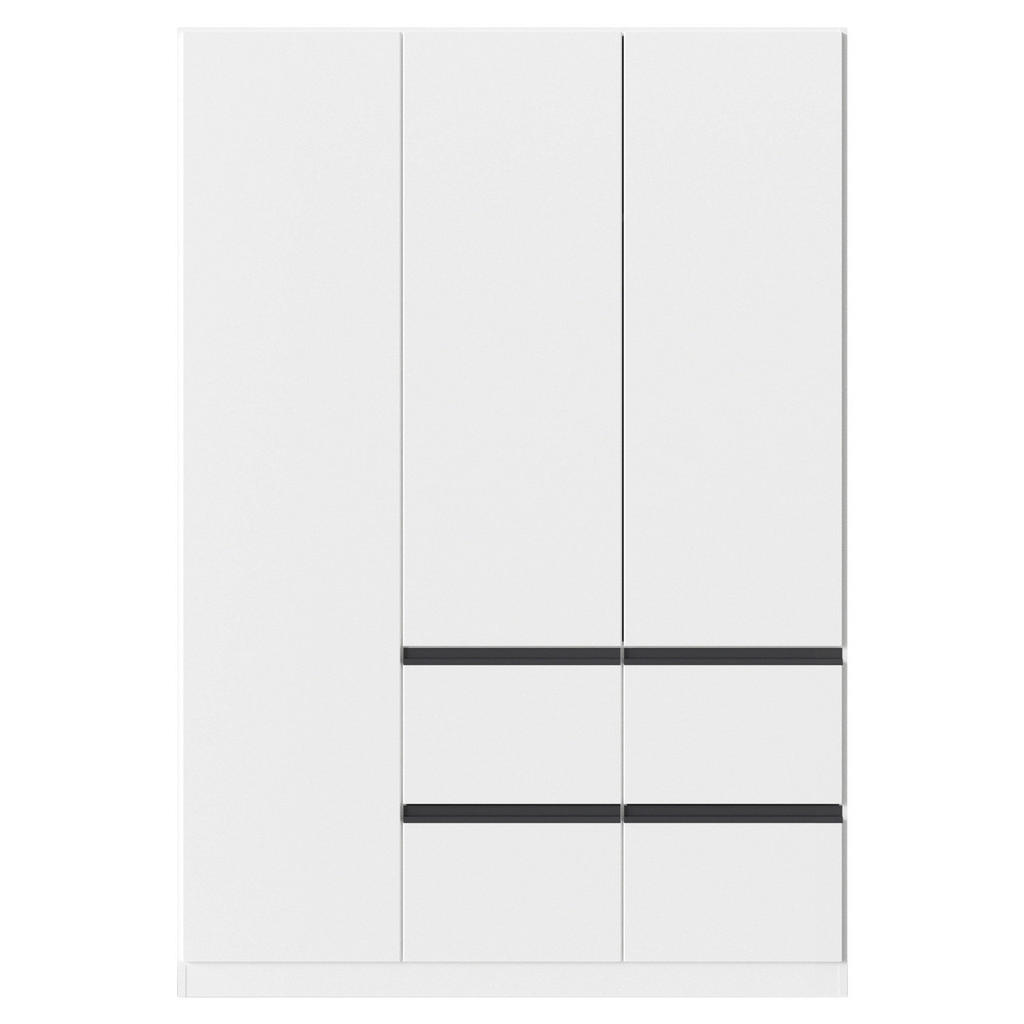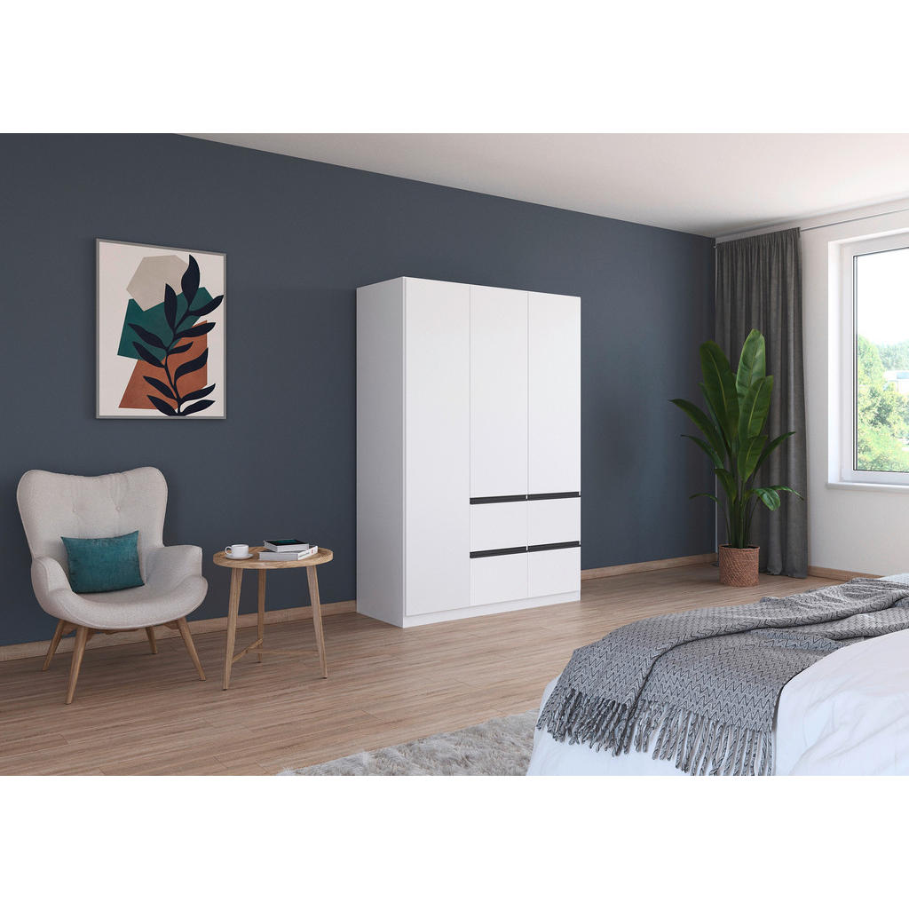 Blagovna znamka Xora nudi stanovanjsko pohištvo: ne jamči samo trenutne, temveč tudi dolgoročno kakovost. Njena izredno široka ter fleksibilna ponudba obsega dnevne sobe, jedilnice, spalnice, predsobe ter kopalnice in bo zagotovo zadostila vsakomur, ki sestavlja prvi dom. Elegantna garderobna omara v barvah bele in temno sive nudi praktično rešitev za shranjevanje oblačil in garderobnih dodatkov. 3 klasična vrata na tečajih in 4 predali nudijo veliko prostora kvalitetna imitacija lesa (iverna plošča z lakirano površino) pa izdelku zagotavlja dolgo življenjsko dobo. Ključne prednosti: Enostavno vzdrževanje: Za čistočo zadošča občasno rahlo brisanje z vlažno krpo. Estetska dovršenost: Elegantna kombinacija bele in temno sive barve se poda širokemu spektru sodobnih notranjih prostorov. Izdelek je na voljo v različnih velikostih in dekorjih. Lastnosti: Dimenzije: Širina 136 cm, višina 197 cm, globina 54 cm Barva: Bela, temno siva Maks. obremenitev na polico: Pribl. 10 kg Debelina materiala: Pribl. 16 mm Število drogov za obešanje oblek: 2 Materiali: Imitacija lesa (iverna plošča s potiskano površino)