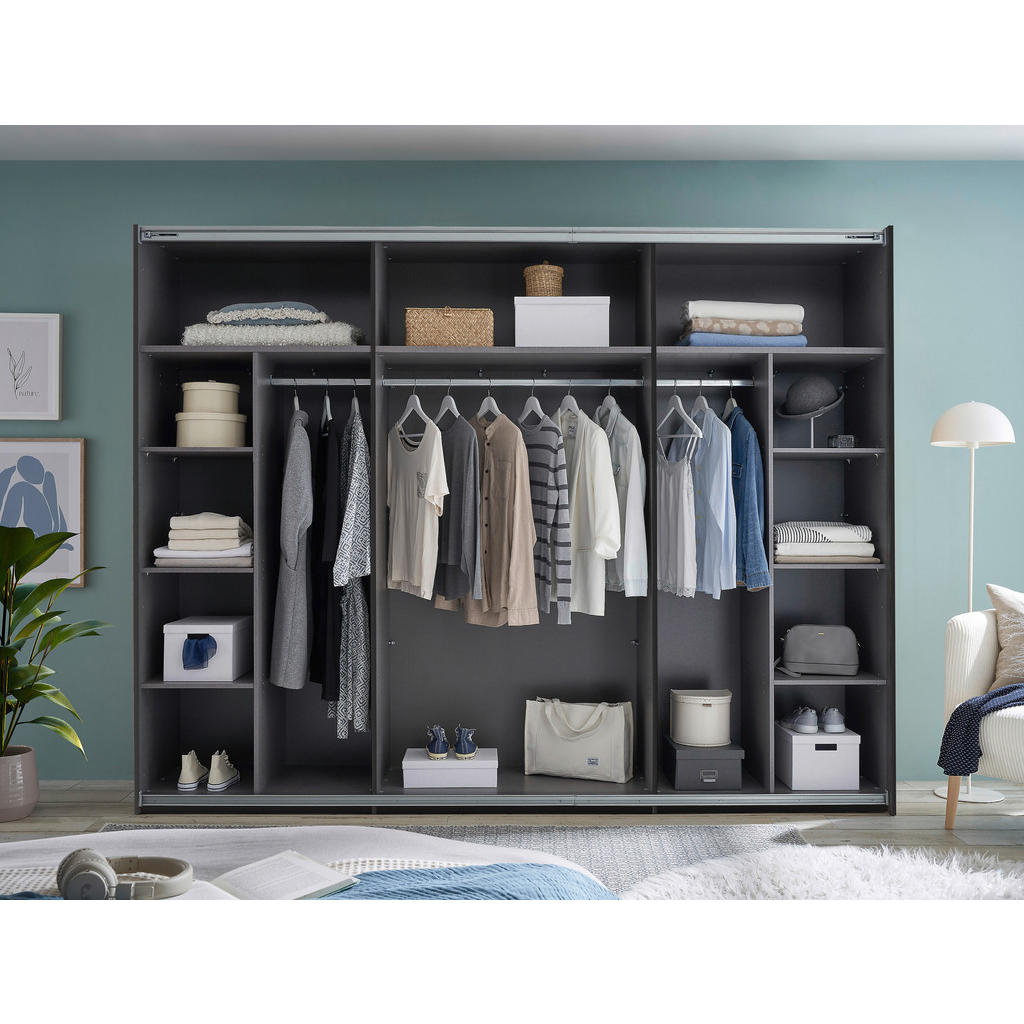 Omara Livetastic je odlična izbira za prostorne garderobe, saj z dimenzijami ca. 270 × 210 × 60 cm ponuja obilico prostora za shranjevanje. Njena moderna in elegantna barva grafit daje prostoru moderen in sofisticiran pridih. Znotraj vas čakajo 3 obešalne palice, kar pomeni večjo fleksibilnost pri obešanju oblačil, ter 9 polic, od katerih je kar 6 nastavljivih, za optimalno prilagoditev glede na vaše potrebe. Kakovostna izdelava in premišljena zasnova omogočata ureditev garderobe, ki je tako funkcionalna kot estetsko dovršena. Površine so obdelane s trpežno dekor folijo, kar olajša vzdrževanje in čiščenje. Če želite omaro, ki združuje dizajn in praktičnost, je to prava izbira za vaš dom. Ključne prednosti: Prostorna velikost – približno 270 cm širine in 210 cm višine omogoča veliko shranjevalnega prostora. Elegantna grafit barva za sodoben videz, ki se ujame z različnimi notranjimi stili. Izjemna fleksibilnost notranjosti – 3 obešalne palice in 9 polic (6 nas