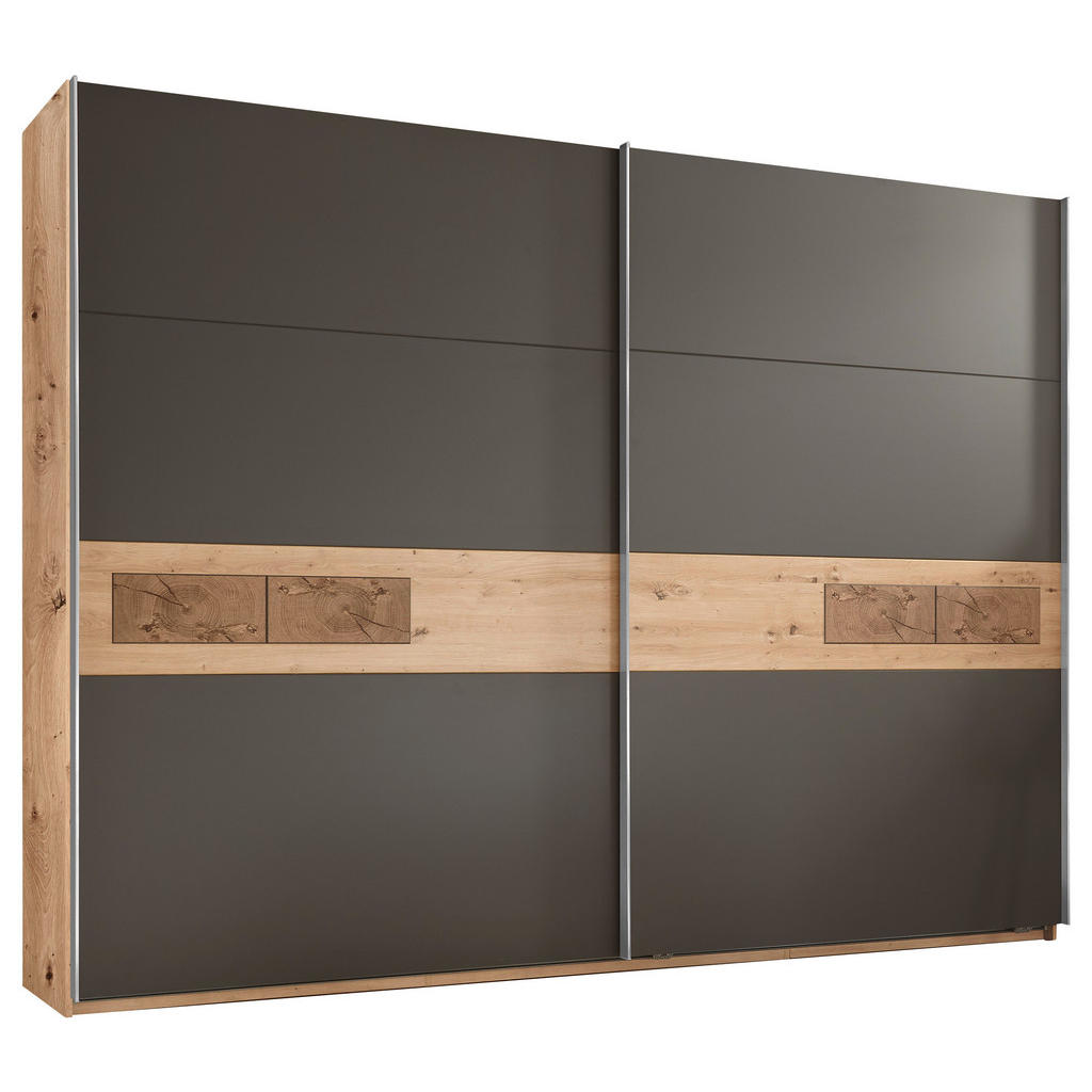 Omara Carryhome je elegantna in prostorna omara z drsnimi vrati, ki združuje sodobno grafitno barvo z detajli iz Artisan hrasta. Primerna je za spalnice ali garderobe, kjer je potreben prostor za obešanje oblačil in minimalističen dizajn. Primerna je za tiste, ki iščejo prostorno, robustno in stilsko usklajeno omaro z drsnimi vrati, kjer kombinacija grafitne barve in hrastove imitacije prinaša eleganten in sodoben videz. Ključne značilnosti: Drsna vrata – vrata se premikajo po vodilu, kar prihrani prostor pri odpiranju Notranjost: 1 nenastavljiva polica in 1 garderobna palica Material: imitacija lesa (plošča) z dekor folijo, ročaji iz aluminija Barve: grafit in Artisan hrast Vzdrževanje: suho brisanje Transport in montaža: dostavljena razstavljena, montaža zahteva ročne spretnosti, transport s kombijem ali manjšim transporterjem Tehnične lastnosti: Dimenzije: 250 × 215 × 63 cm (Š × V × G) Število polic: 1 (neprestavljiva) Število garderobnih palic: 1 Soft-Close sistem zapiranja in odpiranja: ne