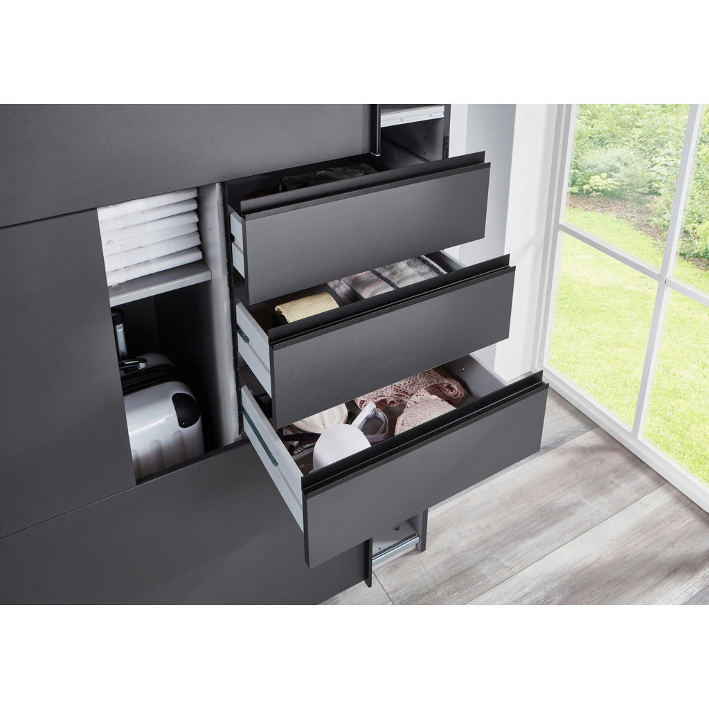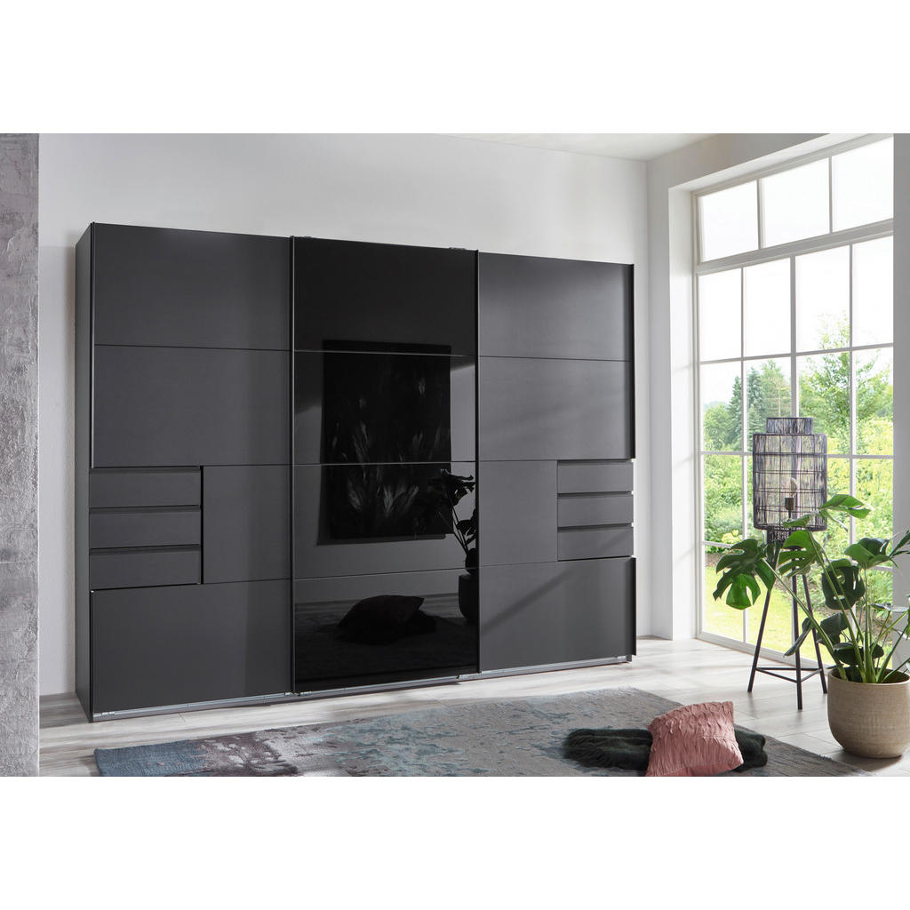 Odkrijte izjemno omaro, ki s širino približno 270 cm, višino 208 cm in globino 64 cm prinaša obilico prostora za vašo garderobo. V dekorju grafit z učinkom modernosti in robustnosti v kombinaciji s kakovostno izdelavo “Made in Germany”, navdušuje tako z videzom kot funkcionalnostjo. Model vključuje 3 drsna vrata, 6 oblikovnih predalov, 6 nastavljivih polic in 2 obešalni palici, kar omogoča popolno prilagoditev vašim shranjevalnim potrebam. Notranjost je zasnovana za preglednost in udobje, medtem ko zunanji dekor in tipkovno zasnovan ročajni element dopolnjujejo sodoben videz. Ta omara združuje maksimalno prostornino in premišljen dizajn — popolna izbira za stilno urejeno spalnico. Ključne prednosti: Obsežna širina cca. 270 cm omogoča veliko shranjevalnega prostora in poudari eleganco spalnice. Modern dekor grafit za topel, a sodoben videz, ki se ujame z različnimi stili opreme. 3 drsna vrata za prihranek prostora in nevpadljivo upo