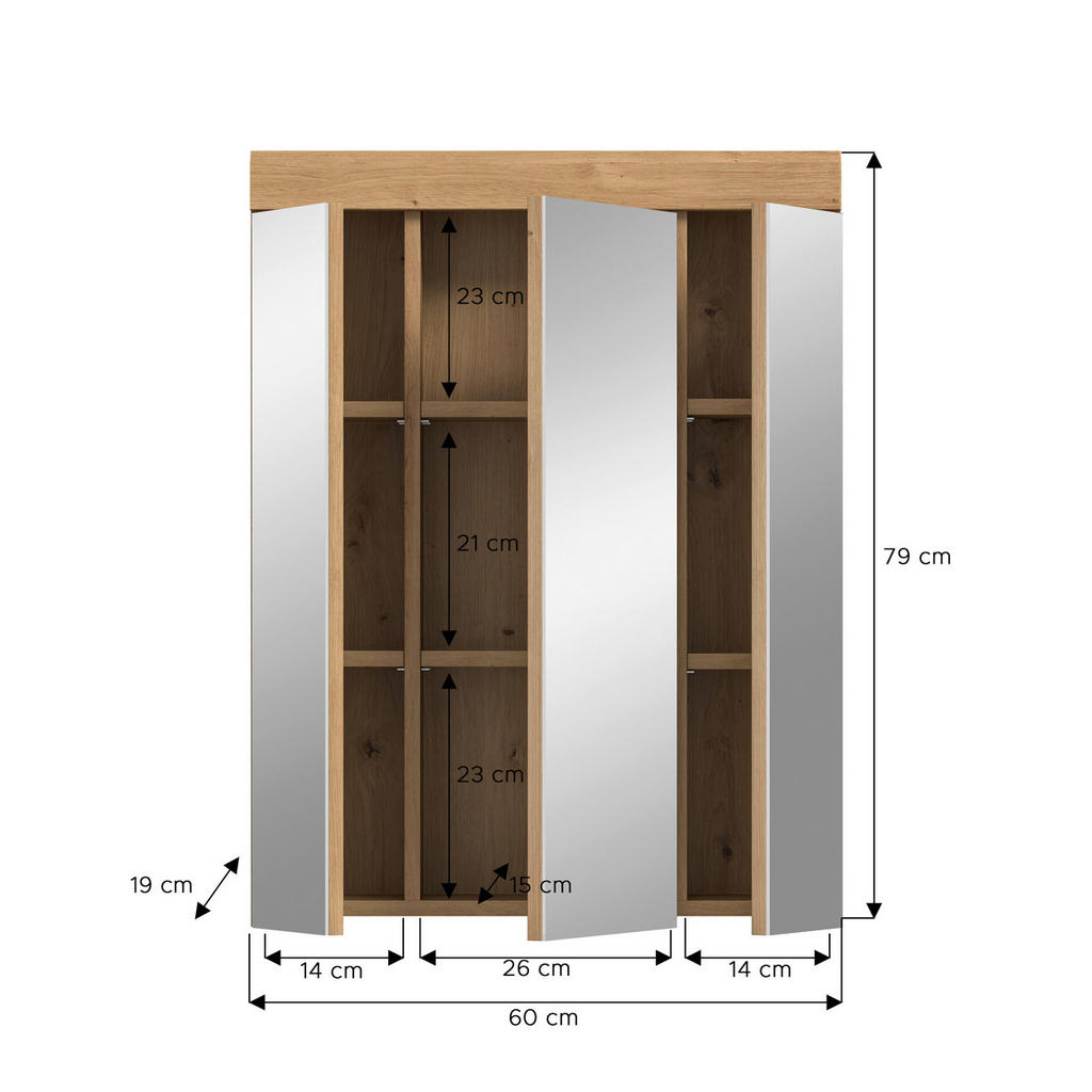 Sodobna kopalnica si zasluži pohištvo, ki združuje funkcionalnost in brezčasen slog – točno to prinaša omara z ogledalom v elegantni barvi hrasta Artisan. Trije prostorni deli za shranjevanje s skupno 6 nastavljivimi policami ponujajo dovolj prostora za vso kozmetiko, čistila in druge kopalniške pripomočke. Velika ogledala na vratih zagotavljajo priročno uporabo pri vsakodnevnih rutinah, hkrati pa optično povečajo prostor in vnesejo več svetlobe v vašo kopalnico. Zahvaljujoč kompaktnim dimenzijam (Š/V/G: 60/79/18 cm) se omara lepo prilega tudi manjšim prostorom, obenem pa s svojo toplo barvo hrasta prinaša pridih naravne elegance. Izdelana je iz kakovostnega lesnega materiala z melaminsko zaščito, ki zagotavlja odpornost in enostavno čiščenje. Omara je dobavljena razstavljena, kar olajša prevoz in montažo. Ključne prednosti: Elegantna izvedba v barvi hrasta Artisan 3 ogledala, ki vizualno povečajo prostor 6 nastavljivih polic za organizirano shranjevanje