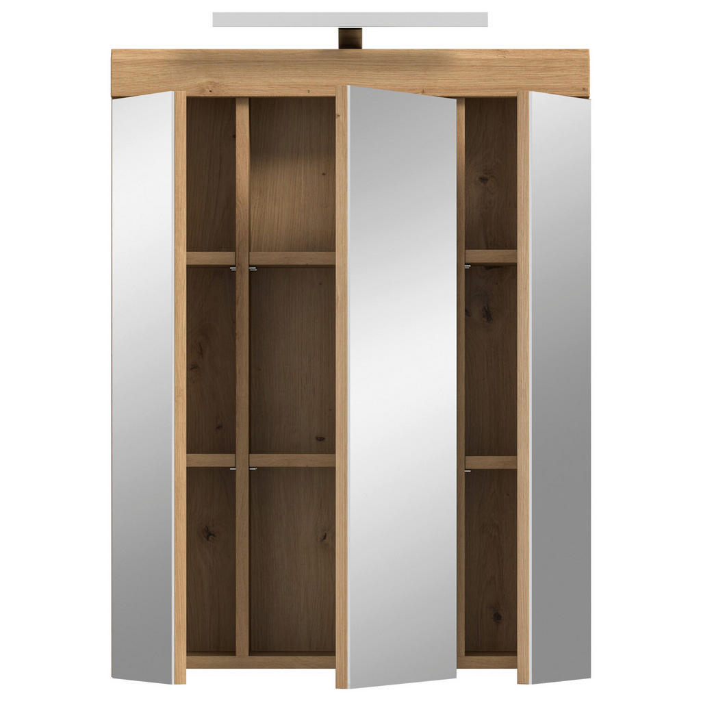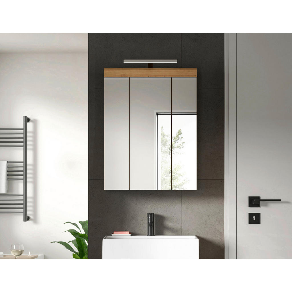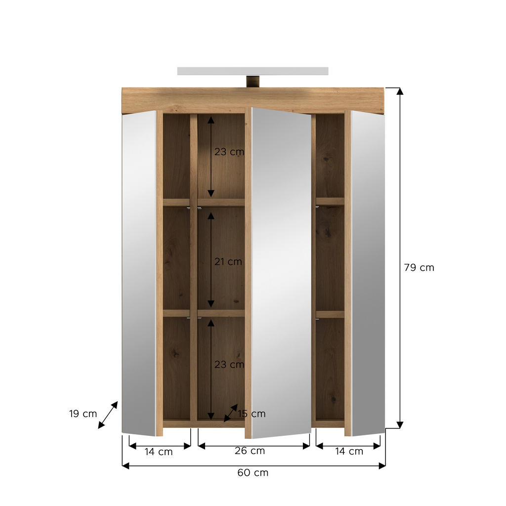 Odkrijte popolno združitev elegance, funkcionalnosti in sodobne tehnologije z omarico z ogledalom v barvi hrasta Artisan, ki vključuje tudi vgrajeno osvetlitev. Ta praktična kopalniška rešitev vam ponuja kar 6 nastavljivih polic, s katerimi boste z lahkoto pospravili vse svoje lepotne in negovalne pripomočke. Veliko ogledalo s tremi vrati ne služi le svojemu namenu, temveč prostoru doda občutek prostornosti in svetlobe. Integrirana osvetlitev pa zagotavlja popolne pogoje za vsakodnevno nego obraza, ličenje ali britje – brez dodatne napeljave. Izdelana iz kakovostnega lesnega materiala z melaminsko zaščito, je omara odporna na vlago in preprosta za čiščenje. Zaradi svojih kompaktnih dimenzij (Š/V/G: 60/79/19 cm) se lepo prilega tako prostornim kot manjšim kopalnicam. Ključne prednosti: Elegantna izvedba v barvi hrasta Artisan z velikim ogledalom Vključena vgrajena osvetlitev za popolno udobje 6 nastavljivih polic za urejeno shranjevanje