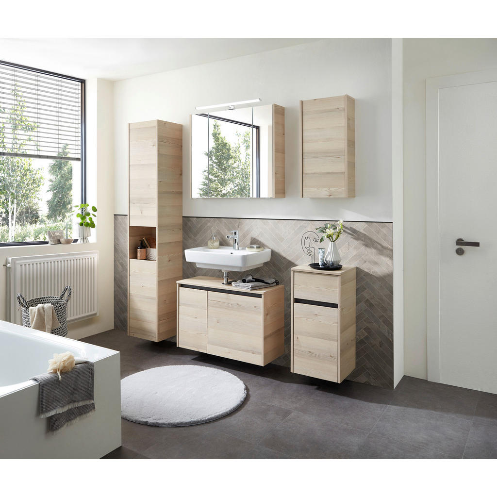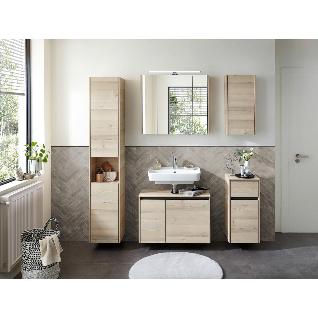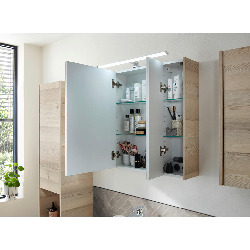 Blagovnaznamka Xoranudistanovanjsko pohištvo: ne jamči samo trenutne, temveč tudidolgoročno kakovost. Njena izredno široka ter fleksibilna ponudbaobsega dnevne sobe, jedilnice, spalnice, predsobe ter kopalnice in bozagotovo zadostila vsakomur, ki sestavlja prvi dom. Trpežna, funkcionalna viseča omara z ogledalom prepriča s 6 nastavljivimi policami, ki omogočajo shranjevanje in organizacijo najrazličnejših predmetov. Viseča zasnova in vključena LED osvetlitev dodatno poudarita lepoto izdelka, kvalitetni materiali pa mu zagotavljajo dolgo življenjsko dobo. Ključne prednosti: Vključena LED osvetlitev dodatno poudari estetsko dovršenost izdelka. Nastavljive police omogočajo fleksiblino in individualizirano organizacijo prostora. Enostavno vzdrževanje: Za čistočo zadošča občasno brisanje z vlažno krpo. Lastnosti: Dimenzije: Širina 80 cm, višina 70 cm, globina 20,5 cm Barva: Barve pinije, barve kroma Maks. obremenitev na polico: Pribl. 3 kg Debelina materiala: Pribl. 5 mm Materiali: Kovina, zrcalno steklo, imitacija lesa (iverna plošča) Površina: Prevlečeno z melaminsko smolo