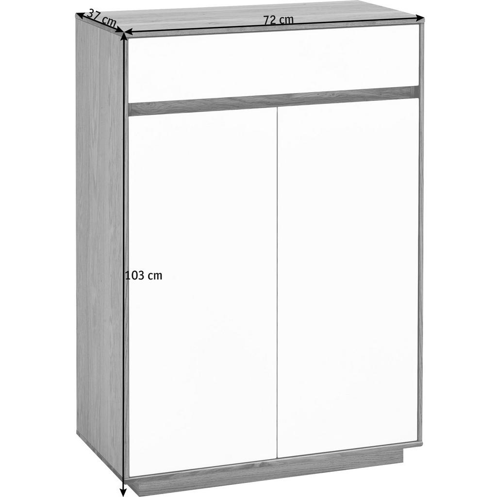 Predsobo ali hodnik lahko opremite s kakovostnim pohištvom, ki botudi funkcionalno in vam bo ponujalo veliko shranjevalnega prostora inodlagalne površine. Razne omare, regali, paneli in komode sonepogrešljivo pohištvo. Ne pozabite tudi na kakšno površino za sedenjein praktično ogledalo. Omara za čevlje je del znamke Novel.Znamka ponuja kakovostne kose, ki se ponašajo z dovršenim videzom in sebodo lepo podali v vaš dom. Odlikuje jo eleganca in visokafunkcionalnost ter kakovost. Izdelana je iz kakovostnih materialov vvidezu hrasta Bianco. Bele lakirane fronte jo lepo dopolnijo. Omara se ponaša s preprostim, a lepim videzom. Ima dvoje vrat, za katerimi je dovolj prostora za shranjevanje vaših predmetov in dodatkov. Še več dodatega prostora omogoča predal. Dimenzija: 72x103x37 cm