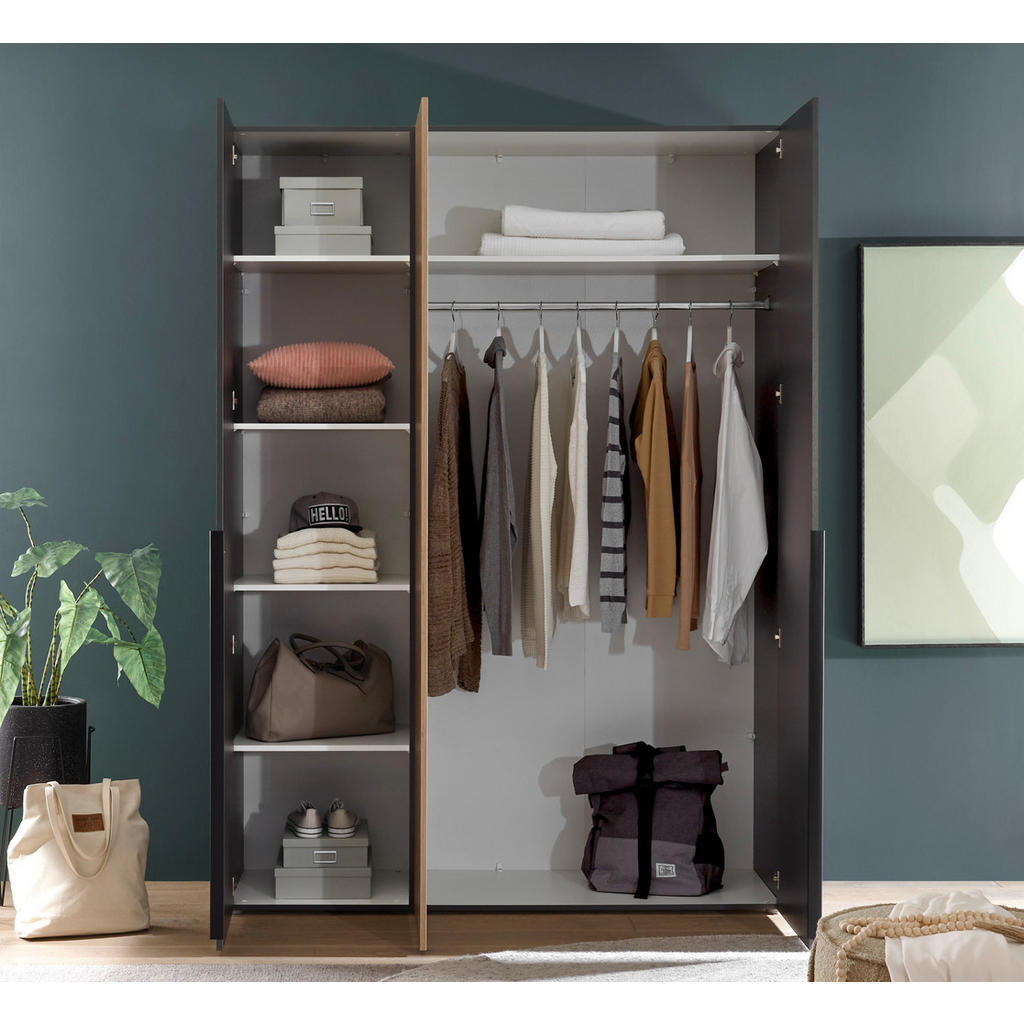 Omara Carryhome je popolna izbira za vsakogar, ki išče funkcionalen in estetski kos pohištva, ki ne ponuja zgolj veliko prostora za shranjevanje, temveč tudi prispeva k elegantnemu videzu vašega prostora. S kombinacijo grafitne barve ter melaminsko obdelane površine omara prinaša sodoben in naraven videz, ki se bo odlično podal v vsak prostor. S 3 prostornimi vrati in 5 policami boste imeli dovolj prostora za vsa vaša oblačila, dodatke in druge predmete. Palice za obešanje in predali so zasnovani za maksimalno udobje in enostavno uporabo. Ključne prednosti: Sodobna barvna kombinacija: Grafitna barva ustvarja moderen, a umirjen videz Funkcionalno shranjevanje: 5 polic in 1 palica za obešanje omogočata optimalno organizacijo Enostavna montaža: Za montažo ni potrebna posebna strokovnost, kar omogoča hitro postavitev omare
