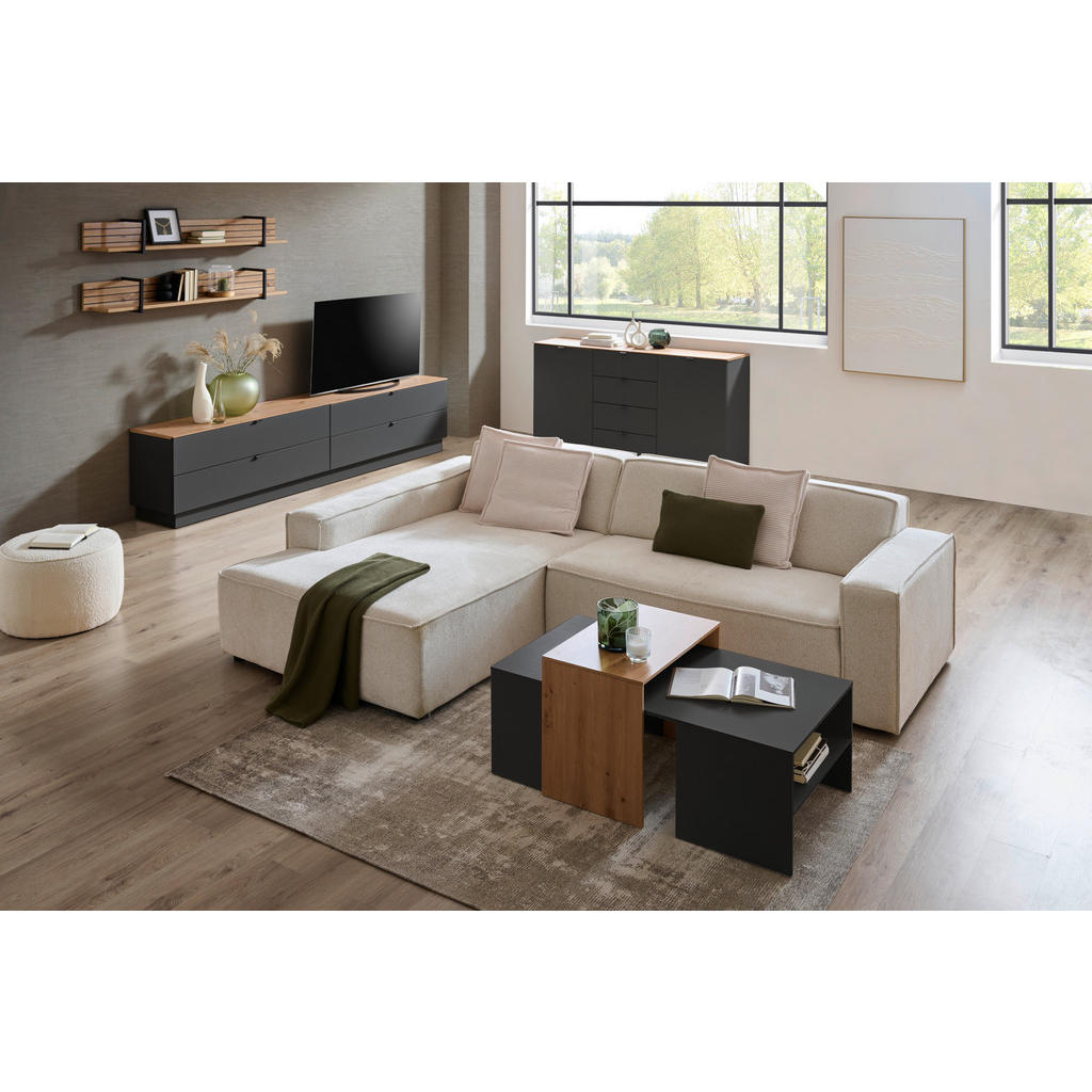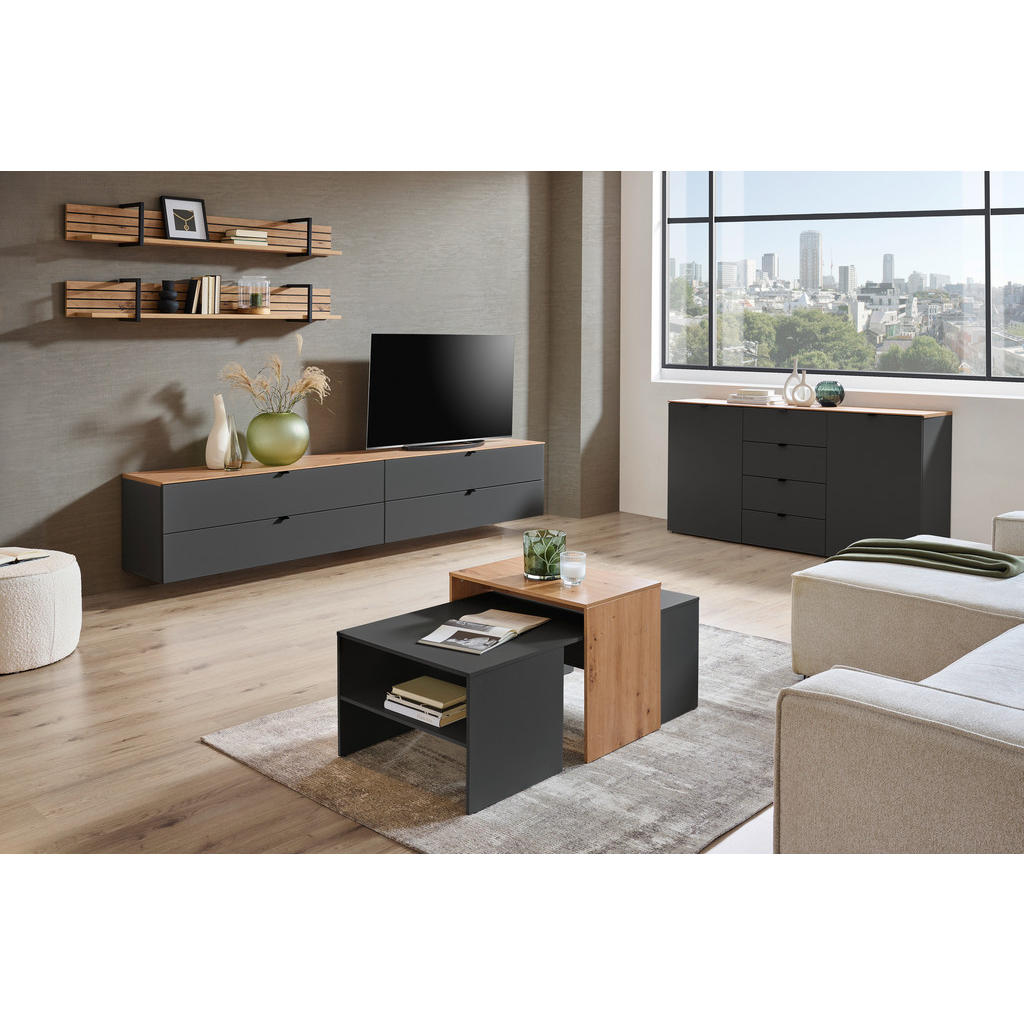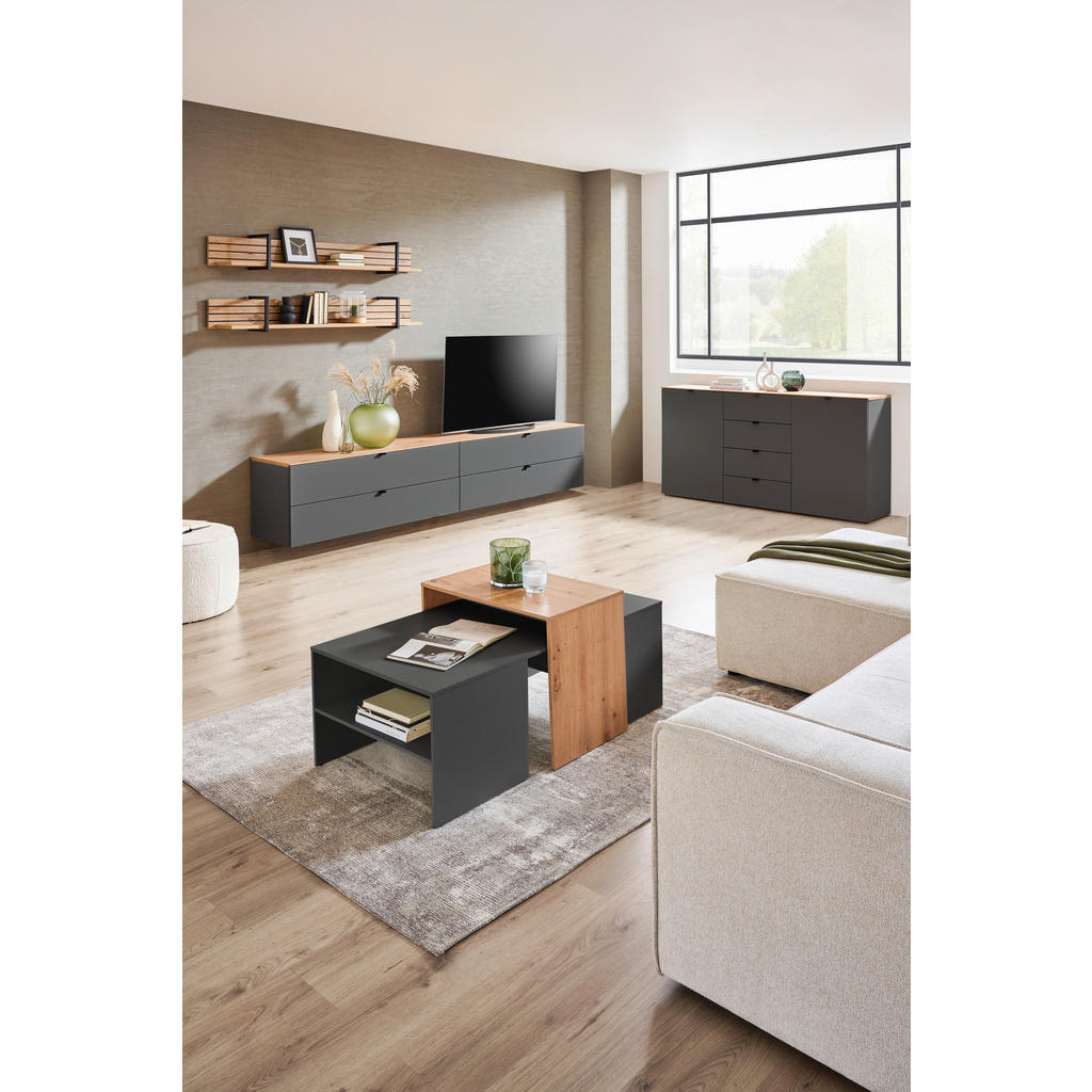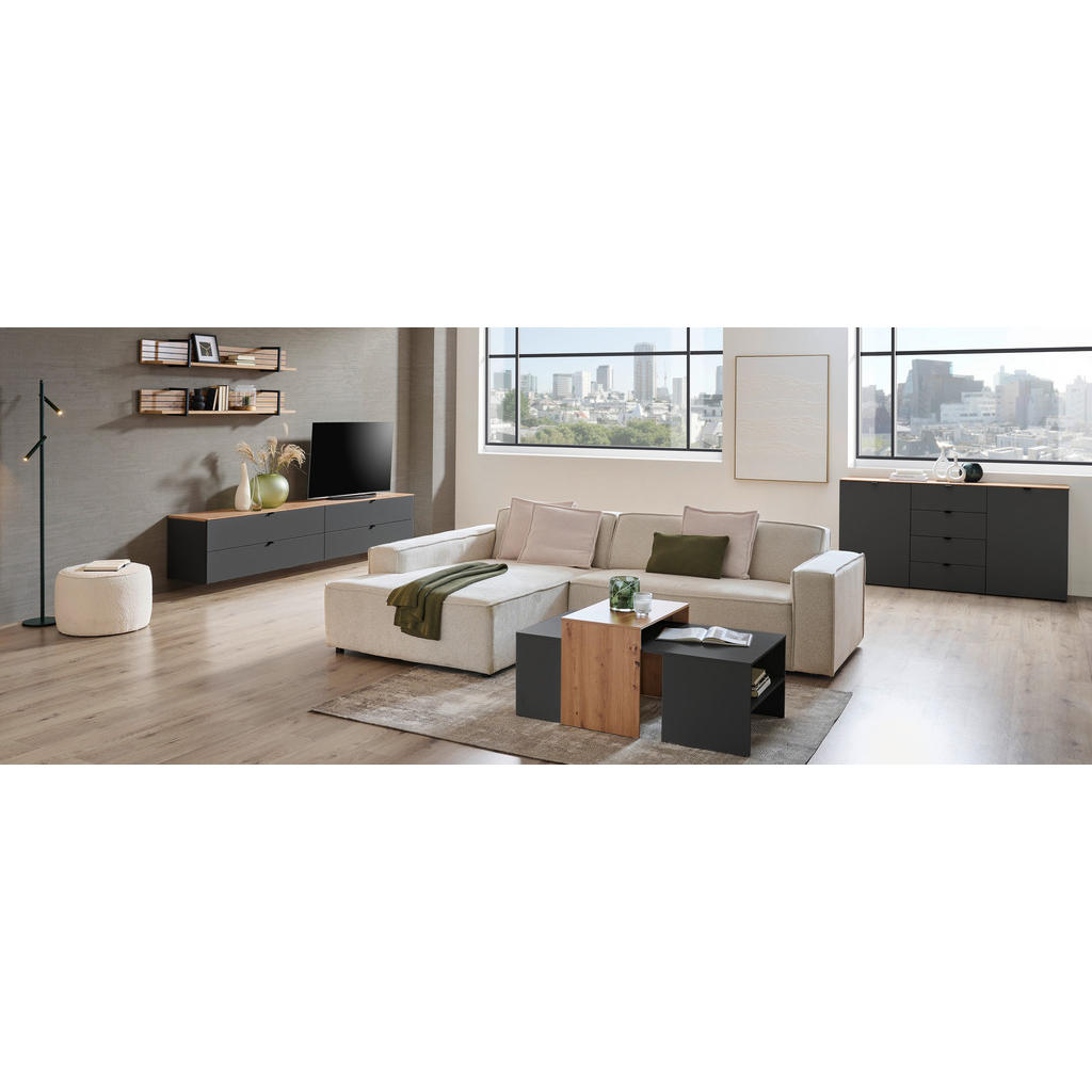 Do popolno opremljenega doma z našo pomočjo! Naj vaš dom zasije v popolnoma novi, drugačni luči. Zakaj bi odlašali? Naj dnevna soba zažari s pomočjo izbranega pohištva, oblikovanega v vašem stilu! Popolna kombinacija modernega dizajna in prostorne rešitve – regal Hom’in v barvah grafita in hrasta artisan bo vsakemu dnevnemu prostoru prinesel sodoben in topel videz. Z dimenzijami 280 × 174 × 44 cm nudi obilo prostora za televizijo, knjige, dekoracijo in druge vsakdanje predmete. Izdelan je iz kakovostne iverne plošče, ki zagotavlja trdnost in dolgo življenjsko dobo. Regal je opremljen z veliko shranjevalnega prostora za organizacijo glede na vaše potrebe – za knjige, spominke, multimedijske naprave, dragocene vaze in skulpture ter družinske fotografije. Regal vam ponuja popolno ravnovesje med stilom in funkcionalnostjo. Dopolnite svojo dnevno sobo s sodob