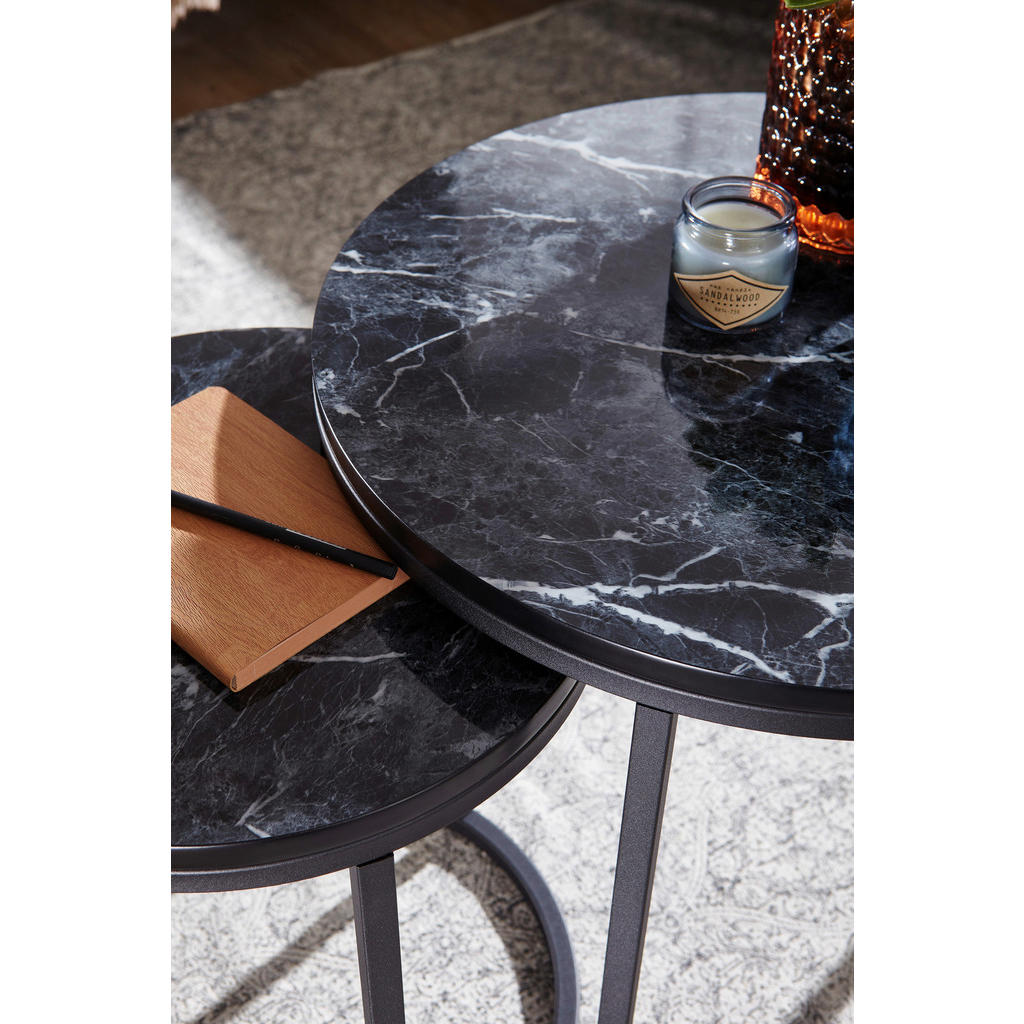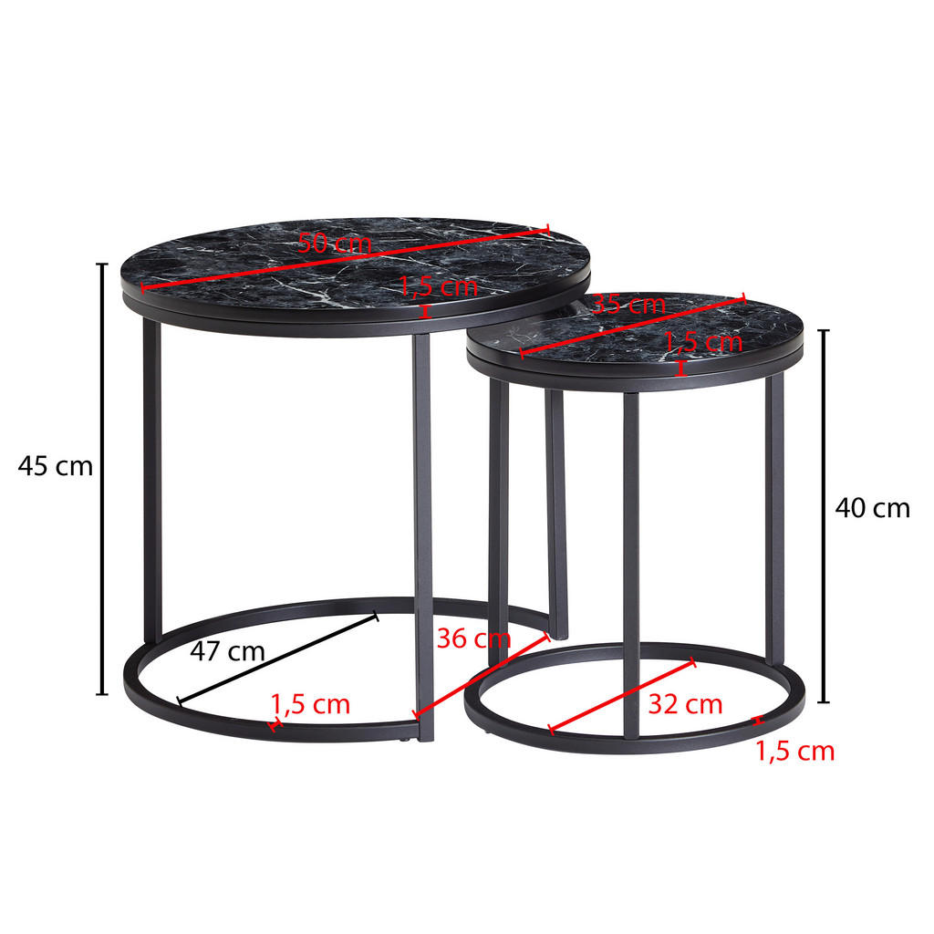 Vstopite v svet prefinjene elegance s setom mizic MID.YOU v prelepem videzu črnega marmorja. Ta dvodelni komplet čudovito dopolni vsak prostor, od urbane dnevne sobe do sodobne spalnice. Z minimalističnim dizajnom, ki sledi najnovejšim trendom notranje opreme in premišljeno izbiro materialov mizici prinašata občutek elegance in razkošja. Kombinacija črne kovine in videza marmorja doda prostoru pridih prestiža, a hkrati ohranja tisto domačo toplino. Mizici se lahko uporabljata skupaj ali ločeno – kot klubski mizici pred kavčem, ob strani naslanjača za odlaganje skodelice kave ali kot elegantni nočni omarici ob postelji. Ko ju ne potrebujete, ju lahko preprosto zložite eno pod drugo in s tem prihranite prostor – idealno za manjša stanovanja ali sodobne garsonjere. Ključne prednosti: Prefinjen videz marmorja – elegantna površina z izrazitim vizualnim učinkom. Pametna postavitev – mizici lahko zložite eno pod drugo in prihranite prostor. Večnamenska uporaba – skupaj ali ločeno, za dnevno sobo, spalnico ali kotiček za kavo. Minimalističen dizajn – sledi sodobnim trendom notranje opreme. Lastnosti: Miza 1: 50/45/50 cm Miza 2: 35/40/35 cm Barva: črna (videz marmorja)