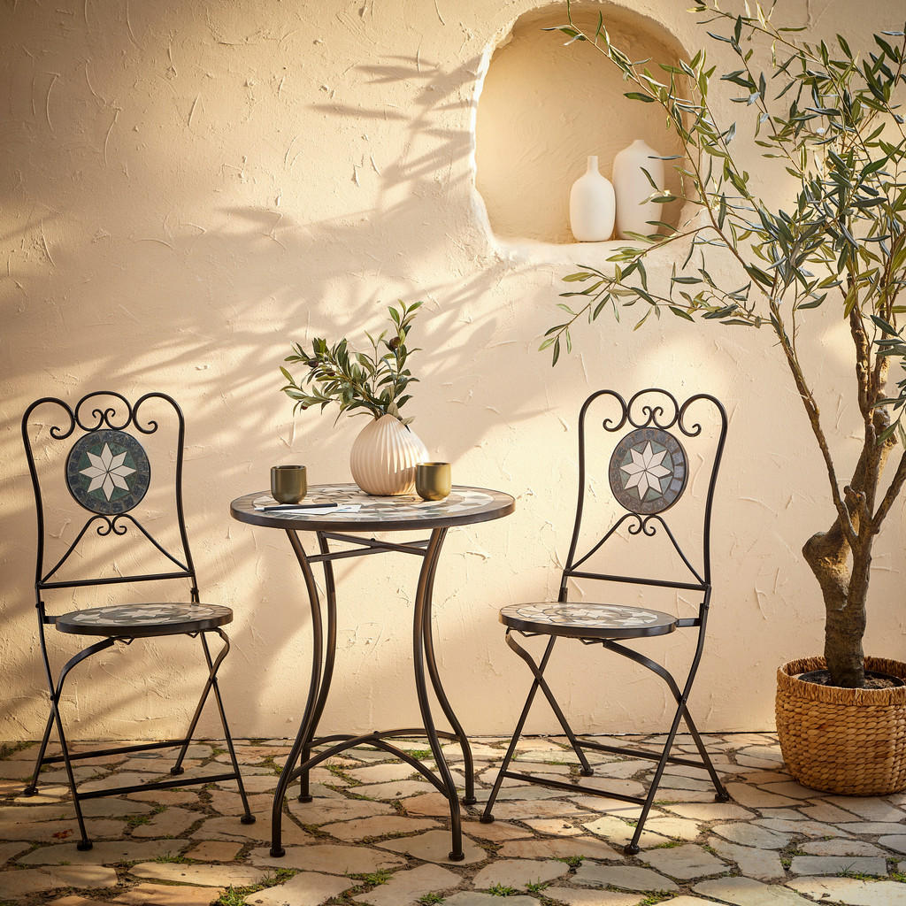 Opremite zunanje prostore s funkcionalnim in udobnim vrtnim pohištvom, tako boste uživali resnično maksimalno. Nabiranje energije na svežem zraku in v dobri družbi bo s tem setom za balkon, ki je del znamke Ambia Garden, še boljše! Gre za popoln set, izdelan iz trpežnih materialov – litega železa. Z njim boste dosegli popolno mešanico funkcionalnosti in sloga. Starinski videz v beli barvi vas bo preprosto navdušil na prvi pogled. Set je sestavljen iz praktične mize in dveh stolov, s katerimi si lahko ustvarite svojo poletno oazo za druženje. Dimenzije mize: 70x76x70 cm Dimenzije stola: 42x92x49,5 cm