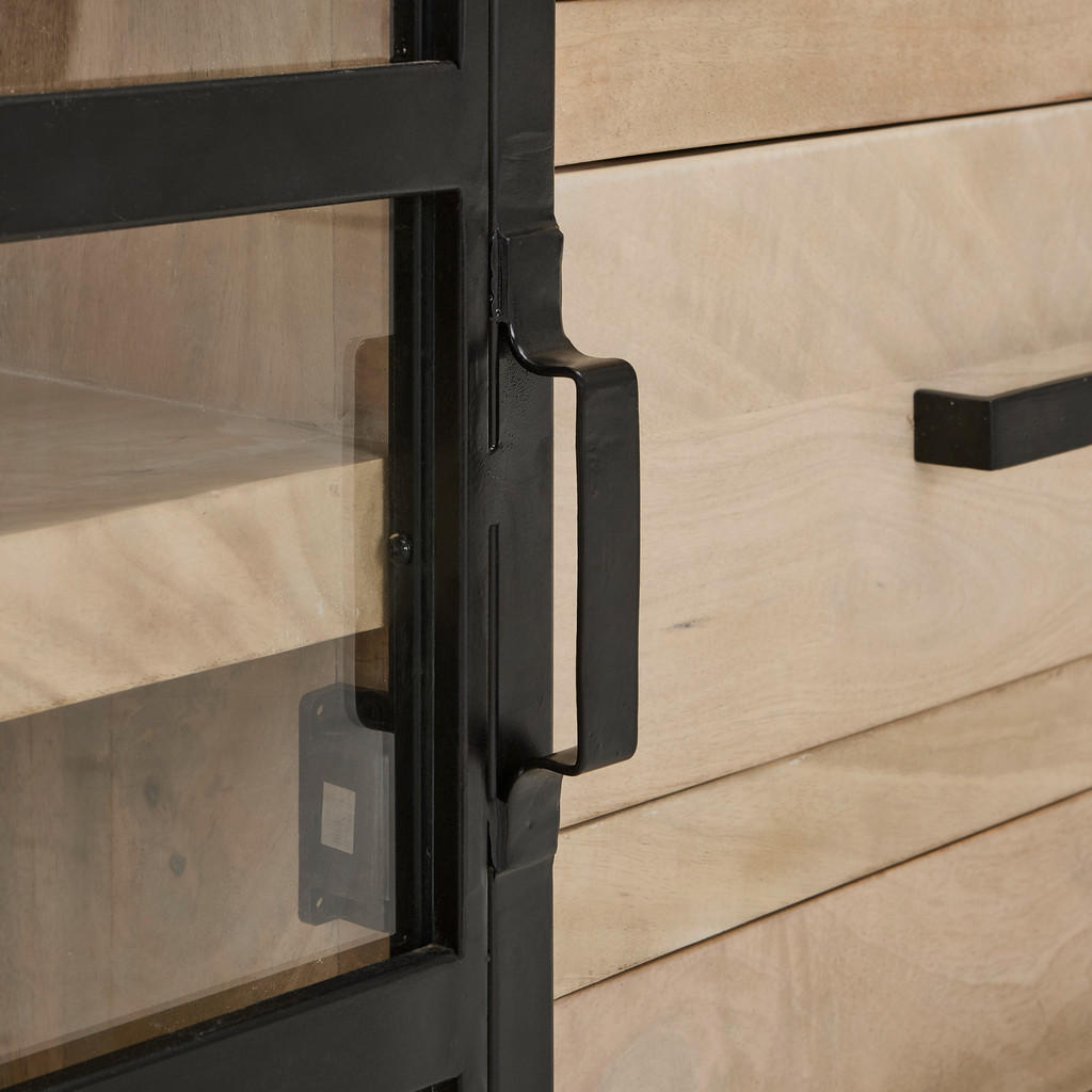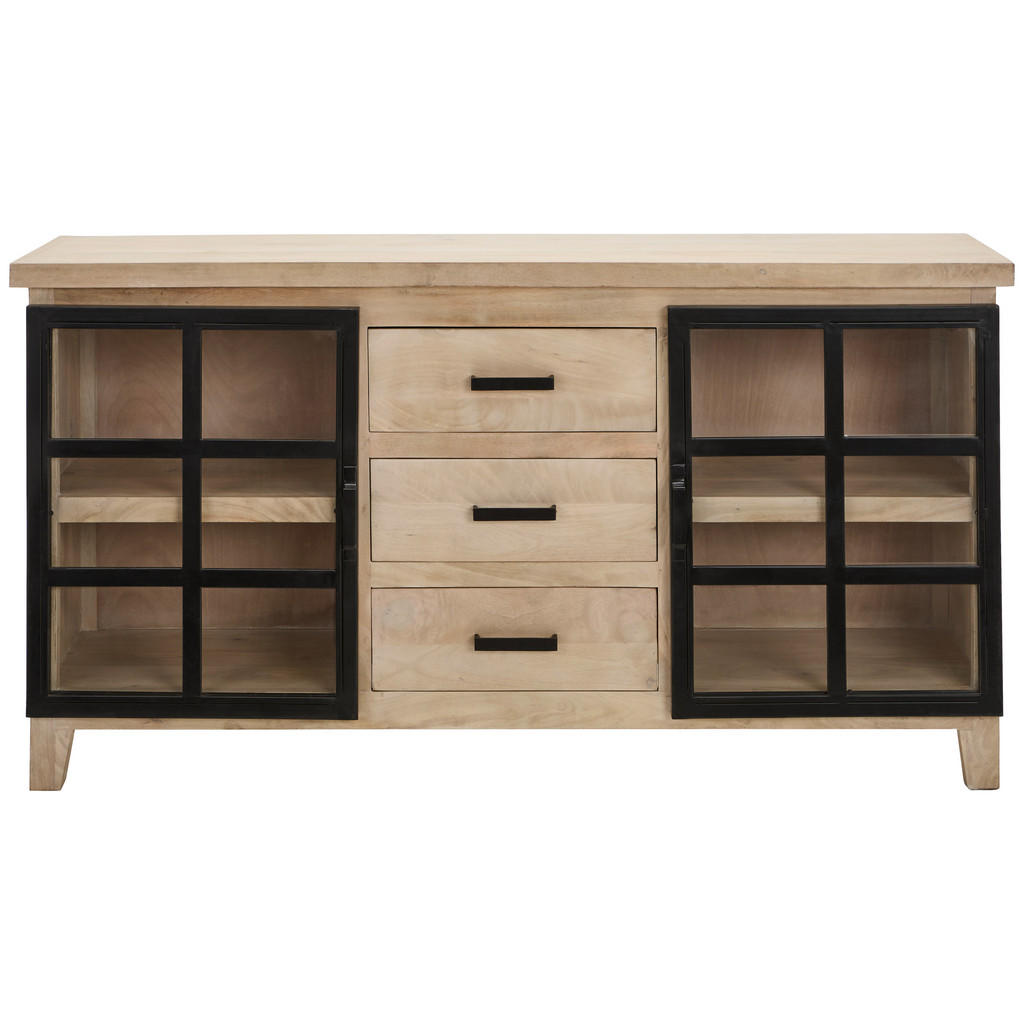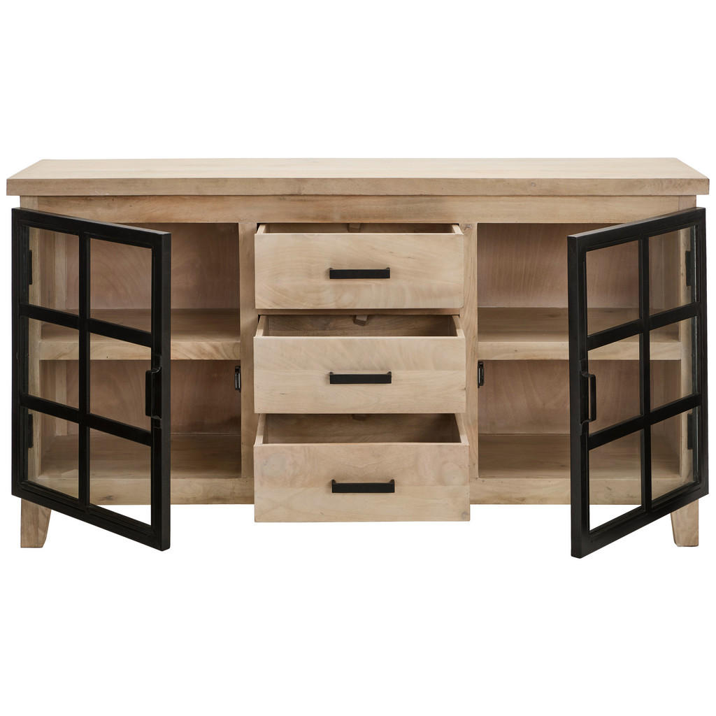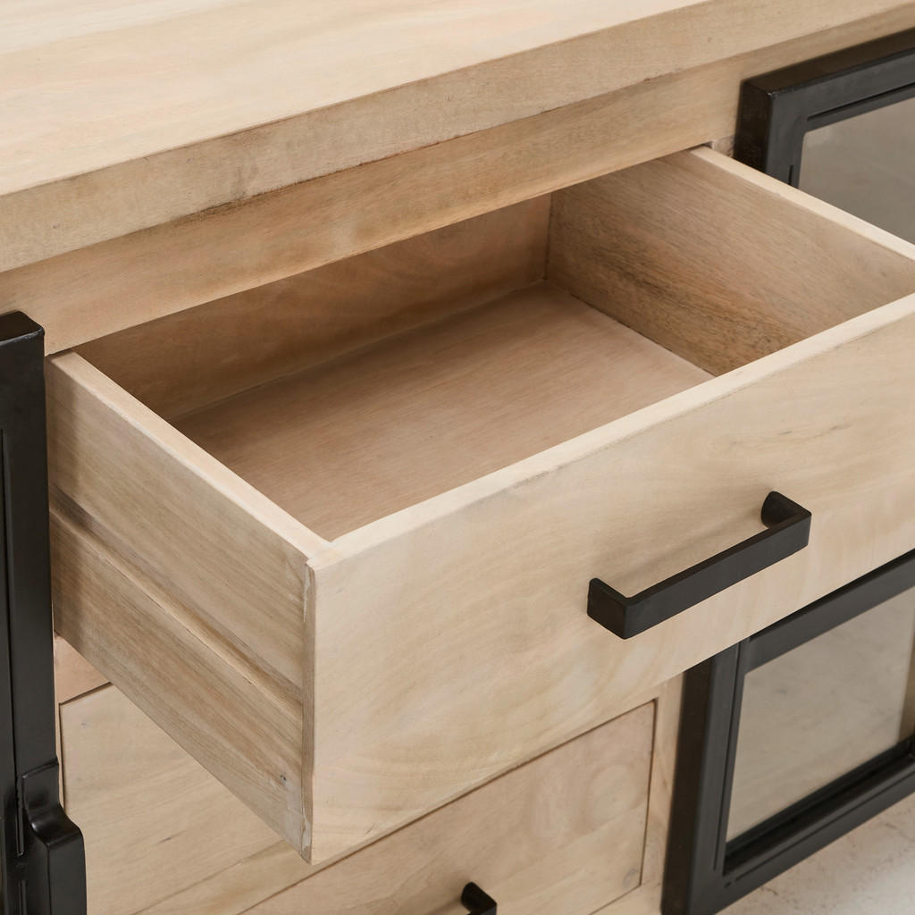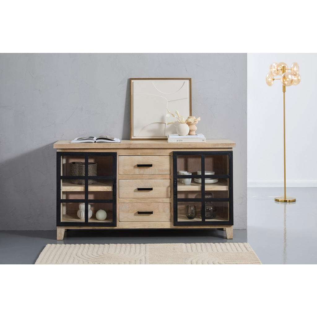 Široka komoda je eleganten in robusten kos pohištva, ki združuje funkcionalnost in estetski videz. Njene dimenzije 160 × 85 × 40 cm omogočajo dovolj prostora za shranjevanje različnih predmetov. Izdelana je iz masivnega mangovega lesa iz Indije, kar ji zagotavlja dolgo življenjsko dobo in stabilnost. Naravna barva lesa in polirana površina ustvarjata topel in prijeten ambient v prostoru. Komoda stoji na stabilnih kovinskih nogah v črni barvi z višino 10 cm, ki dopolnjujejo elegantno obliko. Opremljena je s tremi prostornimi predali s komfortnim izvlekom ter dvema drsnima vratoma za enostaven dostop do notranjosti. Vključeni so tudi enoležni notranji polici za optimalno organizacijo prostora, ki prenesejo do 8 kg na polico. Komoda je ročno izdelana, kar zagotavlja visoko kakovost in edinstven videz vsakega kosa. Za čiščenje priporočamo uporabo primernih sredstev za nego lesa, kar ohranja naravni izgled in površino komode. Zaradi premišljene konstrukcije in kombinacije lesa, kovine in stekla komoda popestri vsako dnevno sobo ali jedilnico. Ključne prednosti: Eleganten naravni videz Mangovega lesa s črnimi detajli 3 predali s funkcijo komfortnega izvleka in 2 police – optimalno shranjevanje 2 vrata tipa drsna – prihranek prostora Ročno izdelana – unikatna obdelava lesa Enostavno čiščenje – priporočena uporaba primernega negovalnega sredstva za les Lastnosti: